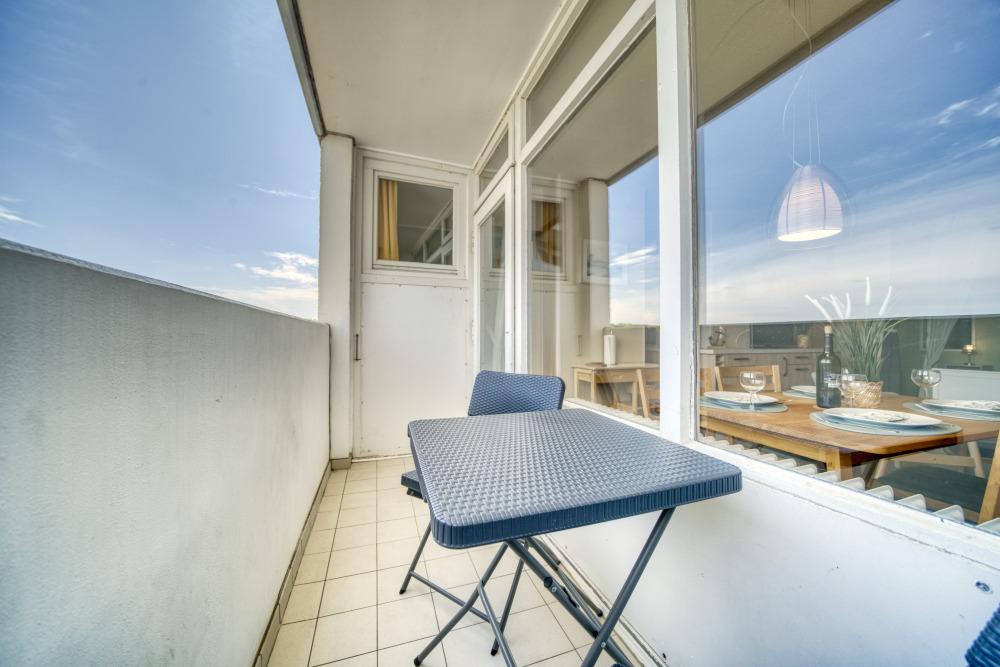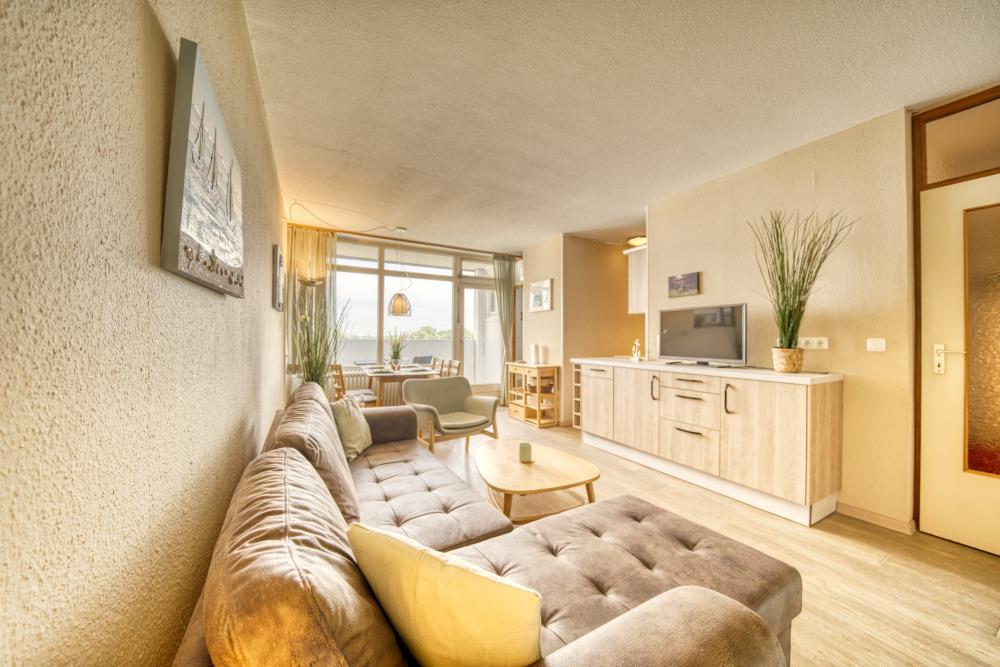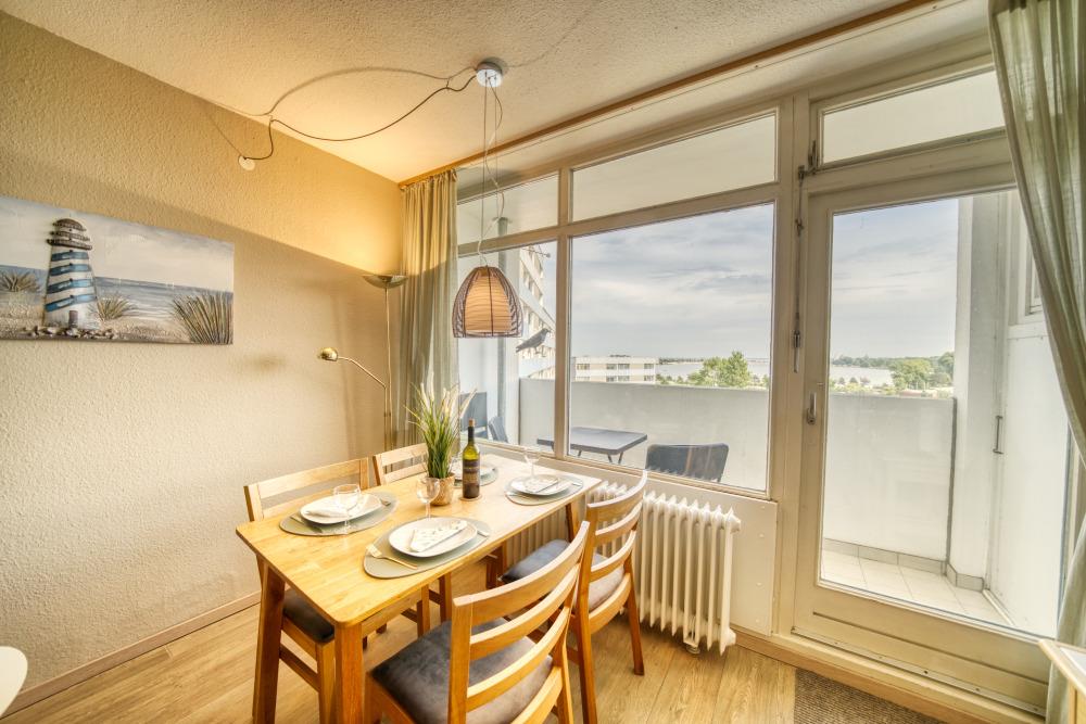 Diese charmante Ferienwohnung in Haus M auf der 6. Etage bietet auf 45?m² Wohnfläche ausreichend Platz für bis zu 4 Personen – ideal für Familien oder Paare mit Kindern. Besonders hervorzuheben ist der Balkon zur Ostseite, von dem Sie einen wunderschönen Blick auf den Binnensee in Richtung Yachthafen genießen können.