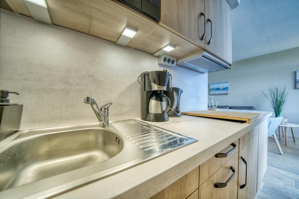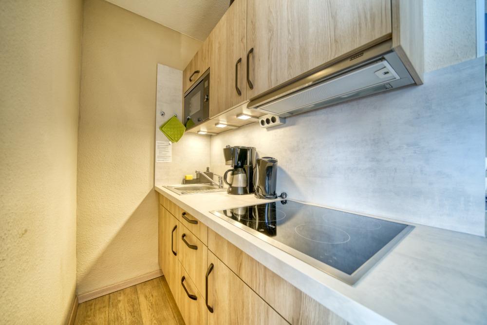 Gut ausgestattete Küche mit Ceranherd, Geschirrspüler, Mikrowelle, Kühlschrank mit Gefrierfach, Wasserkocher, Toaster und Filterkaffeemaschine