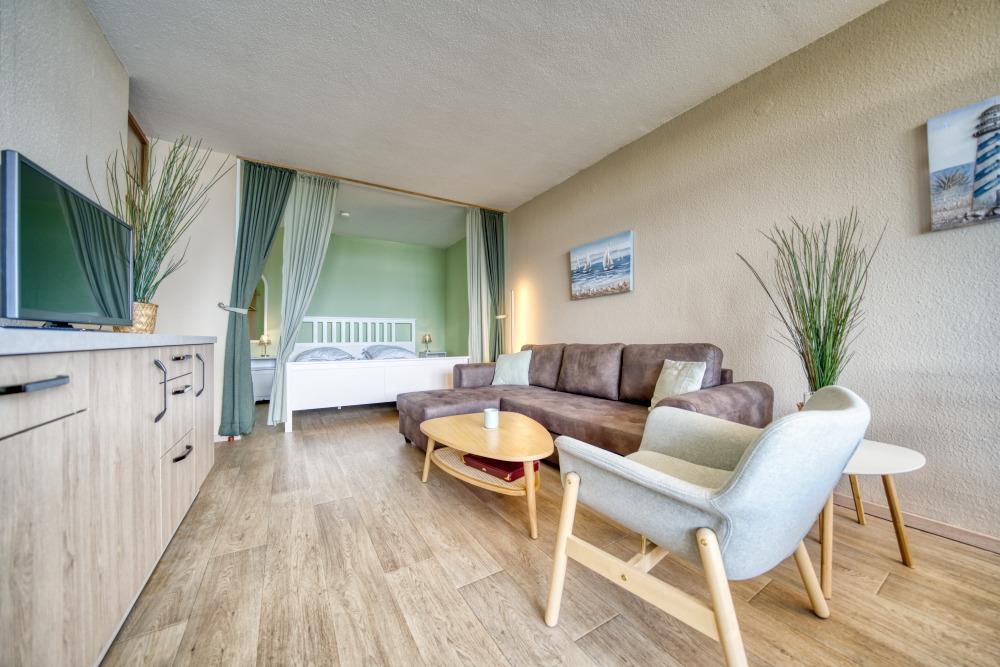 Wohn-Schlafbereich mit Doppelbett, gemütlicher Eckcouch, Esstisch vor dem Balkon und Flachbild-TV