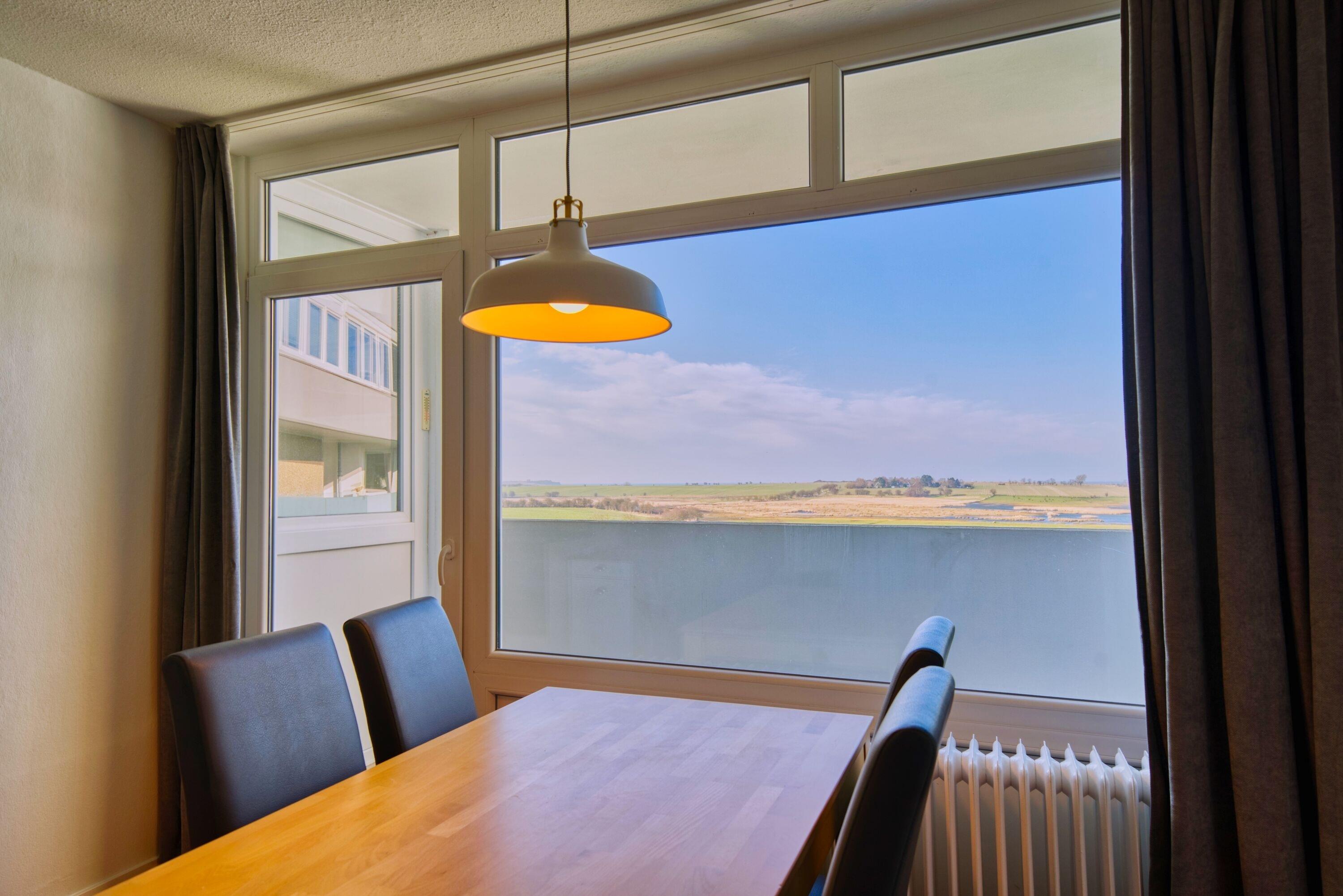 Moderne und renovierte Ferienwohnung im Haus M Ferienpark, 6. Etage, mit Balkon in Südwestlage und herrlichem Blick über die Salzwiesen bis zur Ostsee. Genießen Sie farbenfrohe Sonnenuntergänge und beobachten Sie die Natur direkt vom Balkon aus.
