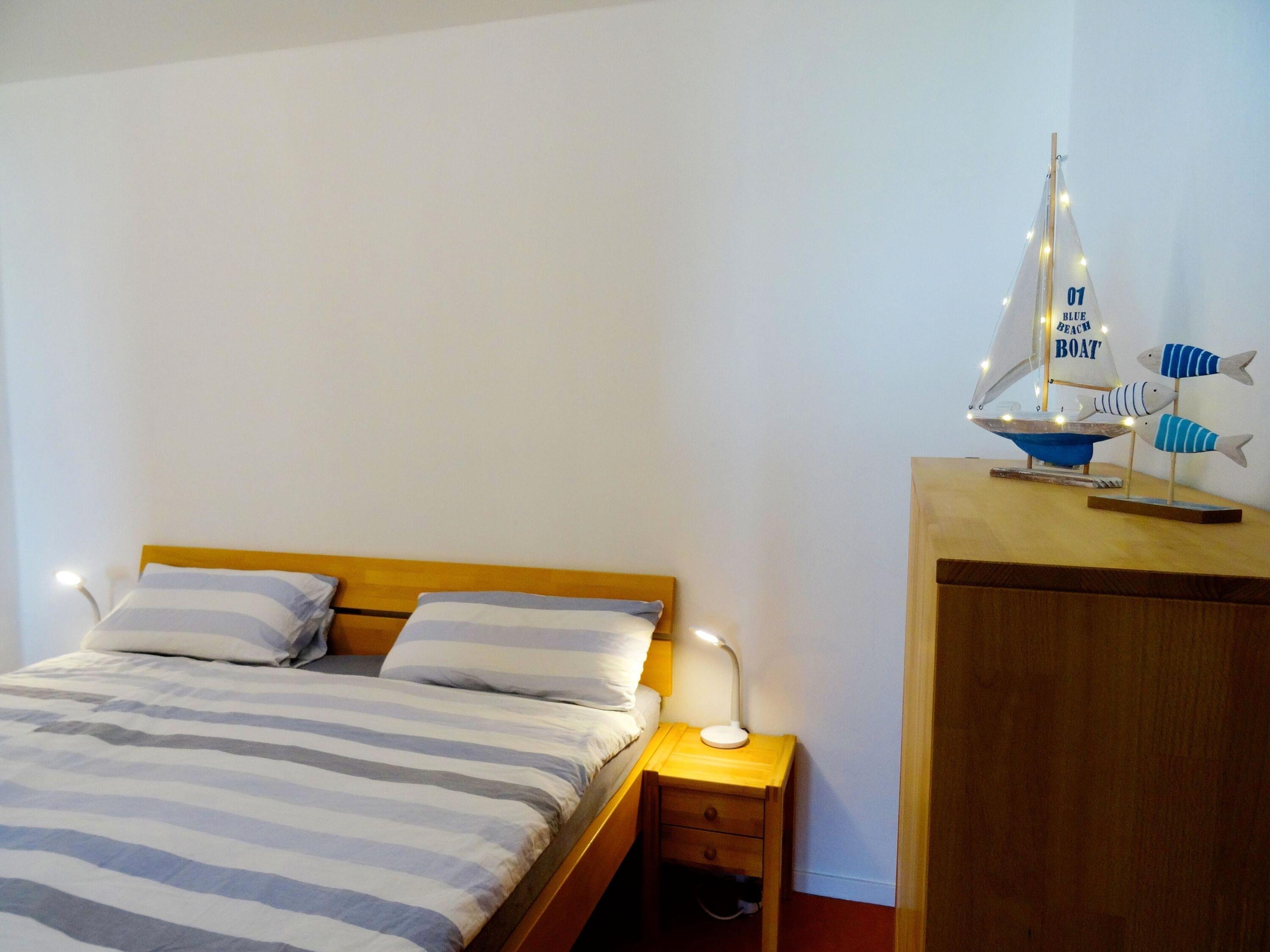 Elternschlafbereich mit hochwertigen Matratzen, vom Wohnraum durch Wand abgetrennt