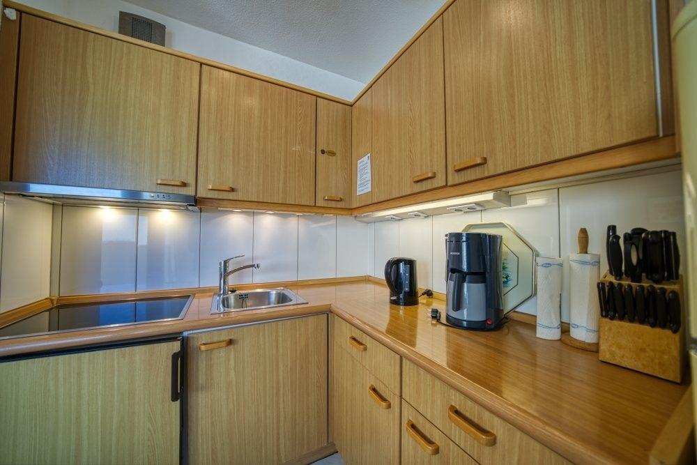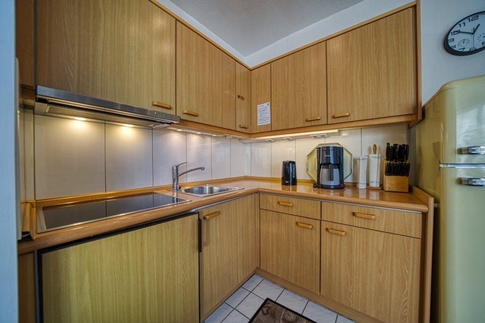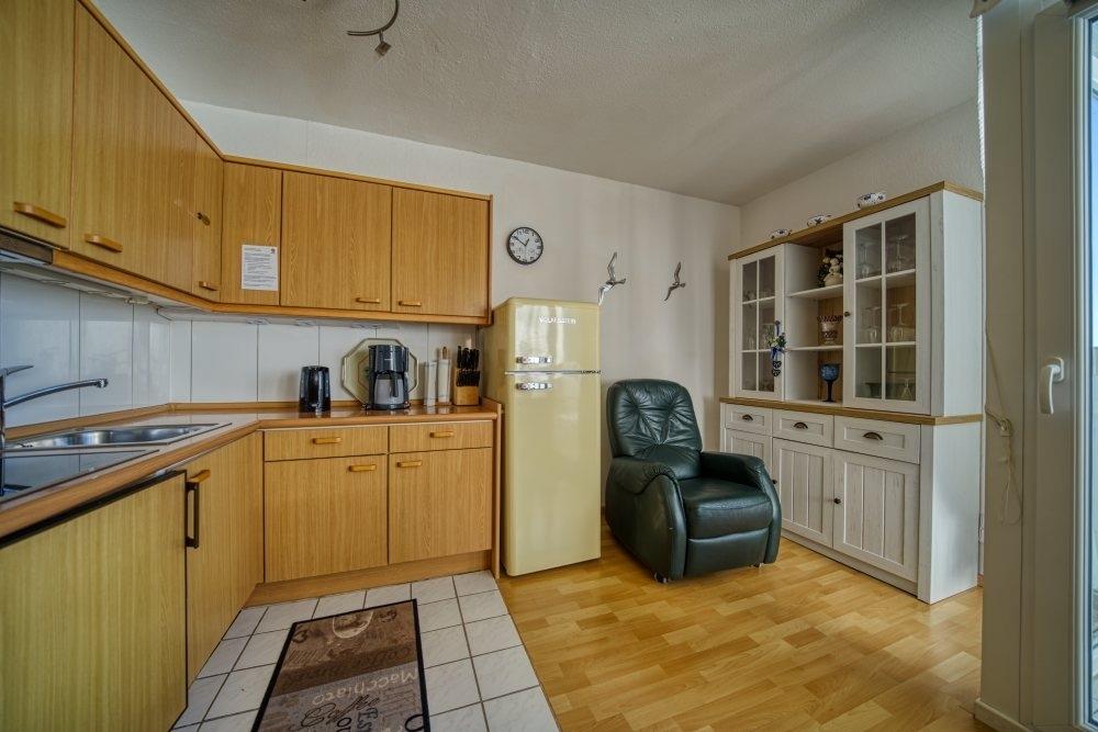 Offene, komplett eingerichtete Küche mit Kühlschrank und Gefrierfach, 4-Plattenherd