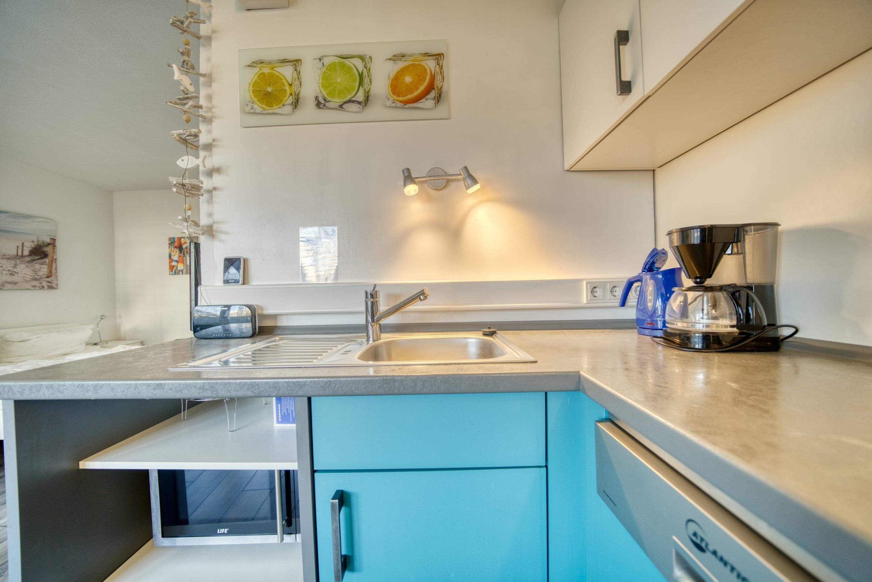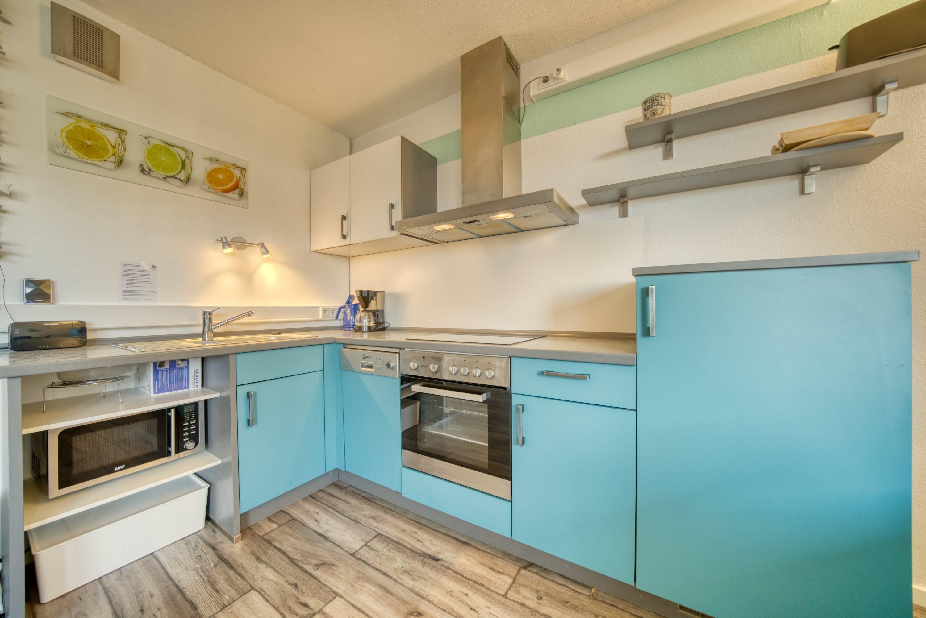 Komplett eingerichtete Küche mit Kühlschrank, Gefrierfach, Backofen, 4-Platten-Cerankochfeld, Geschirrspüler, Kaffeemaschine, Wasserkocher, Toaster und Geschirr