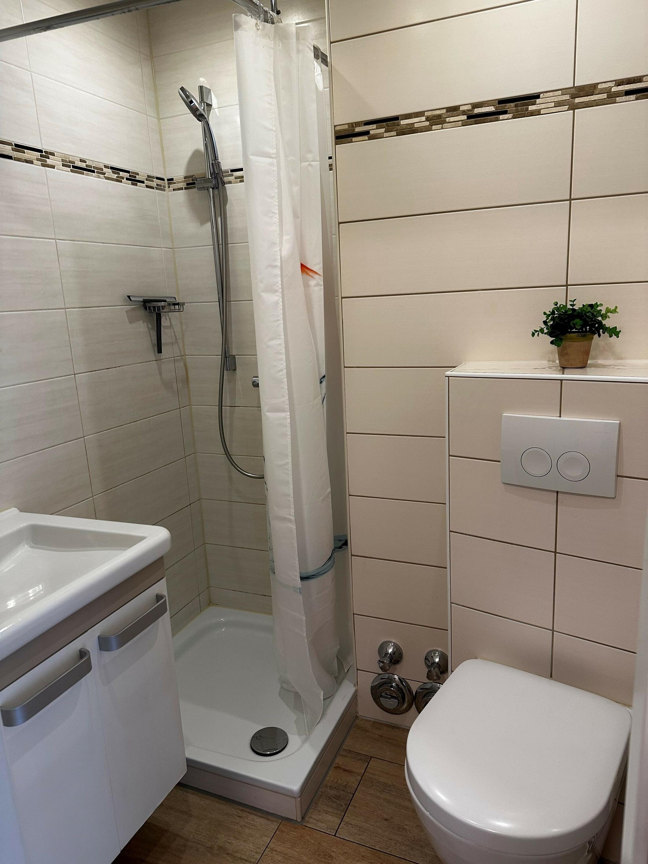 Bad: Dusche (niedrige Einstiegshöhe), Handtuchheizkörper, Fön