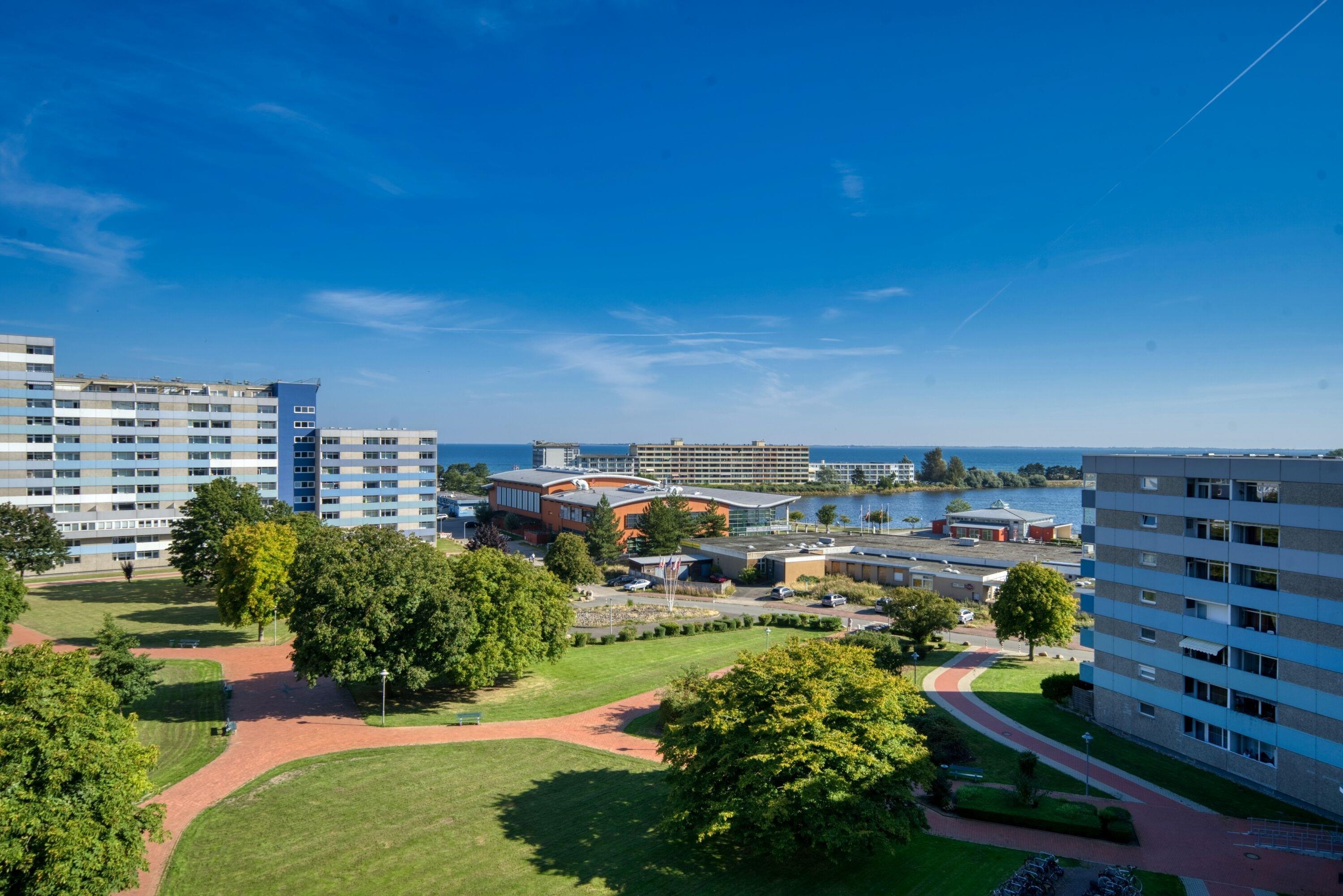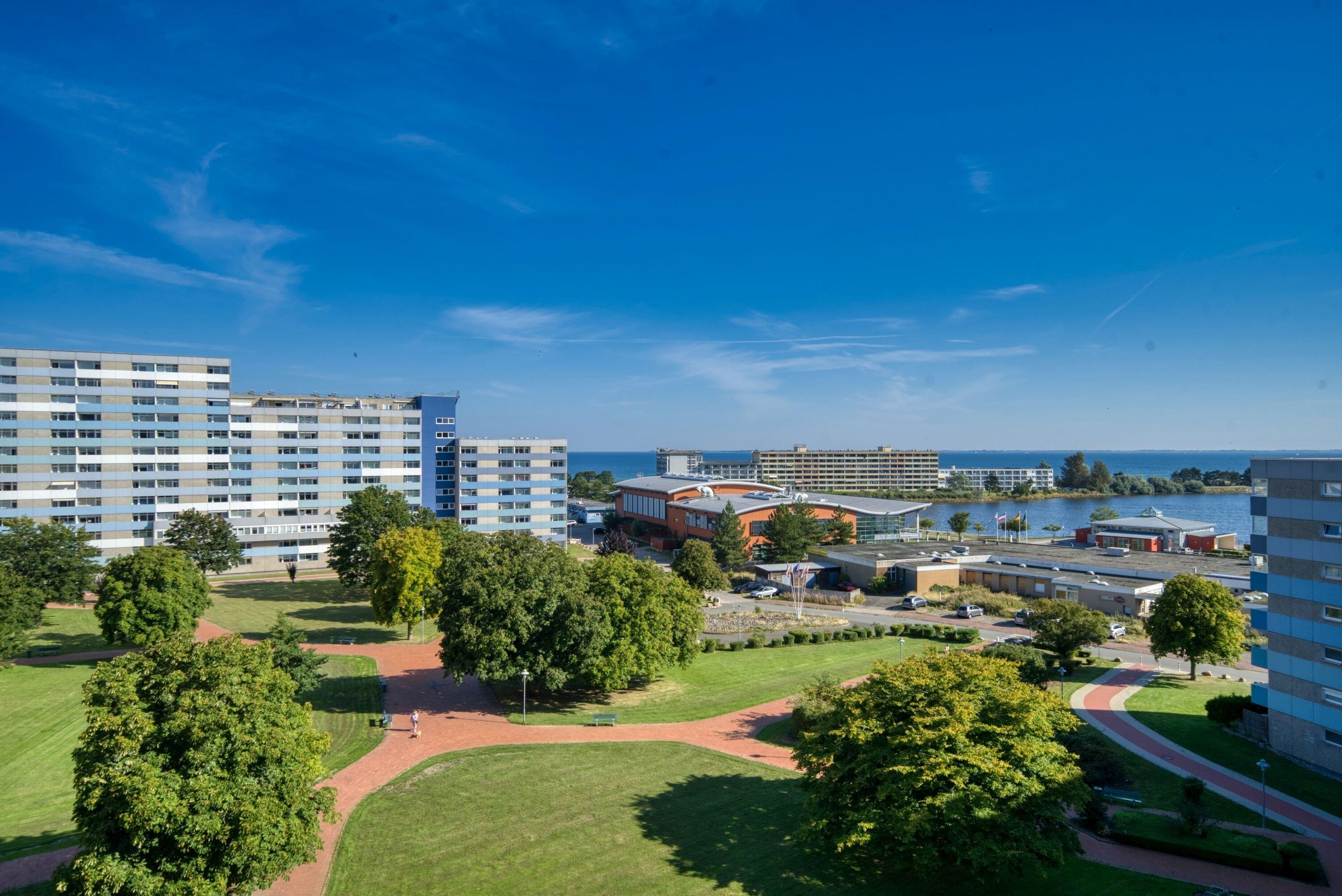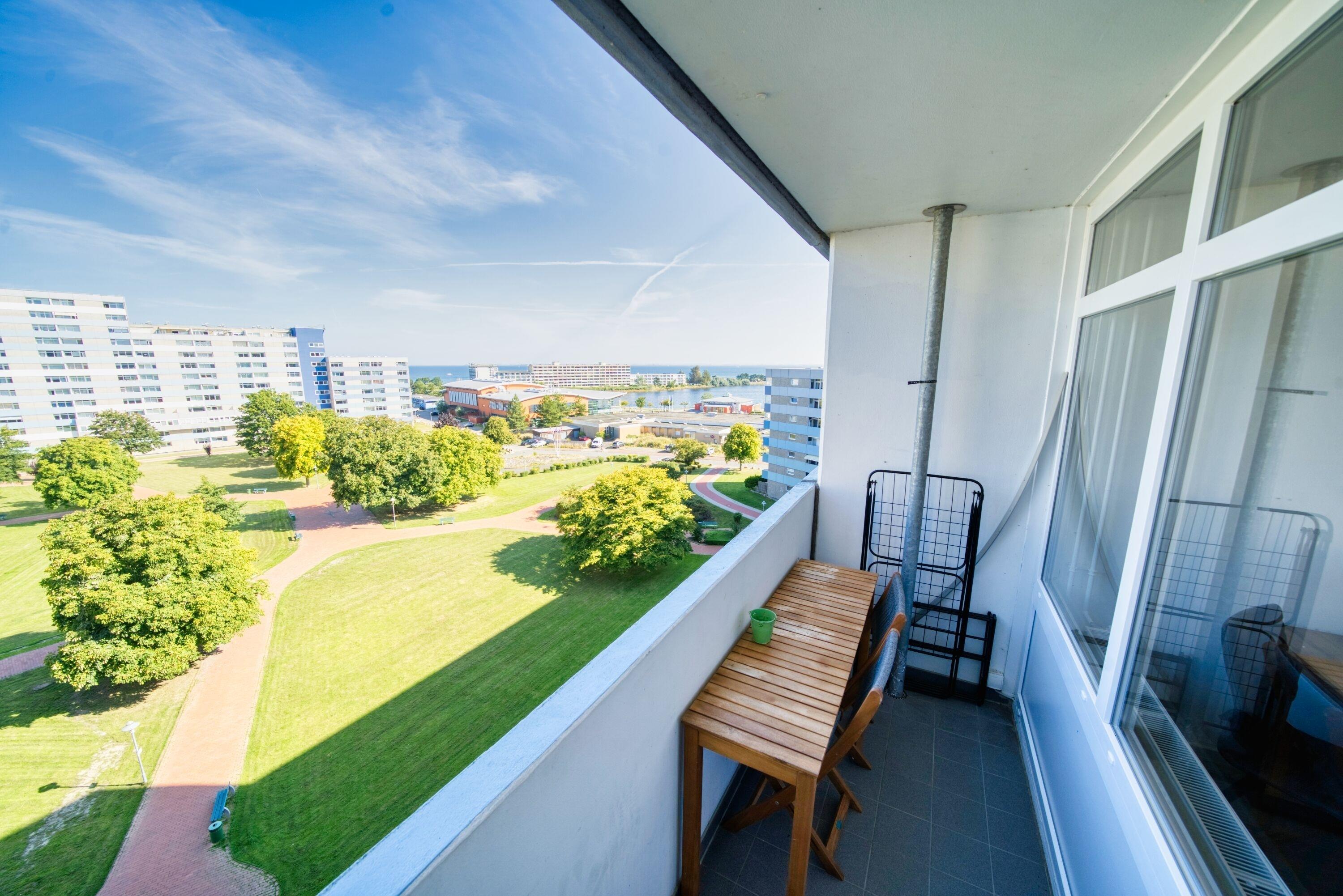 Die Wohnung liegt im Haus N im Ferienpark, in der 7. Etage, mit Balkon zum Innenhof, der einen schönen Blick auf die Grünanlagen und die Ostsee Richtung Fehmarn bietet.