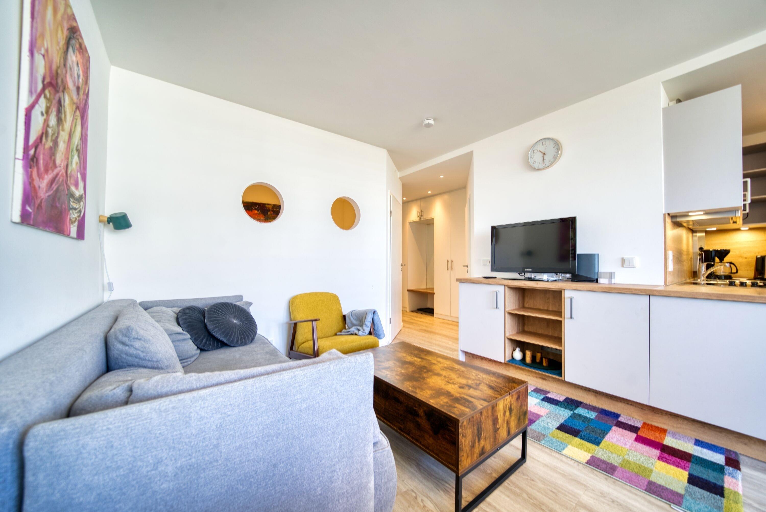 Wohn-Esszimmer: Sofa mit Schlaffunktion, moderner Flat-TV, Radio