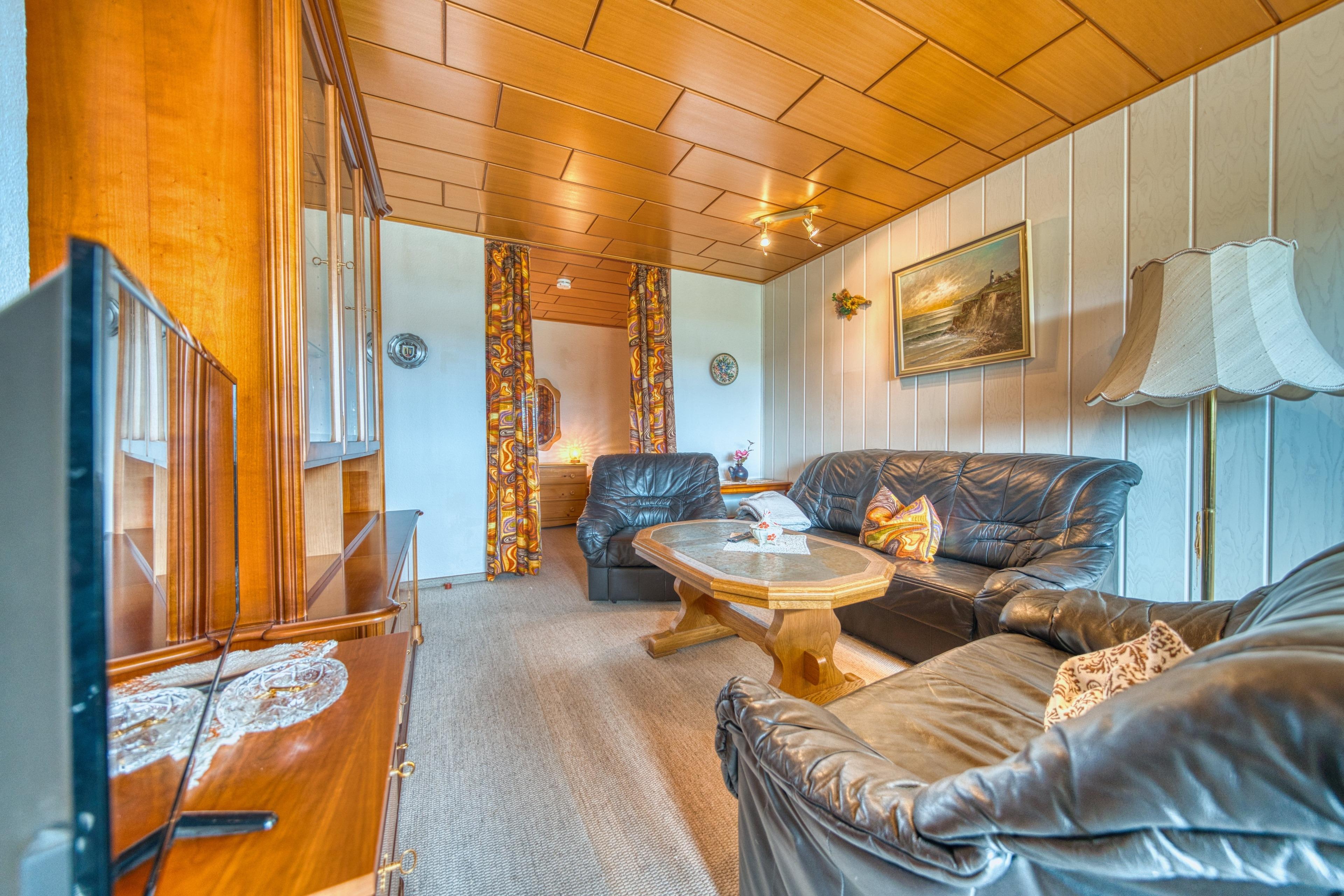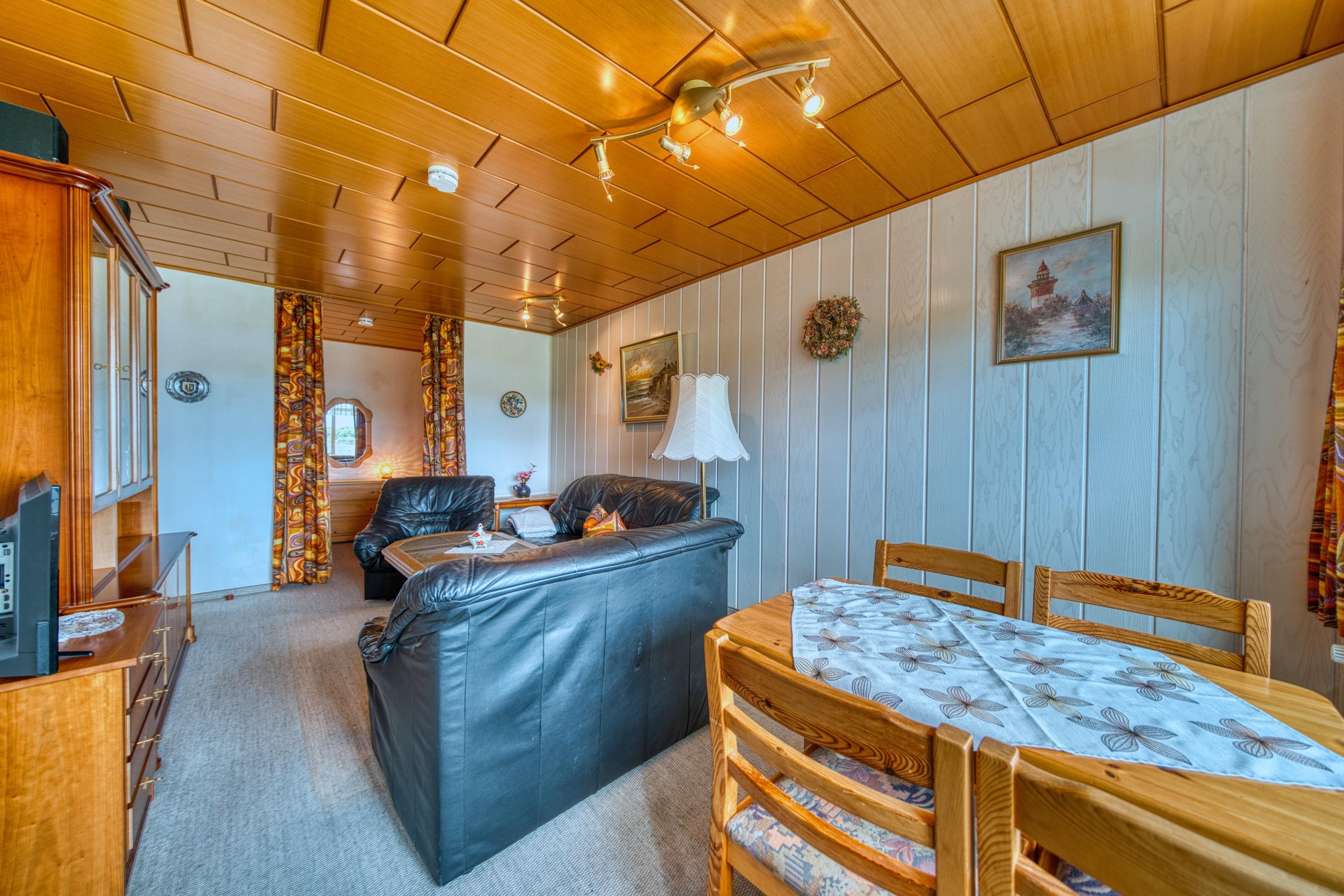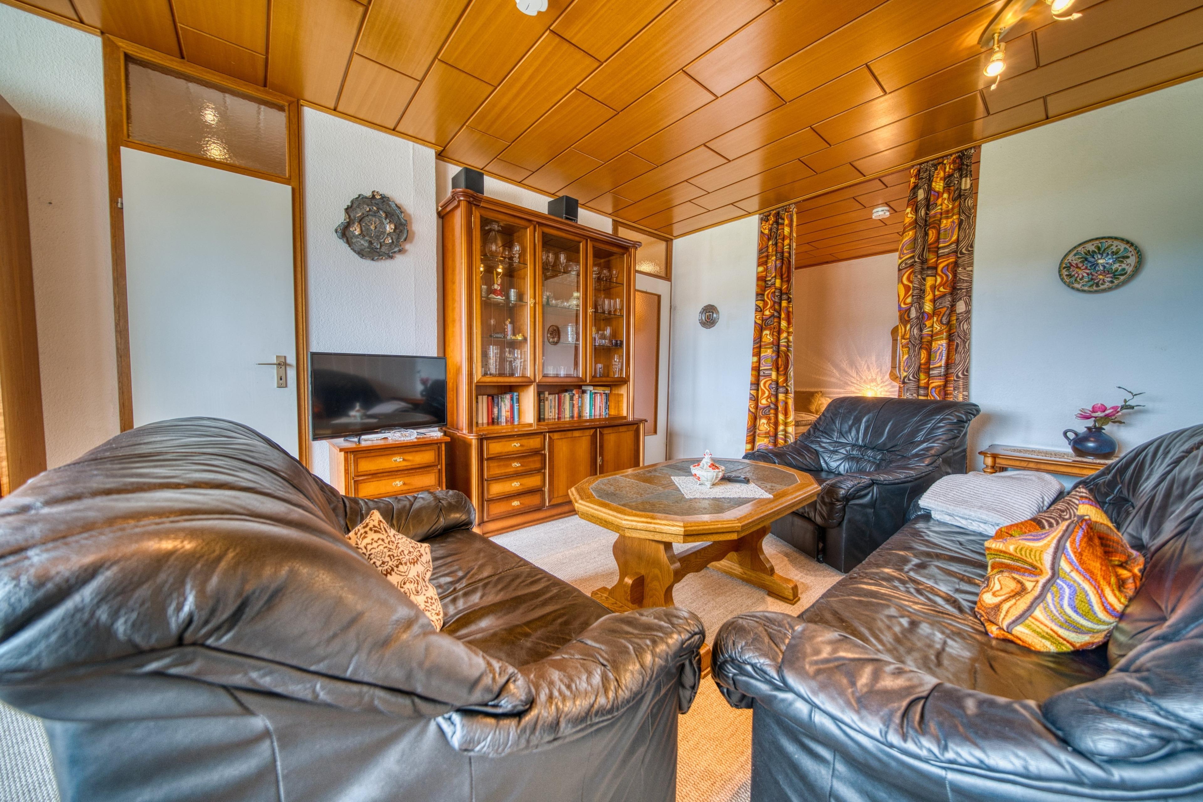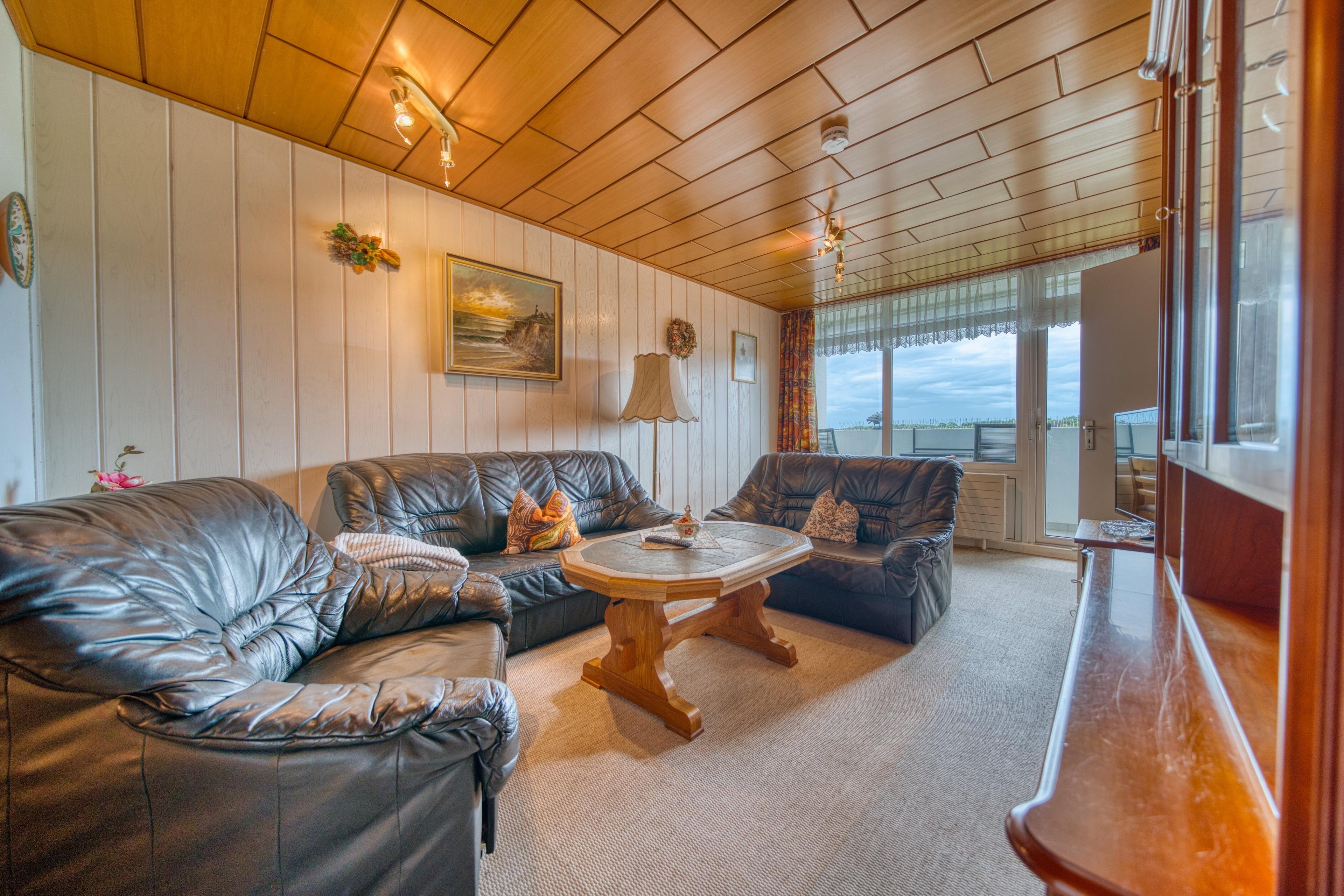 Einen gemütlichen Wohnbereich mit bequemen Leder-Couches – perfekt zum Entspannen nach einem erlebnisreichen Tag.
