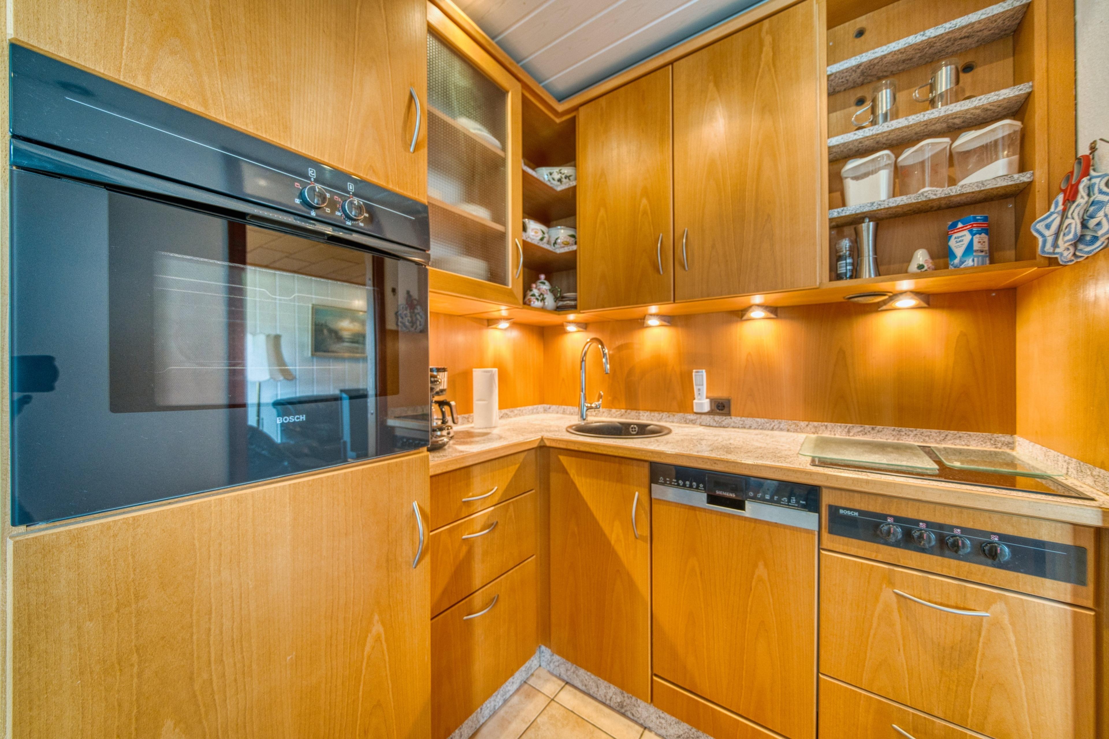Eine voll ausgestattete Küche mit Backofen, Cerankochfeld, Geschirrspüler sowie allen wichtigen Küchenutensilien.