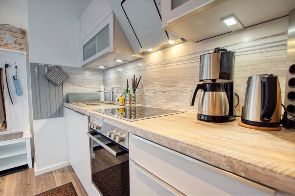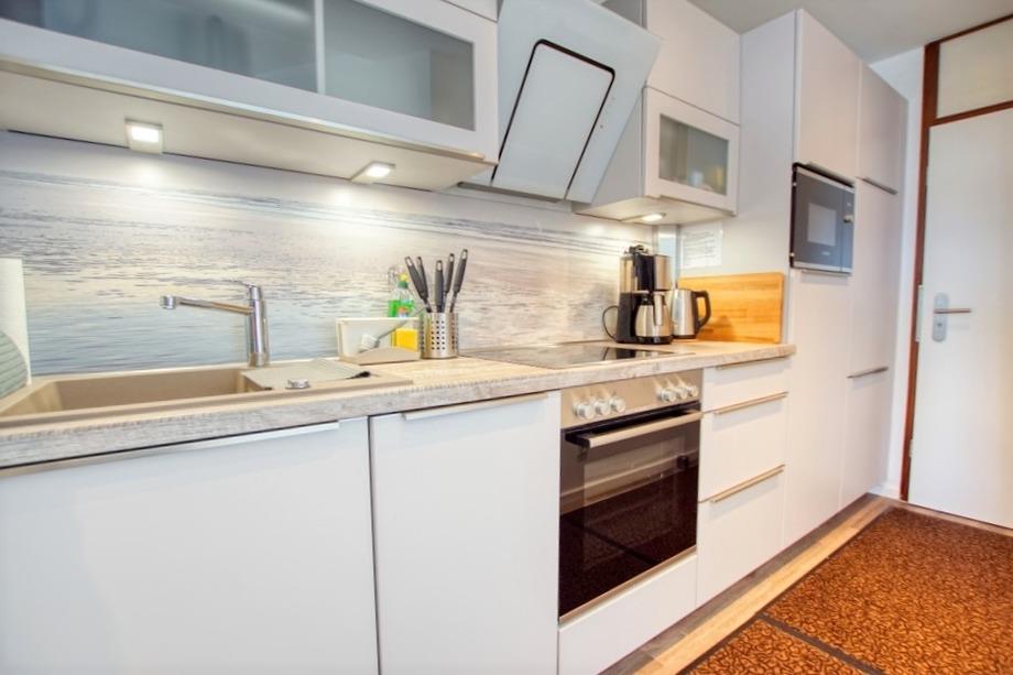 Voll ausgestattete Küche mit Kühlschrank inkl. Gefrierfach, Ceranfeld, Backofen, Mikrowelle und viel Stauraum
