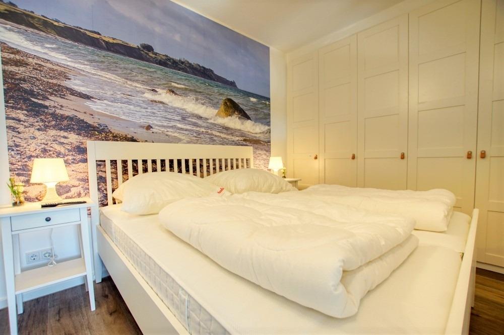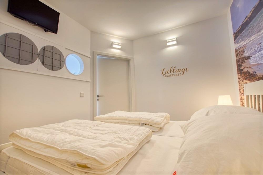 Separater Schlafraum mit Doppelbett, großem Kleiderschrank und Fernseher