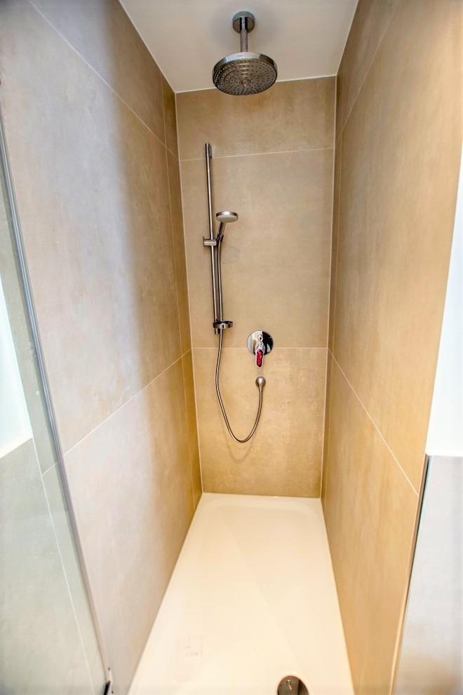 Modernes Bad mit WC und großer Regendusche mit flachem Einstieg