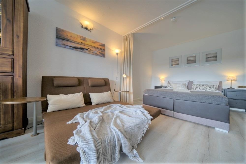 Elternschlafbereich mit Boxspringbett, durch Vorhang abtrennbar