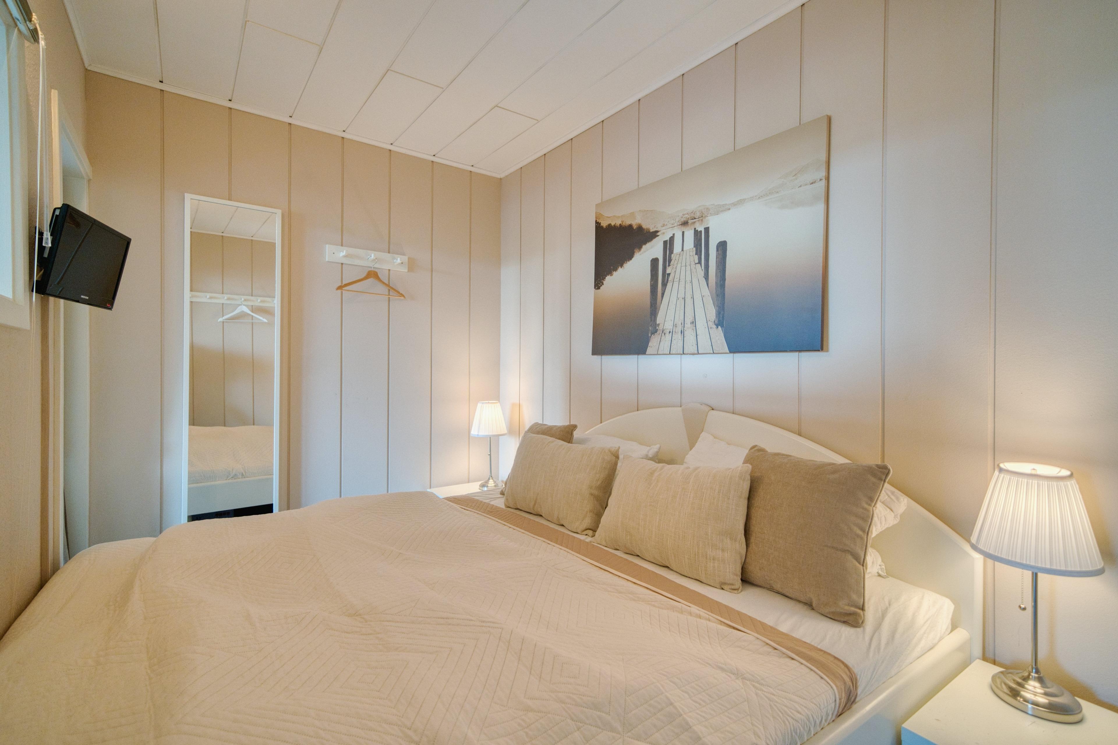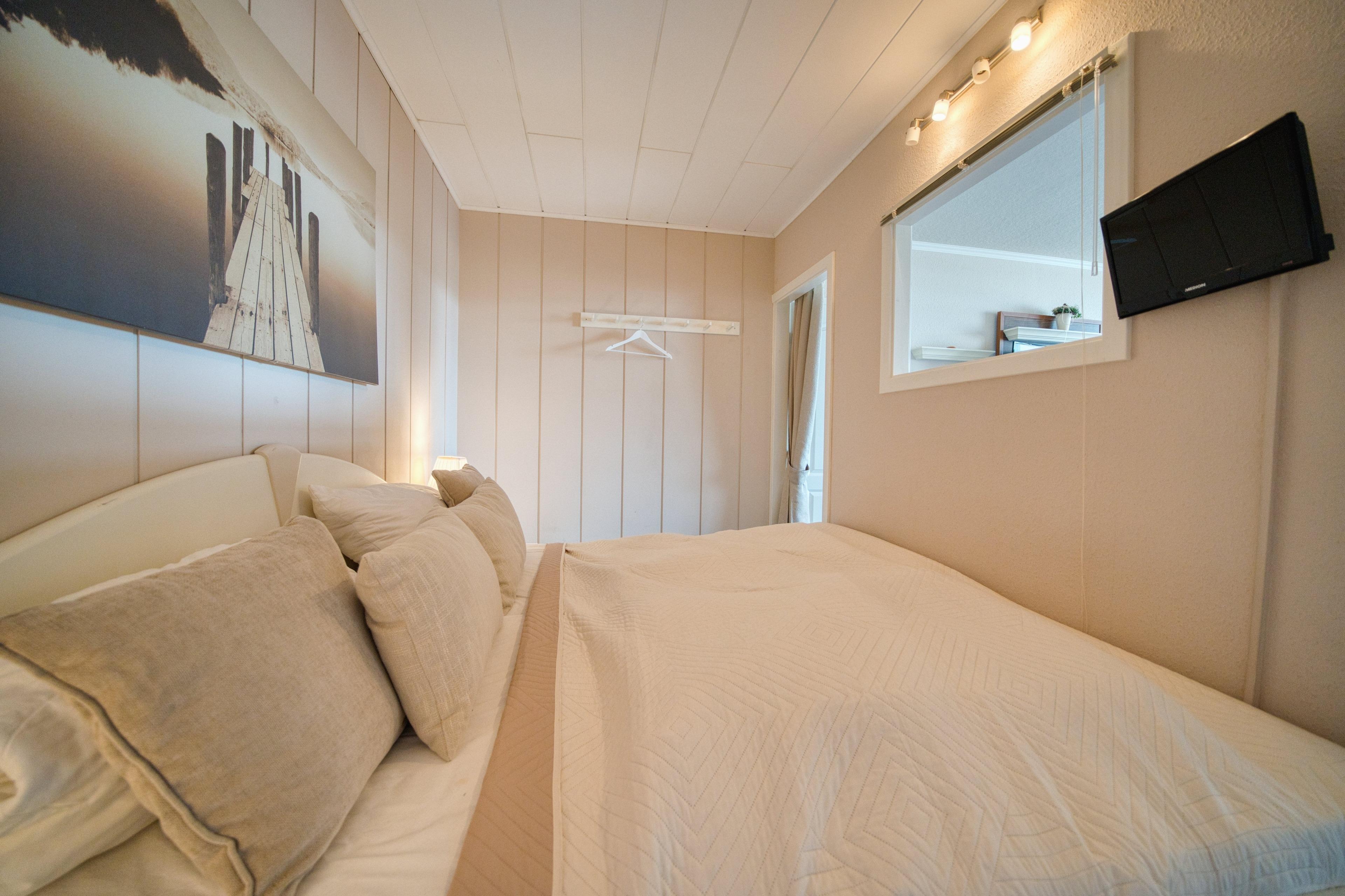 Separates Schlafzimmer mit Doppelbett, Teppichboden und zusätzlichem Fernseher (Der Schlafbereich ist noch mit Teppichboden ausgestattet)