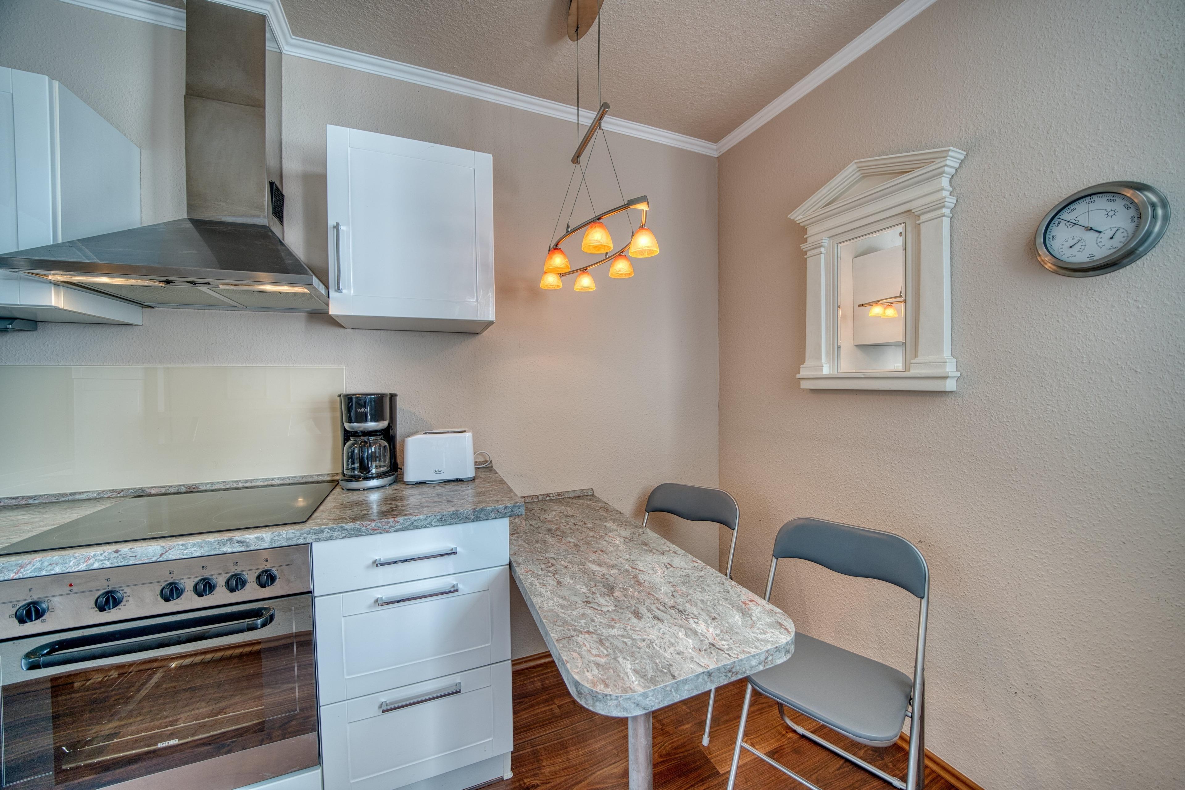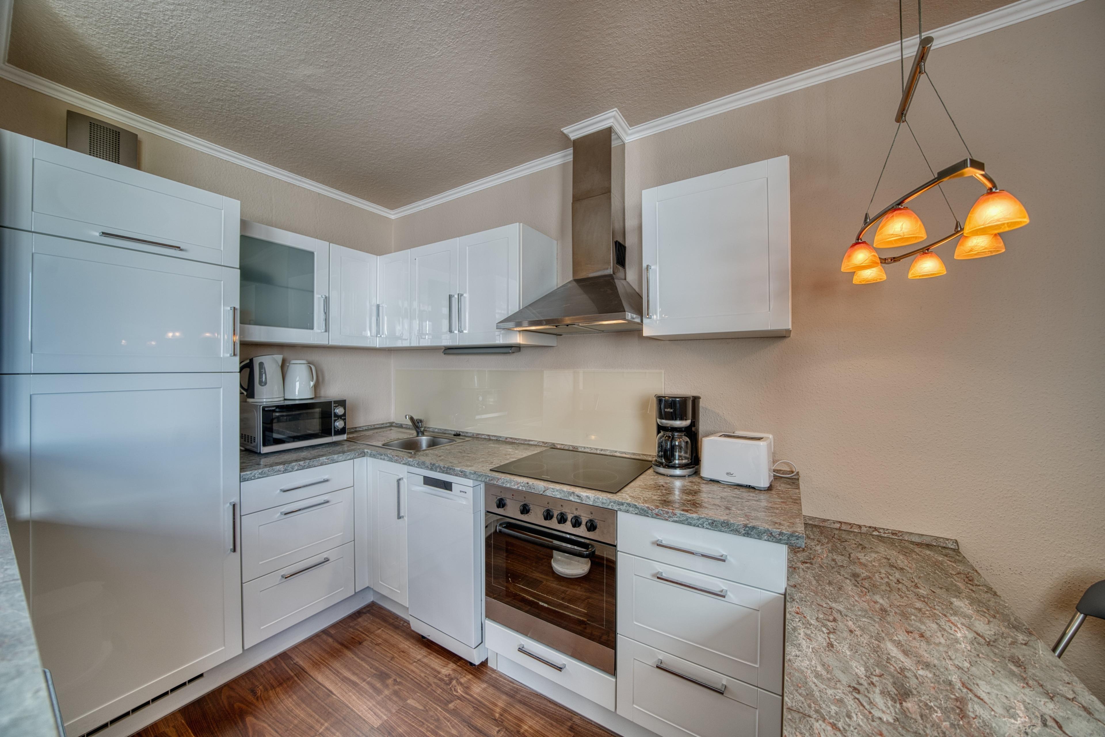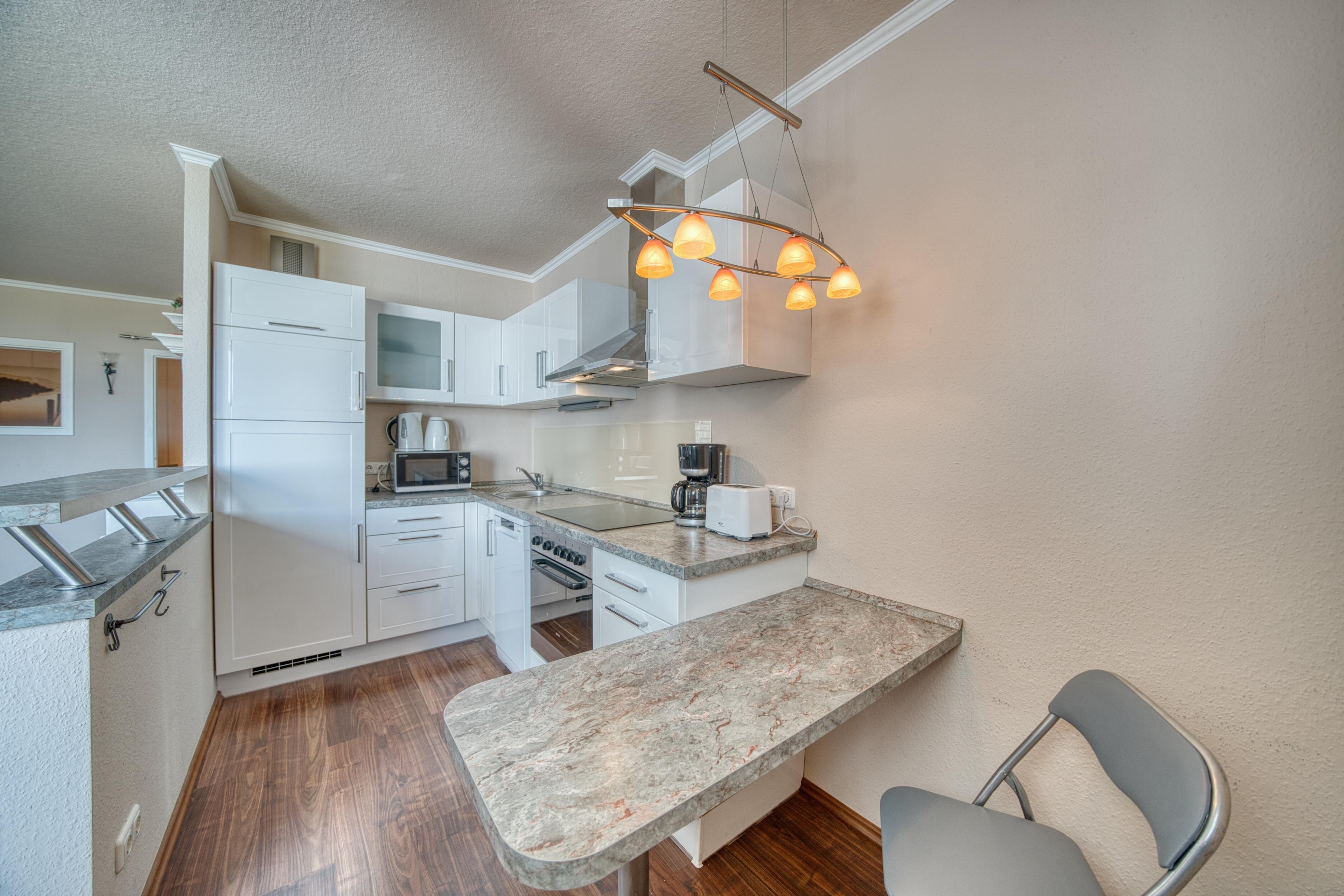 Offene Küche mit Tresen, 4-Platten-Ceranfeld, Kühlschrank und Geschirrspüler