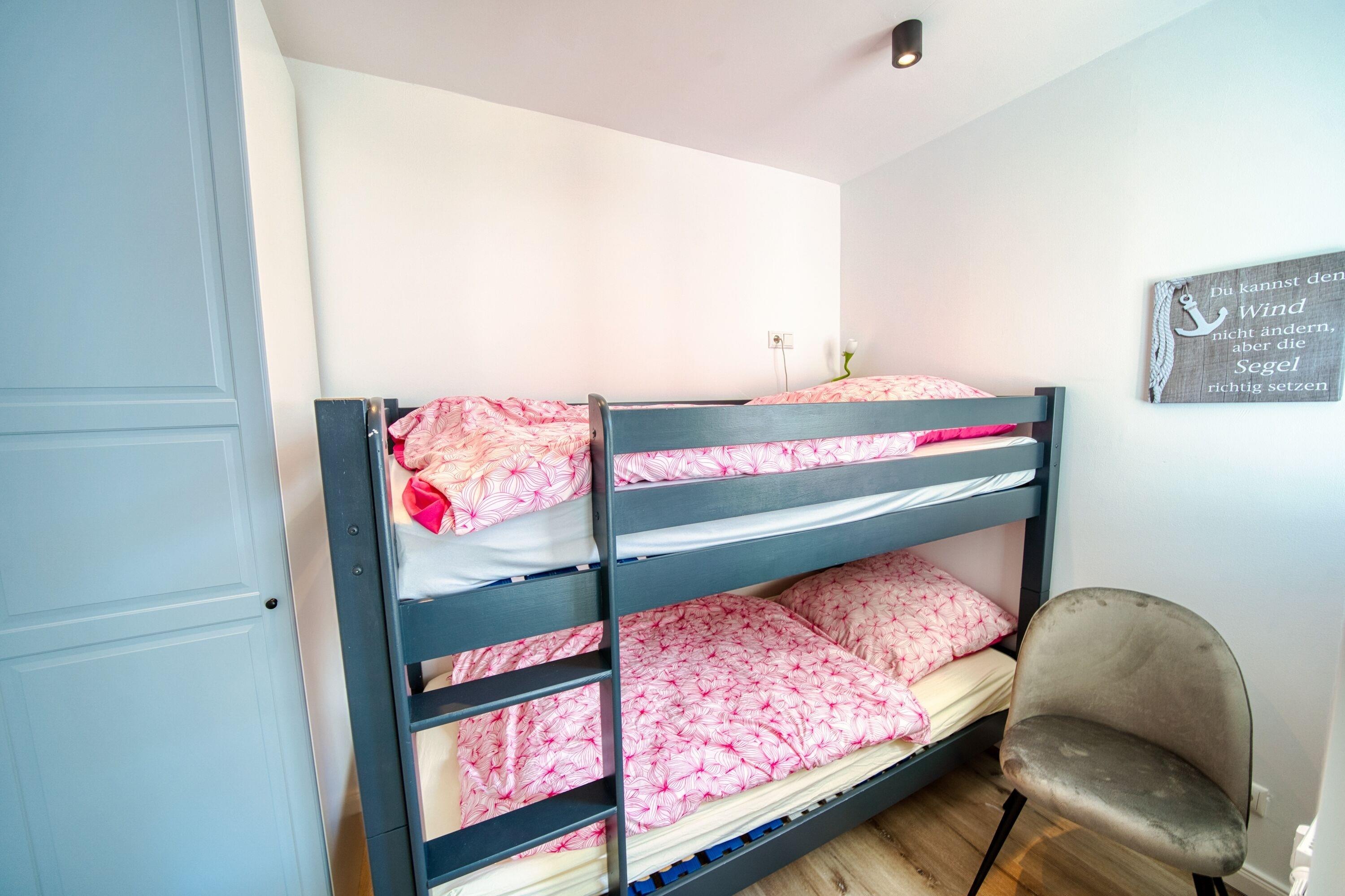 Wohnzimmer mit Schlafsofa – zusätzliche Schlafgelegenheit für bis zu 5 PersonenSchlafzimmer mit Doppelbett und TVKinderzimmer mit Etagenbett
