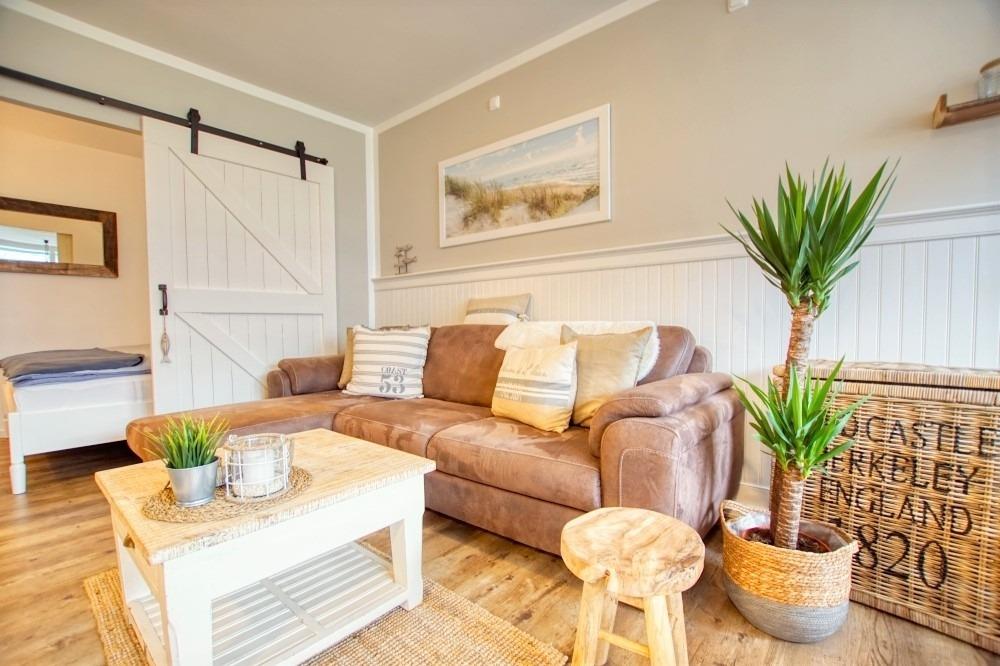 Offener Wohnbereich mit gemütlichem Ecksofa, Vinylboden und stilvoller Dekoration im Beachstyle