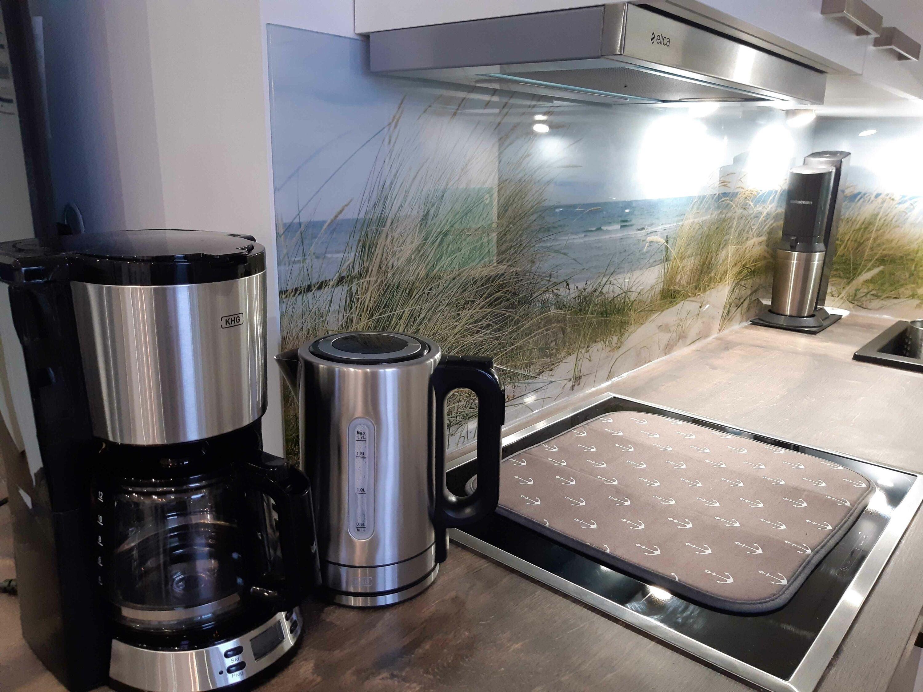 ~ neue komplett eingerichtete EBK mit 4er-Induktionskochfeld, Backofen, Kühlschrank mit ***Gefrierfach, Geschirrspülmaschine, Kaffeemaschine mit Timer, Wasserkocher mit Temperaturwahl, Soda-Stream (bitte eigenen Gaszylinder mitbringen), Toaster mit Brötchenaufsatz, Sandwich-Maker, Pürierstab
