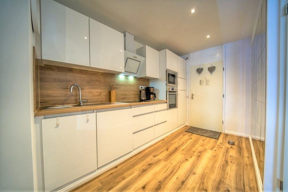 Direkt im Eingangsbereich platzierte, vergrößerte Einbauküche mit viel Stauraum