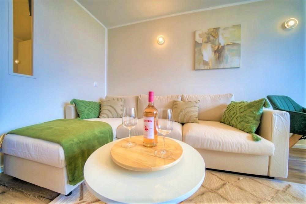Offener Wohnbereich mit komfortablem Sofa, Essplatz für 4 Personen und Flachbildfernseher