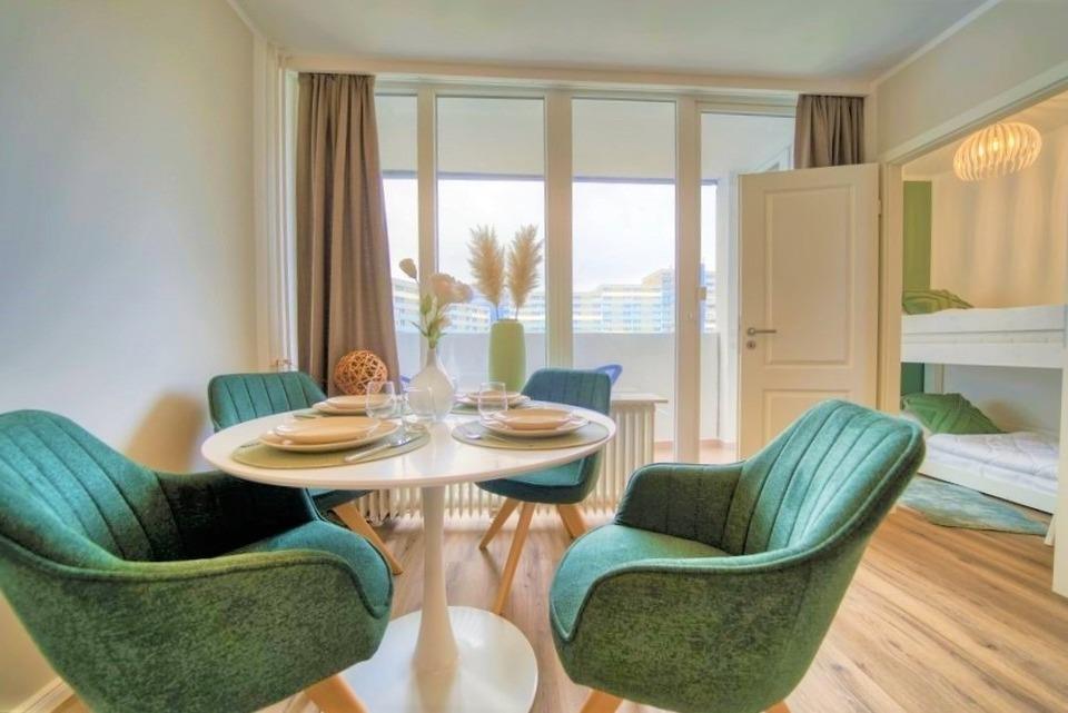 Diese im Jahr 2023 komplett sanierte Ferienwohnung liegt in der 5. Etage des Hauses Q im Ferienpark Heiligenhafen. Auf 45?m² Wohnfläche überzeugt sie durch eine architektonisch durchdachte Raumaufteilung und eine moderne Ausstattung, die keine Wünsche offenlässt. Der Balkon in Nord-Ostlage bietet einen entspannten Blick auf die gepflegten Grünanlagen des Ferienparks.