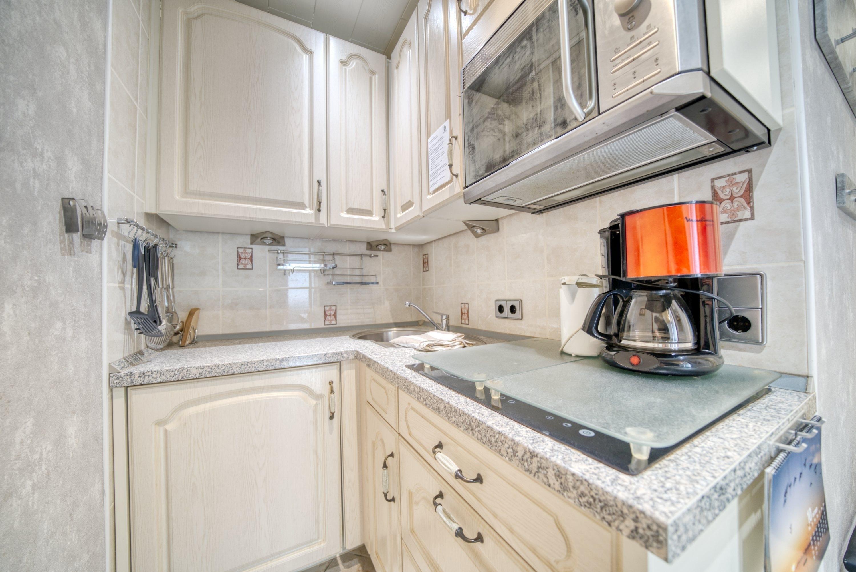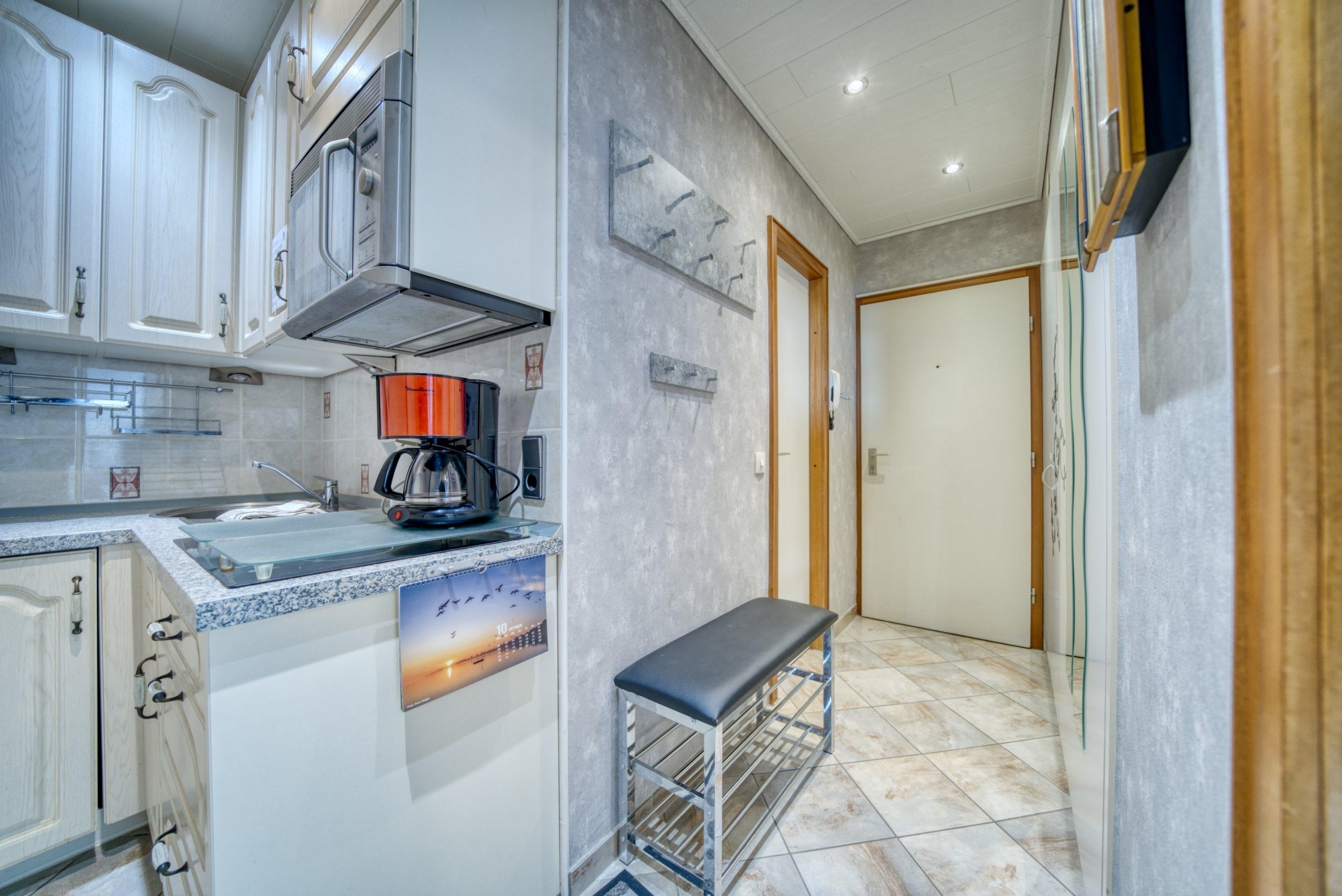 Küche mit Ceranherd, Mikrowelle, Kühlschrank mit Gefriermöglichkeit, Wasserkocher, Filterkaffeemaschine und Toaster