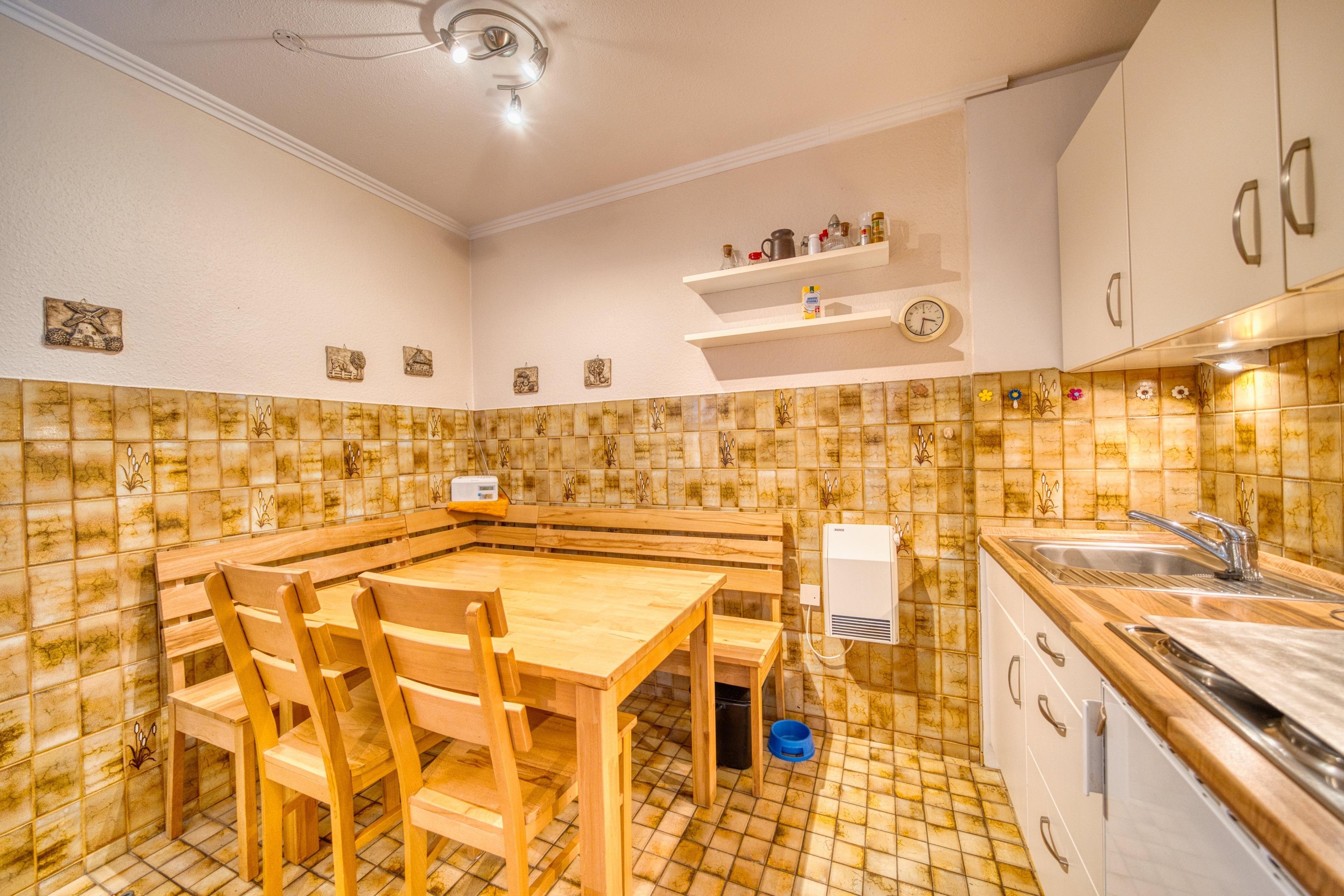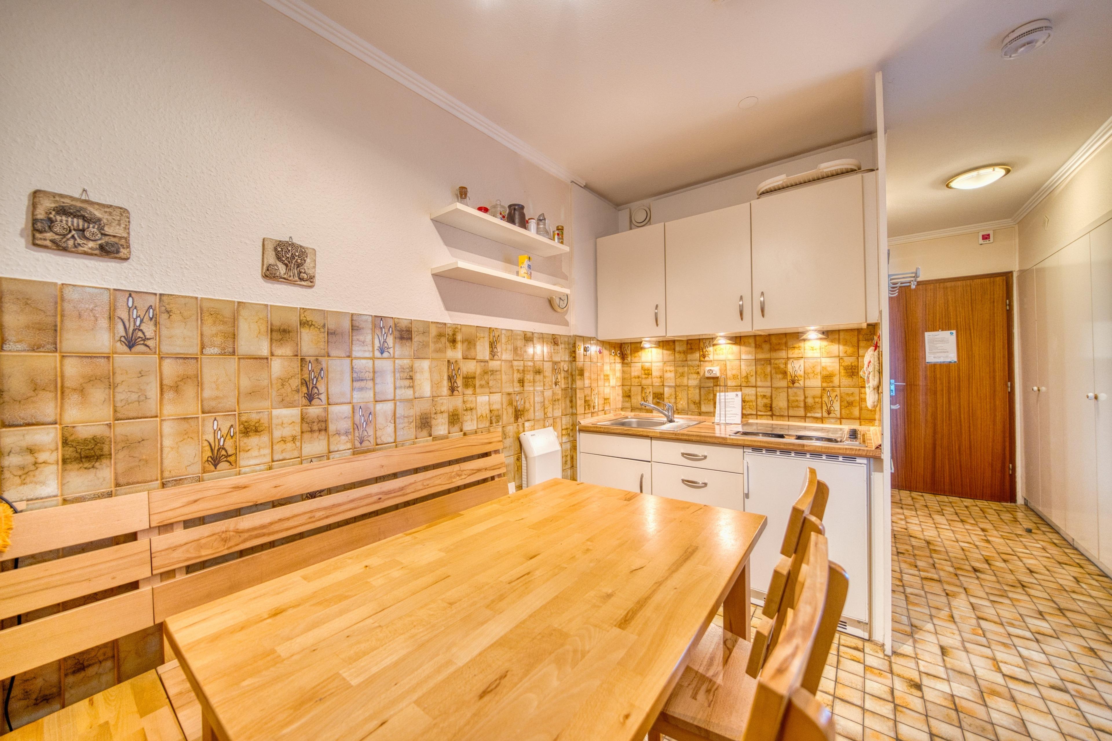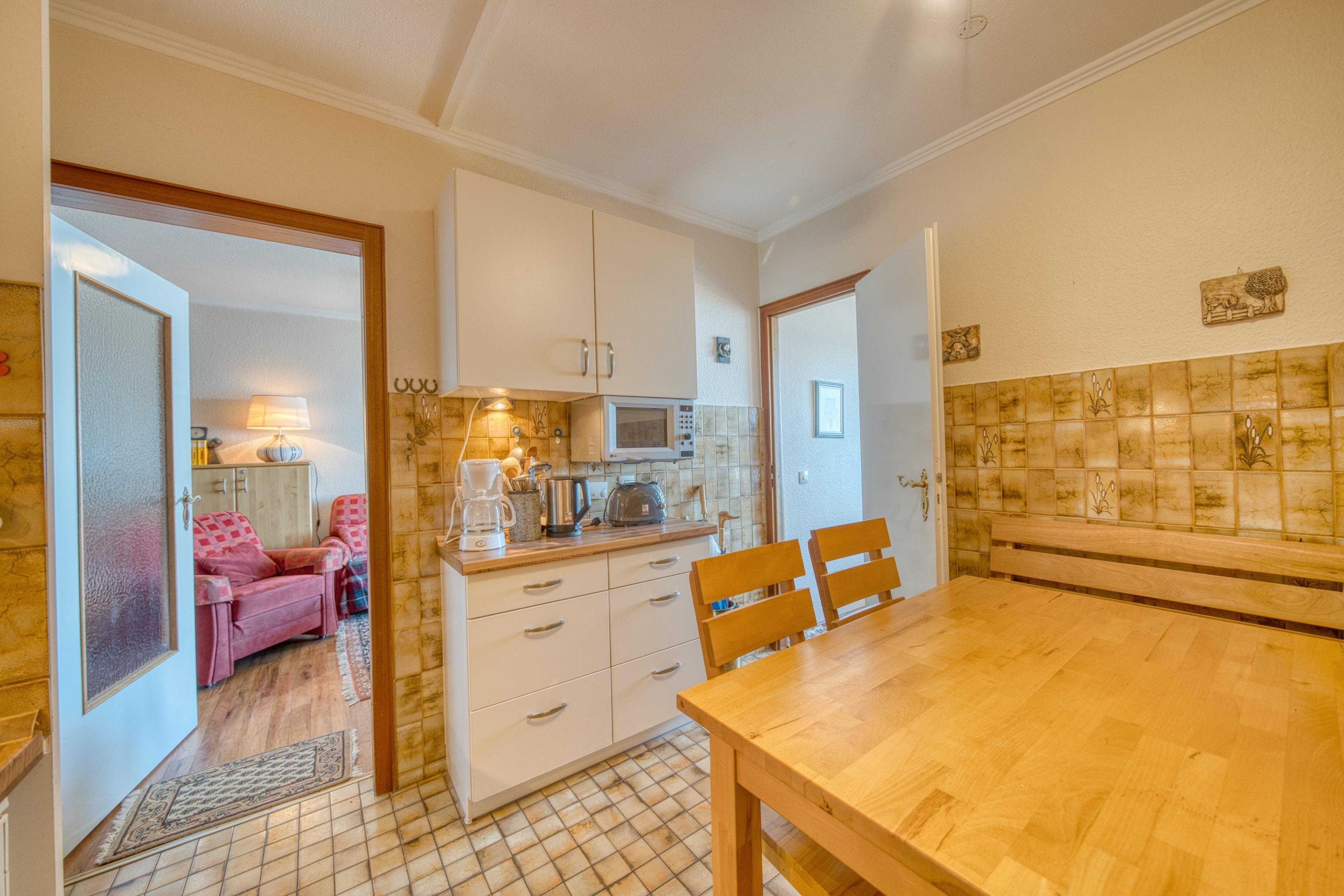 Küche mit 4 Kochfeldern, Mikrowelle, Kühlschrank, Toaster, Wasserkocher und Filterkaffeemaschine