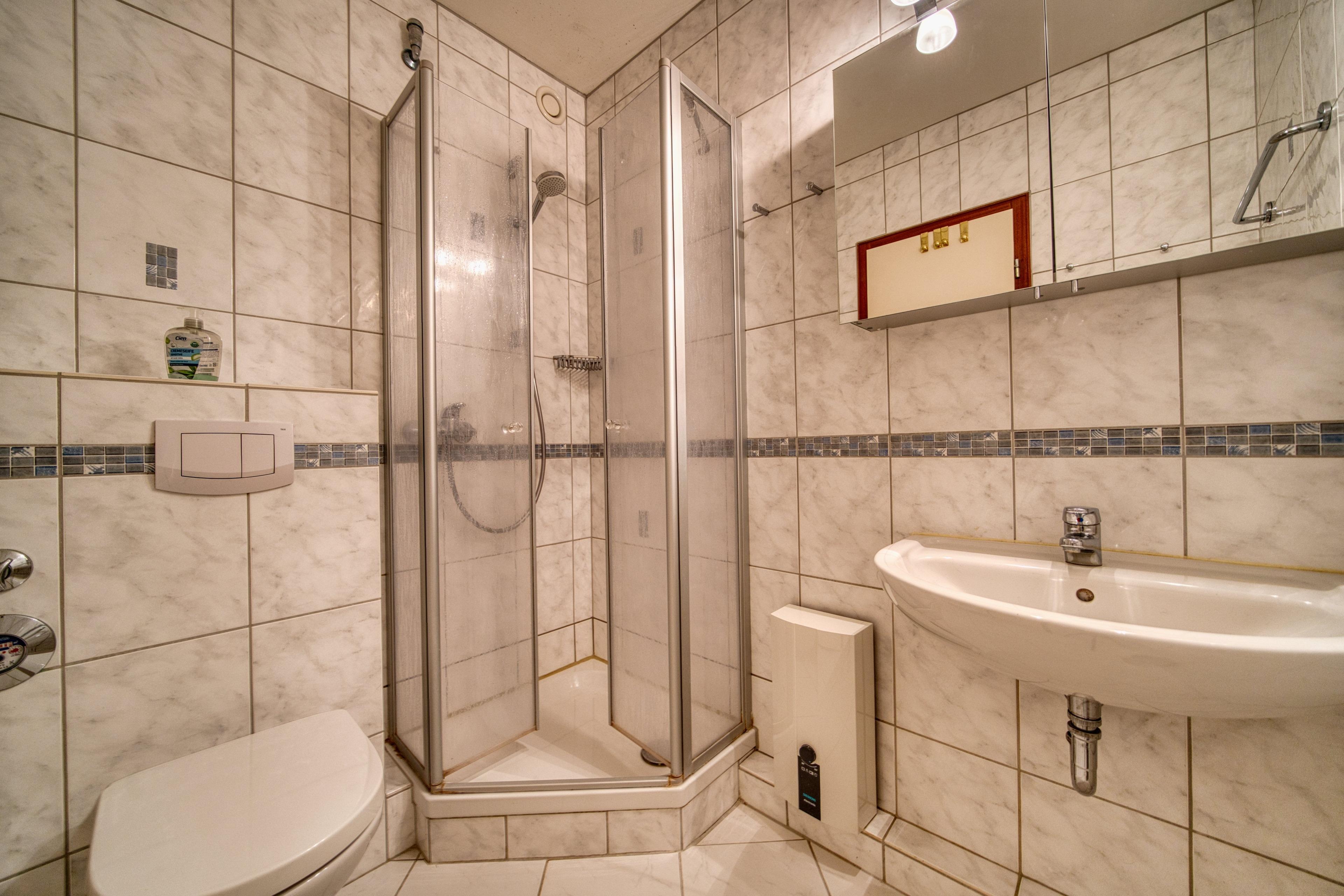 Badezimmer mit Dusche (niedrige Duschtasse)