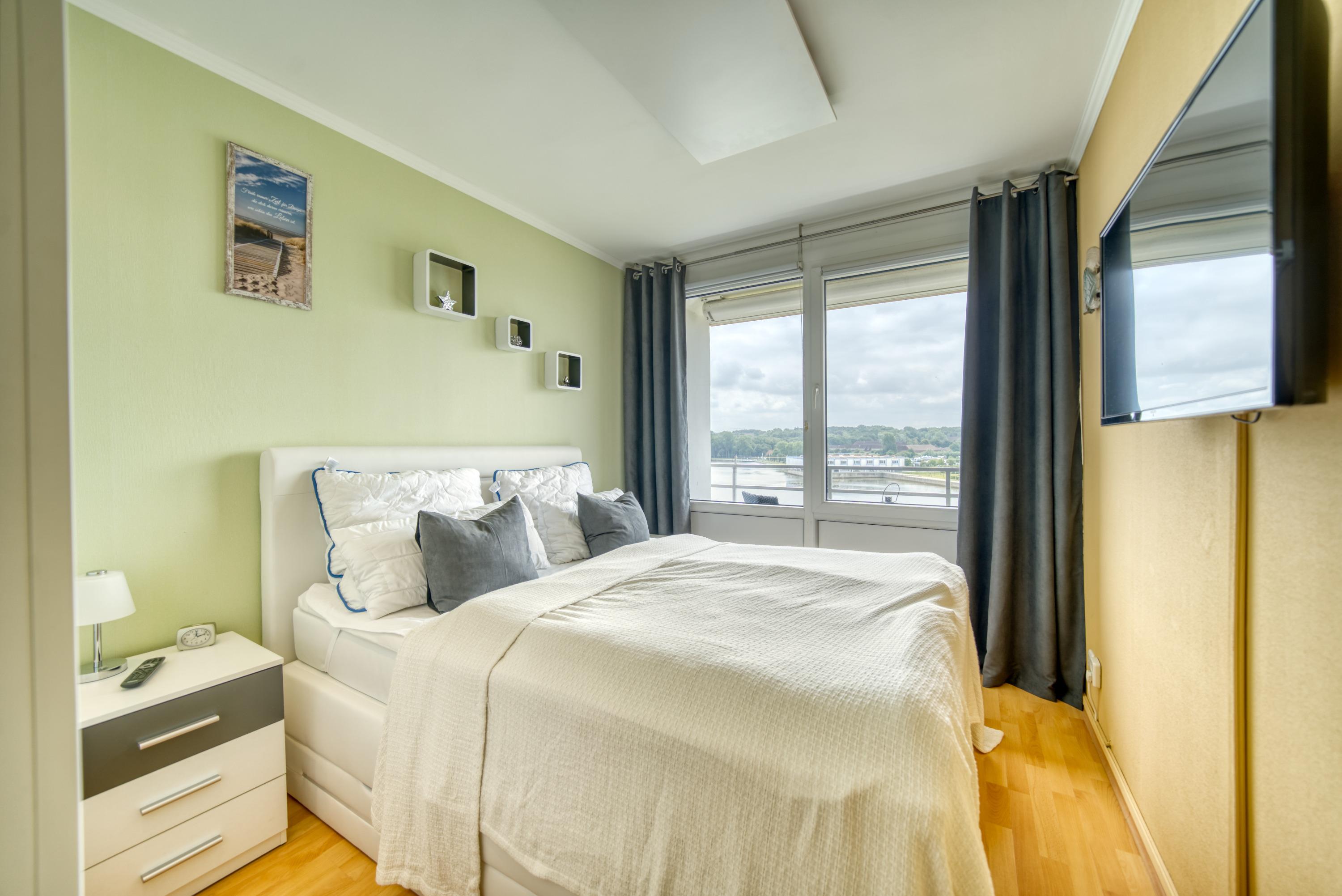 Separates Schlafzimmer mit hochwertigem Boxspringbett und direktem Seeblick
