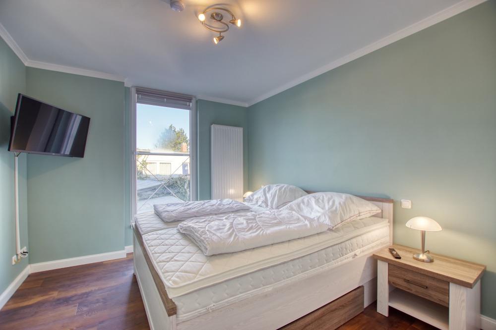 Schlafzimmer: Separat gelegen, mit Doppelbett und zusätzlichem TV, Ausrichtung zum Garten
