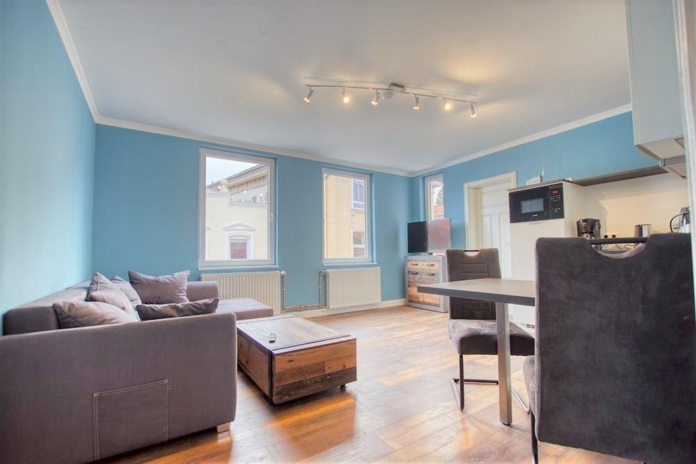 Wohn-/Esszimmer: mit TV, Schlafcouch und offener Küche, Ausrichtung zur Innenstadt