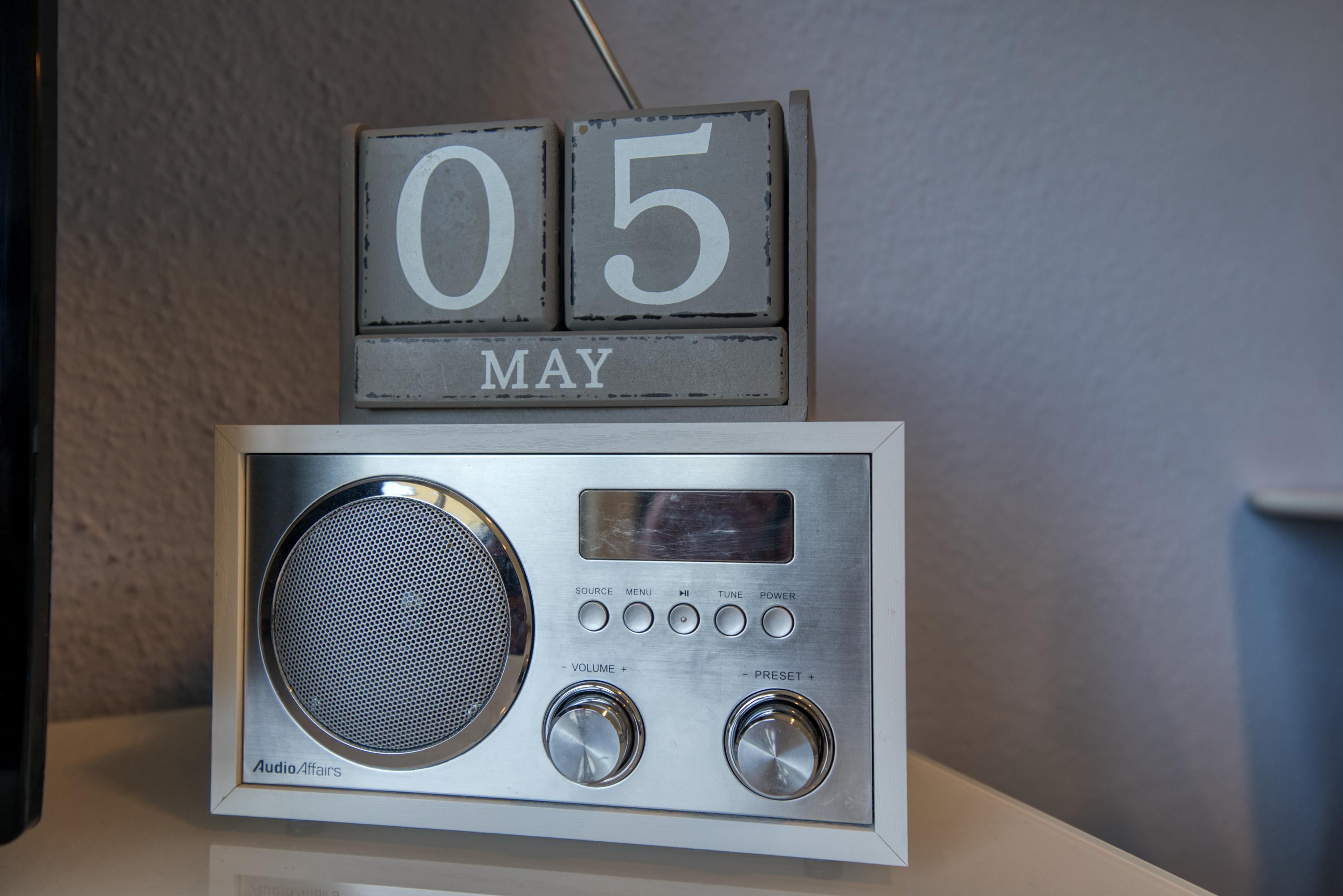Wohnbereich: Helles Ecksofa, Flatscreen-TV, Radio mit Bluetooth-Funktion, Essbereich an der Küche