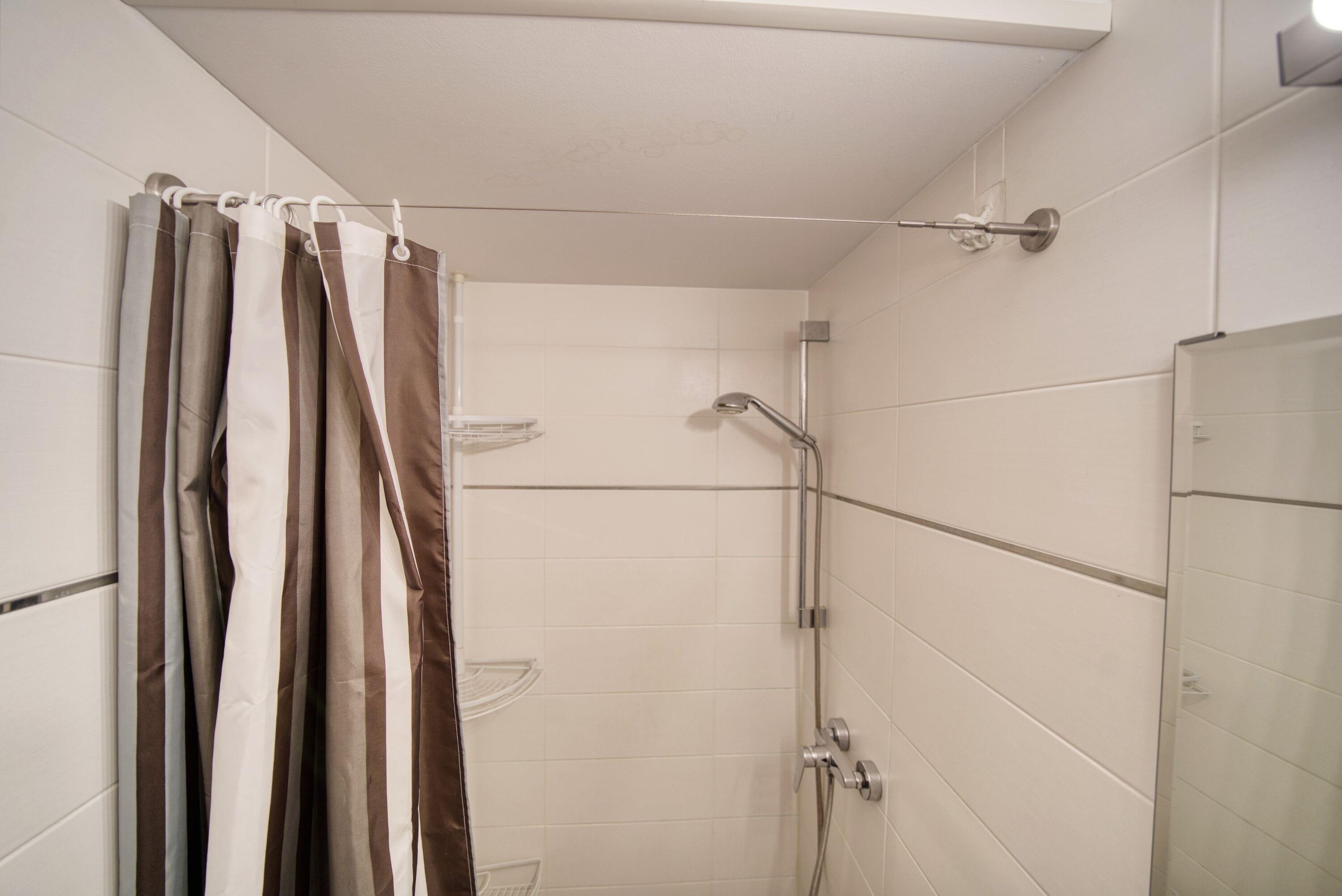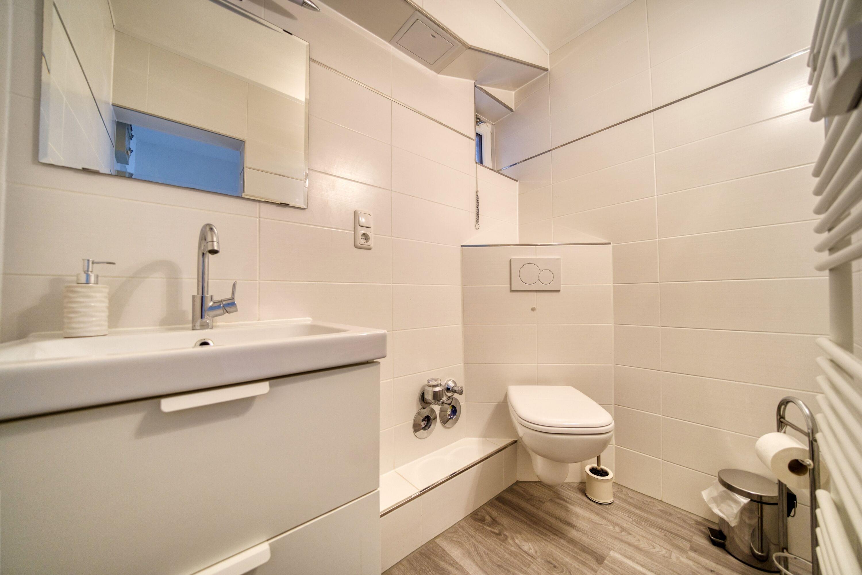 Badezimmer: Dusche, WC und Handtuchtrockner