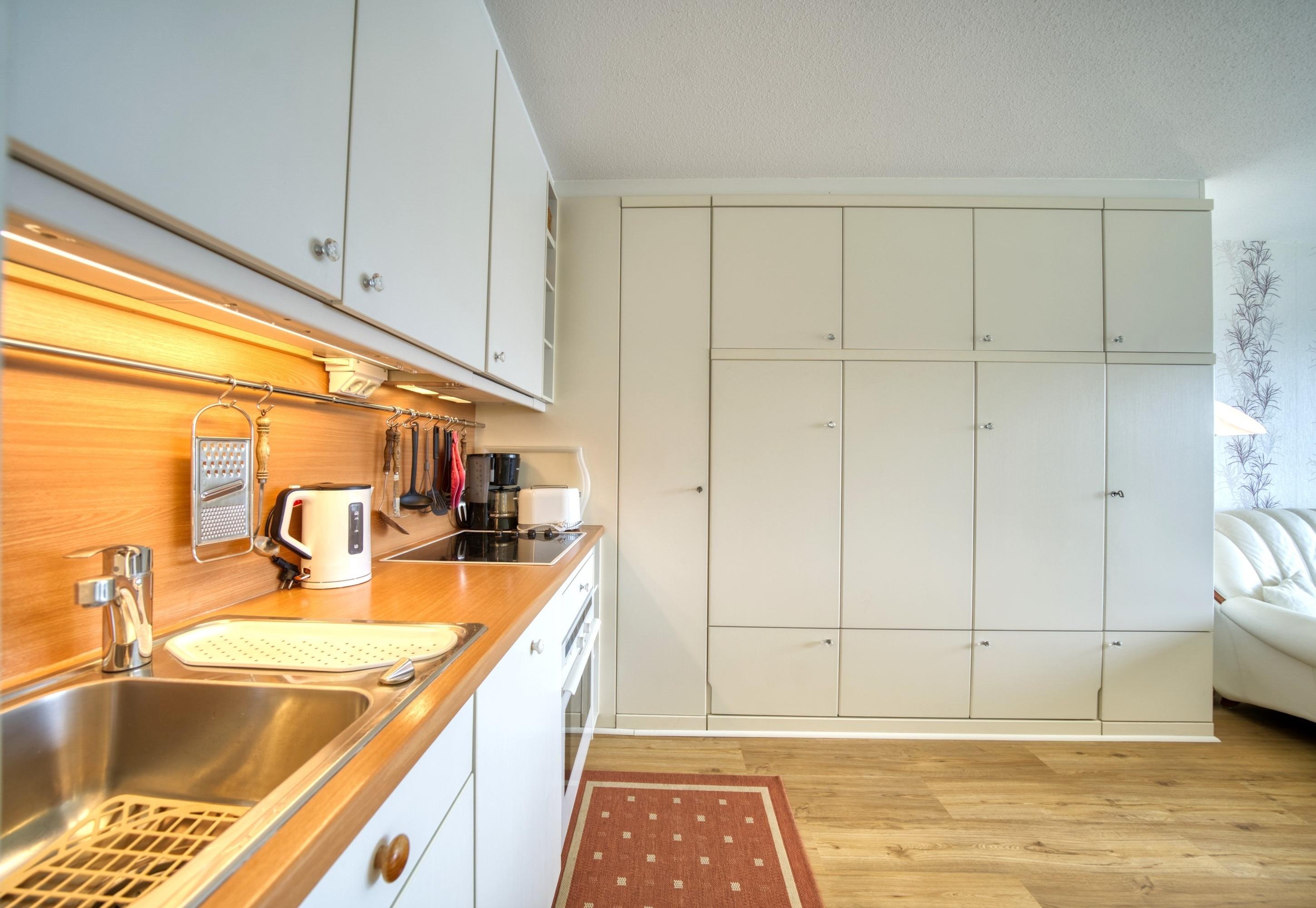 Küche: Die Pantryküche ist gut ausgestattet mit einem 4-Plattenherd, Backofen und einem Kühlschrank mit Gefriermöglichkeit – ideal für die Zubereitung eigener Mahlzeiten.