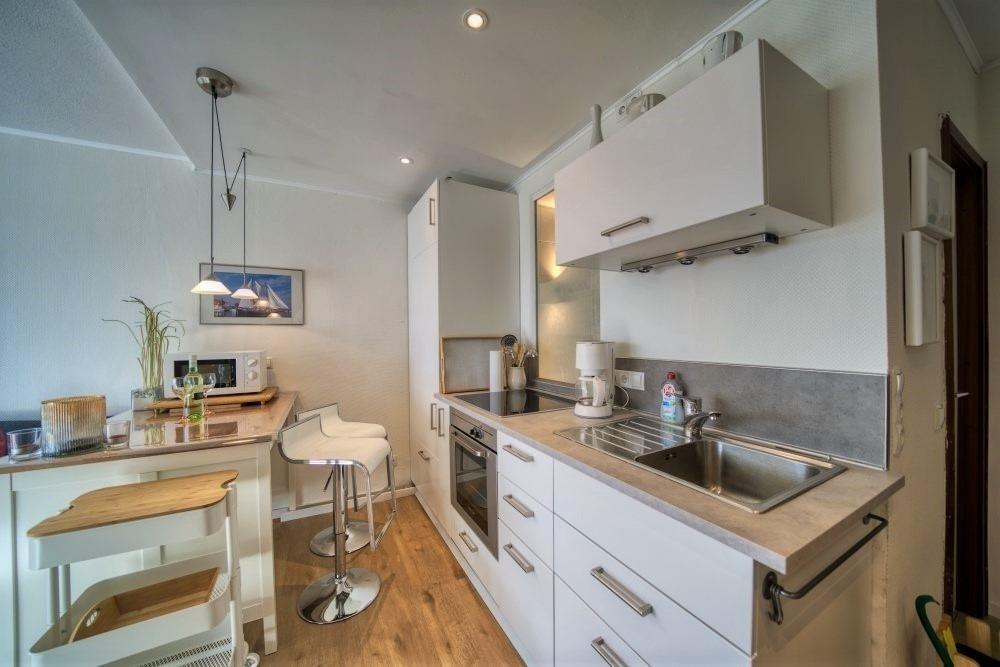 Küche: 4-Plattenherd, großer Kühlschrank mit Gefrierfach, Backofen, Mikrowelle, Wasserkocher, Kaffeemaschine, erhöhter Esstisch mit Barhockern