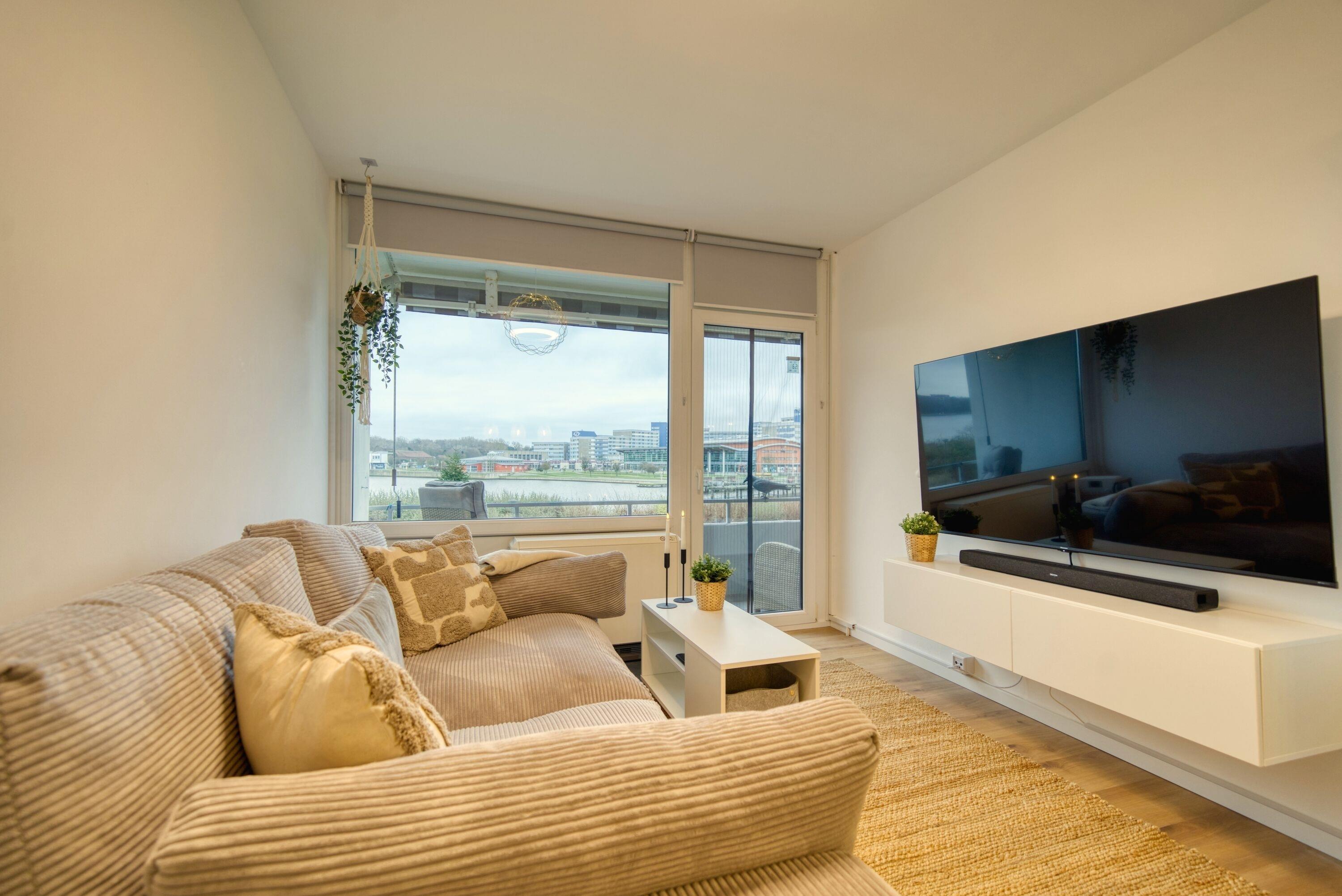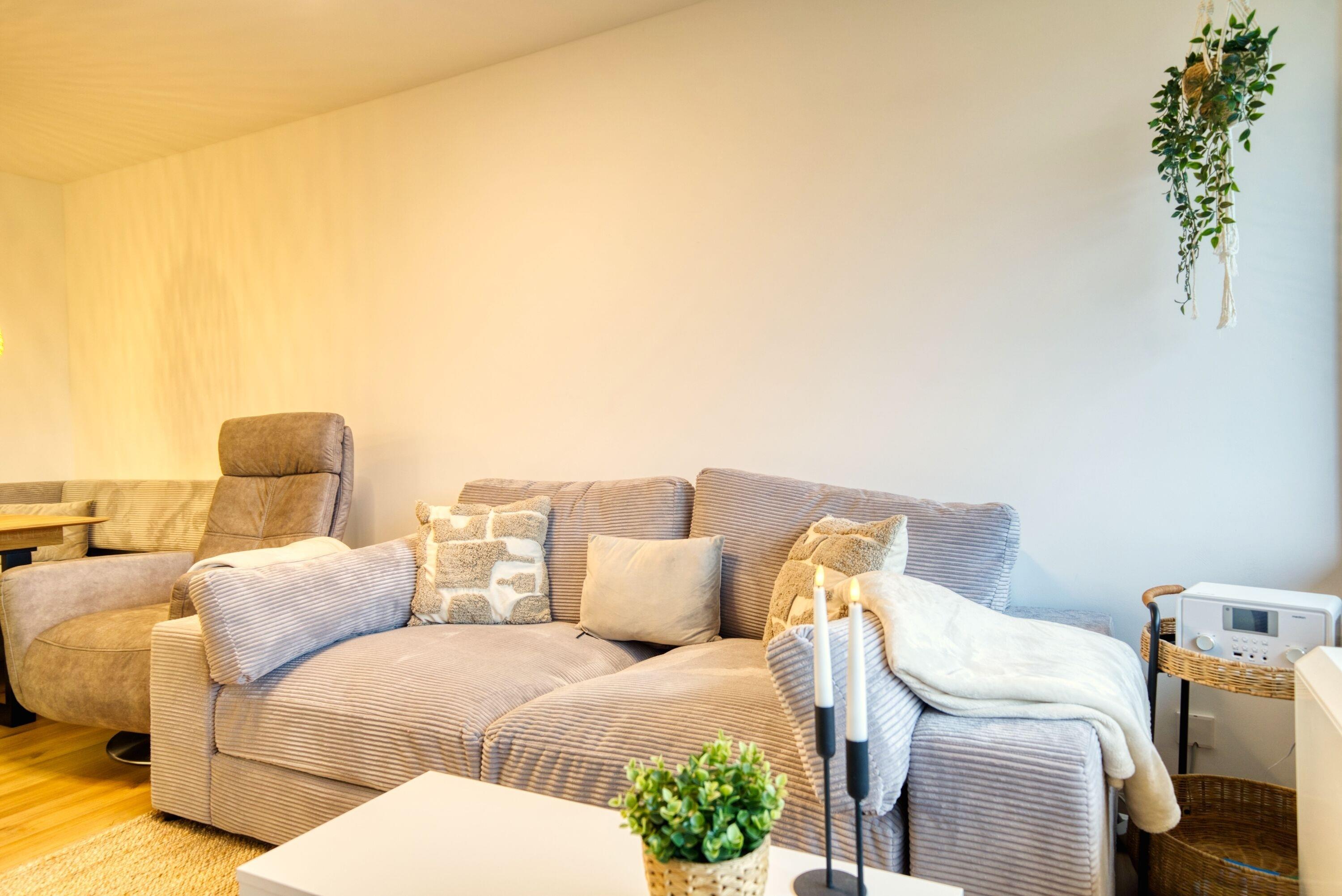 Wohn-/Schlafbereich: Gemütliches Sofa, Flachbild-TV mit Soundbar, elektrische Ventilatoren für heiße Tage