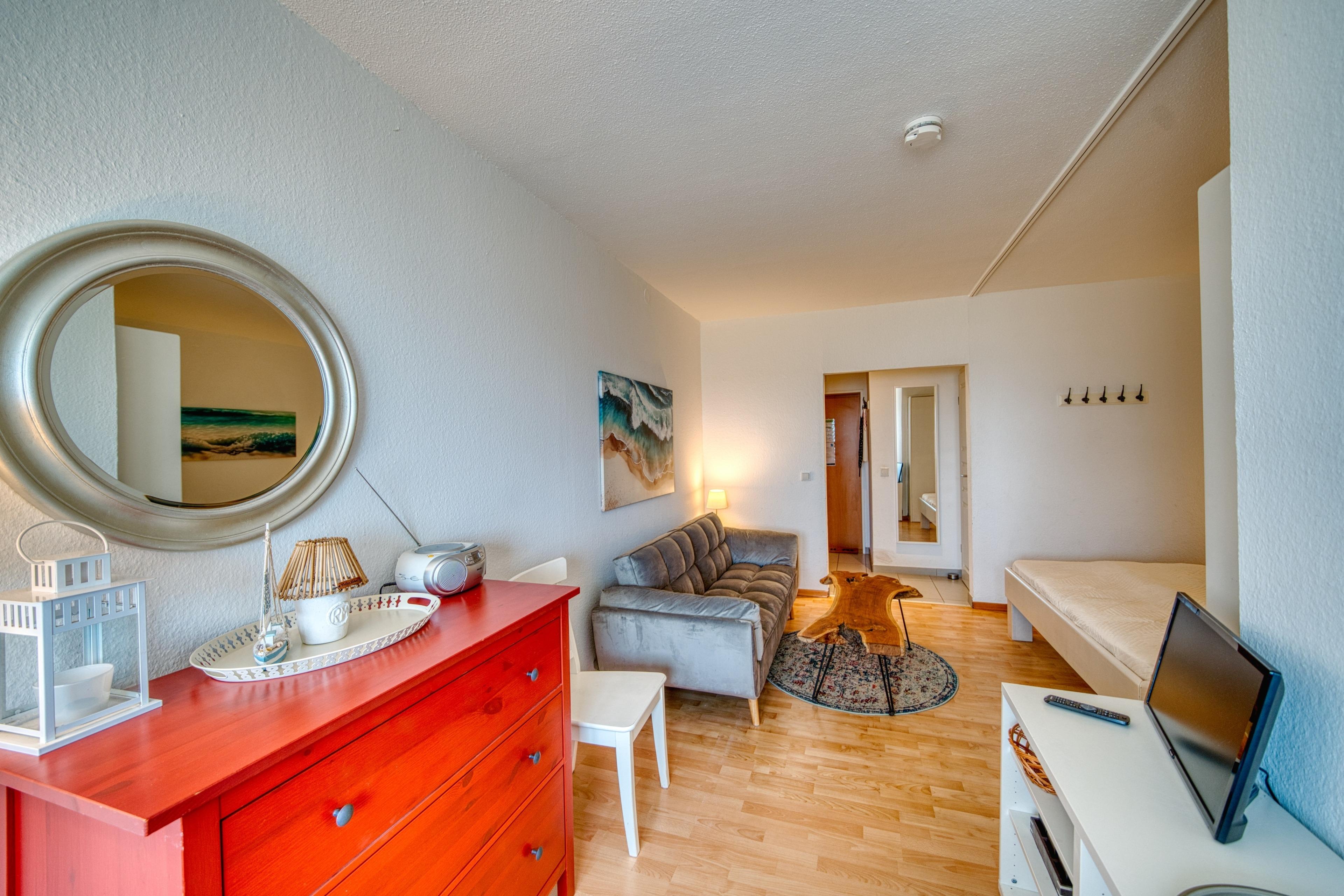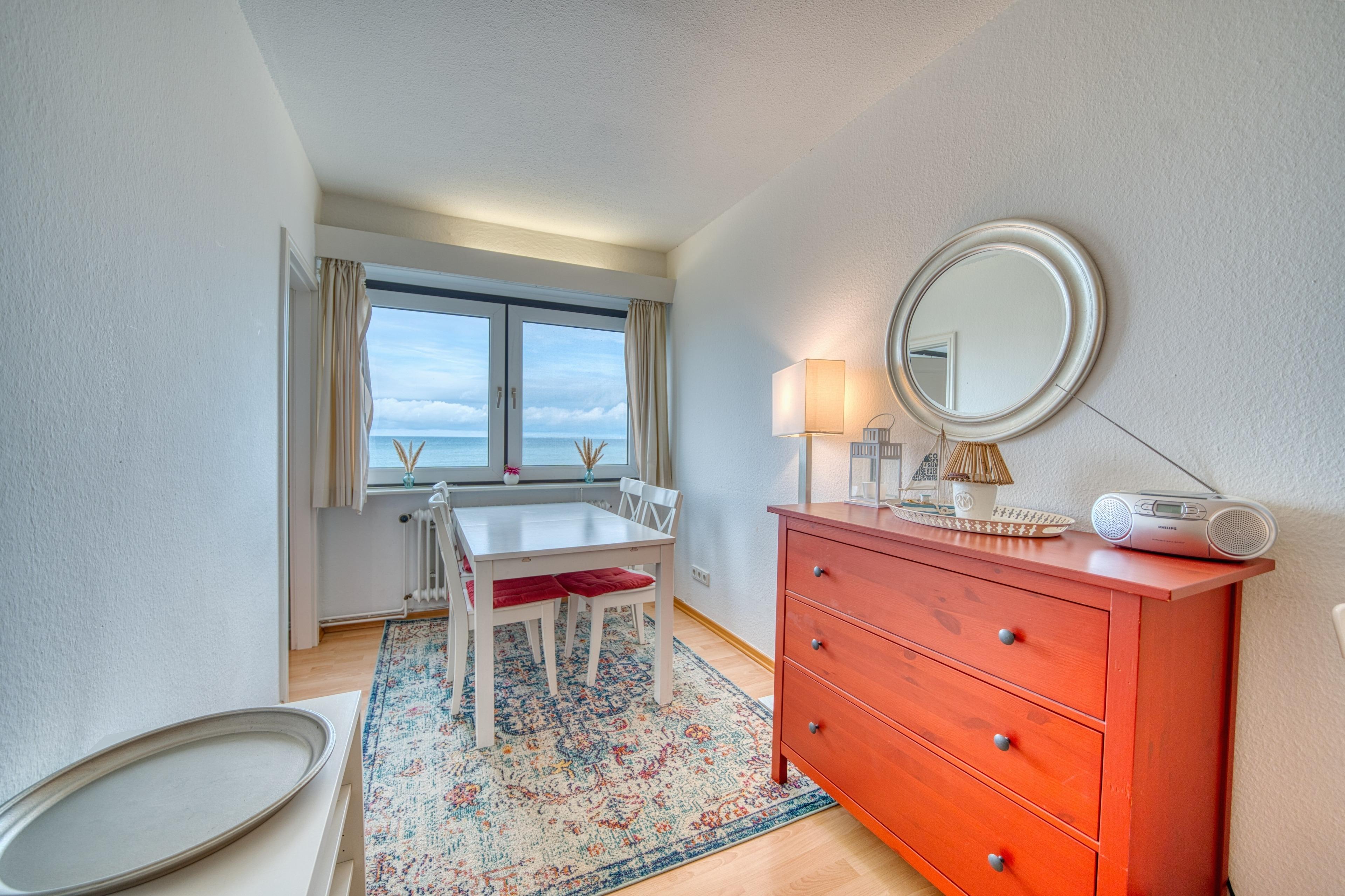 Diese 37 qm große Ferienwohnung in der 2. Etage des Hauses Steinwarder 33 bietet Platz für bis zu 5 Personen und überzeugt mit einem herrlichen Meerblick direkt aus der Wohnung. Obwohl kein Balkon vorhanden ist, genießen Sie hier einen großzügigen Grundriss mit viel Komfort.