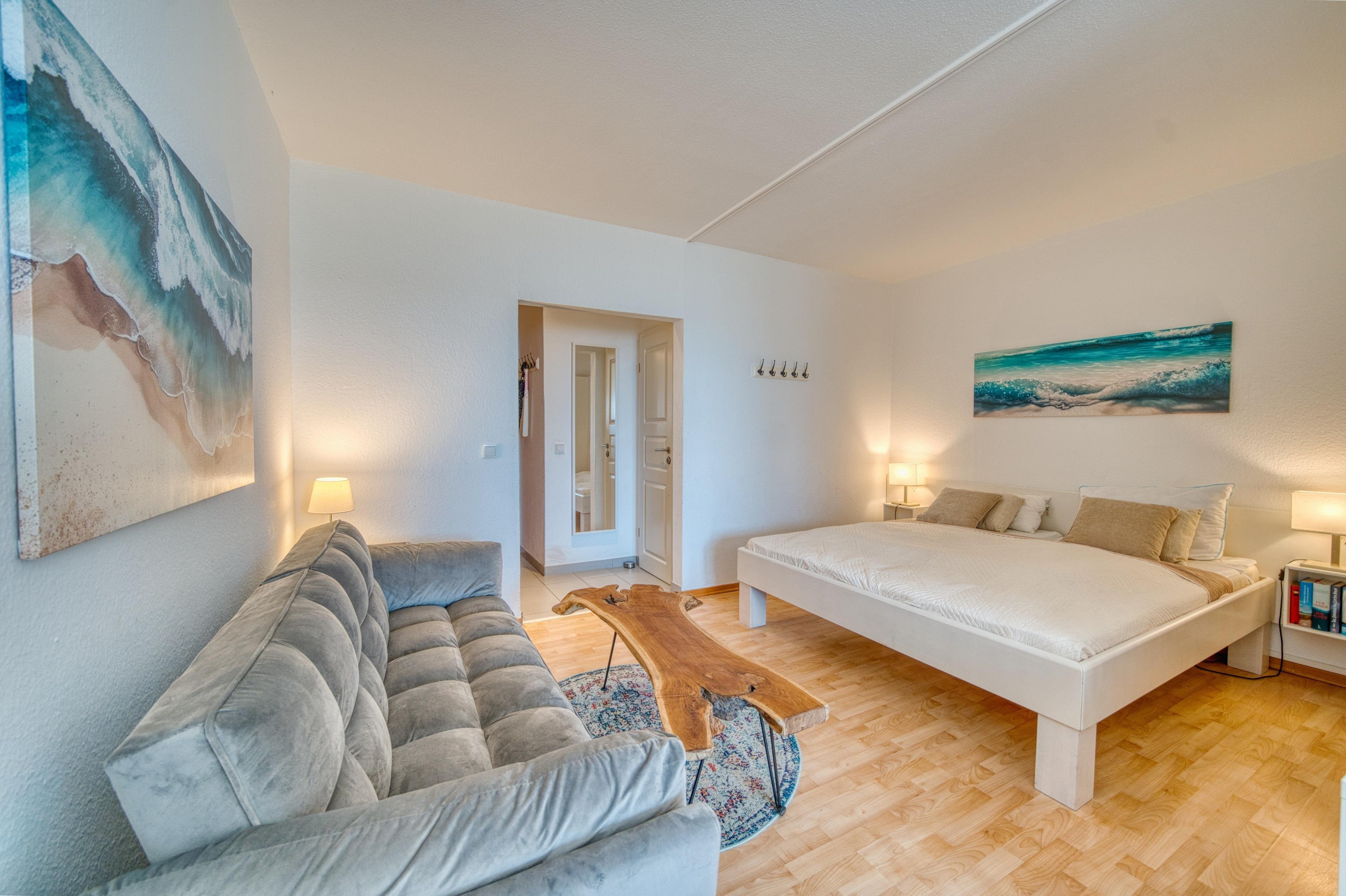 Heller Wohnbereich mit Schlafsofa, Sessel, Flachbild-TV und Esstisch vor dem Fenster