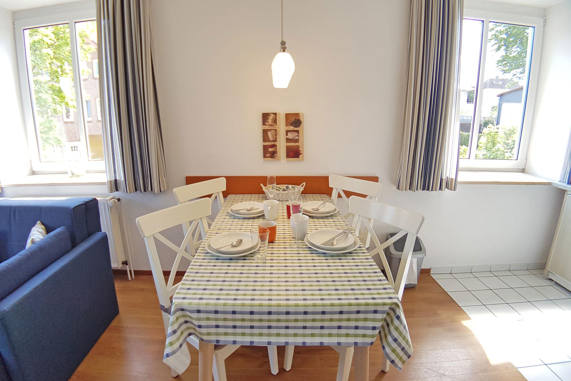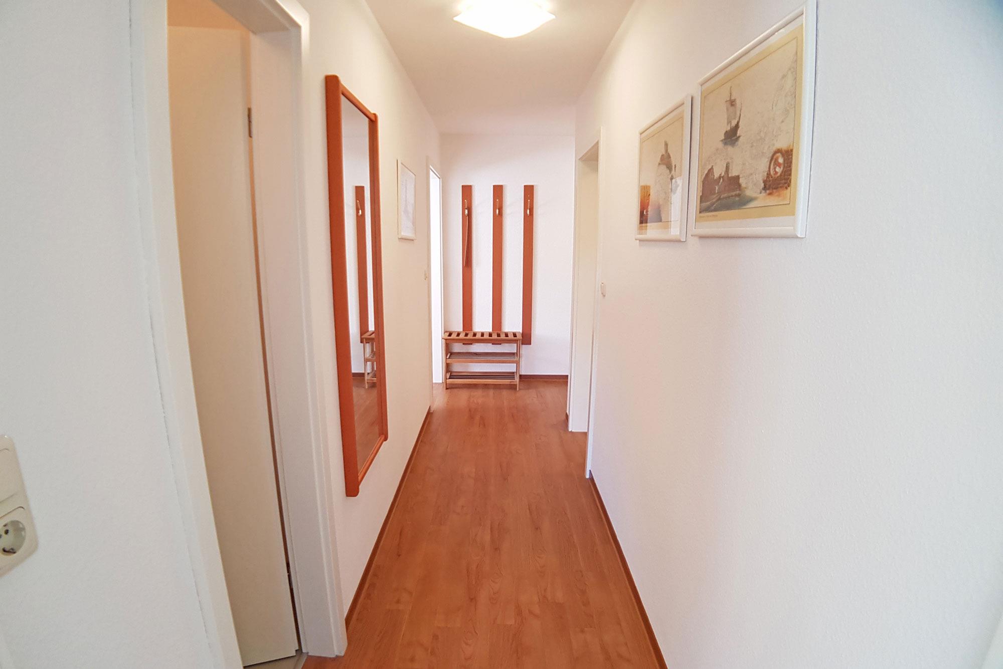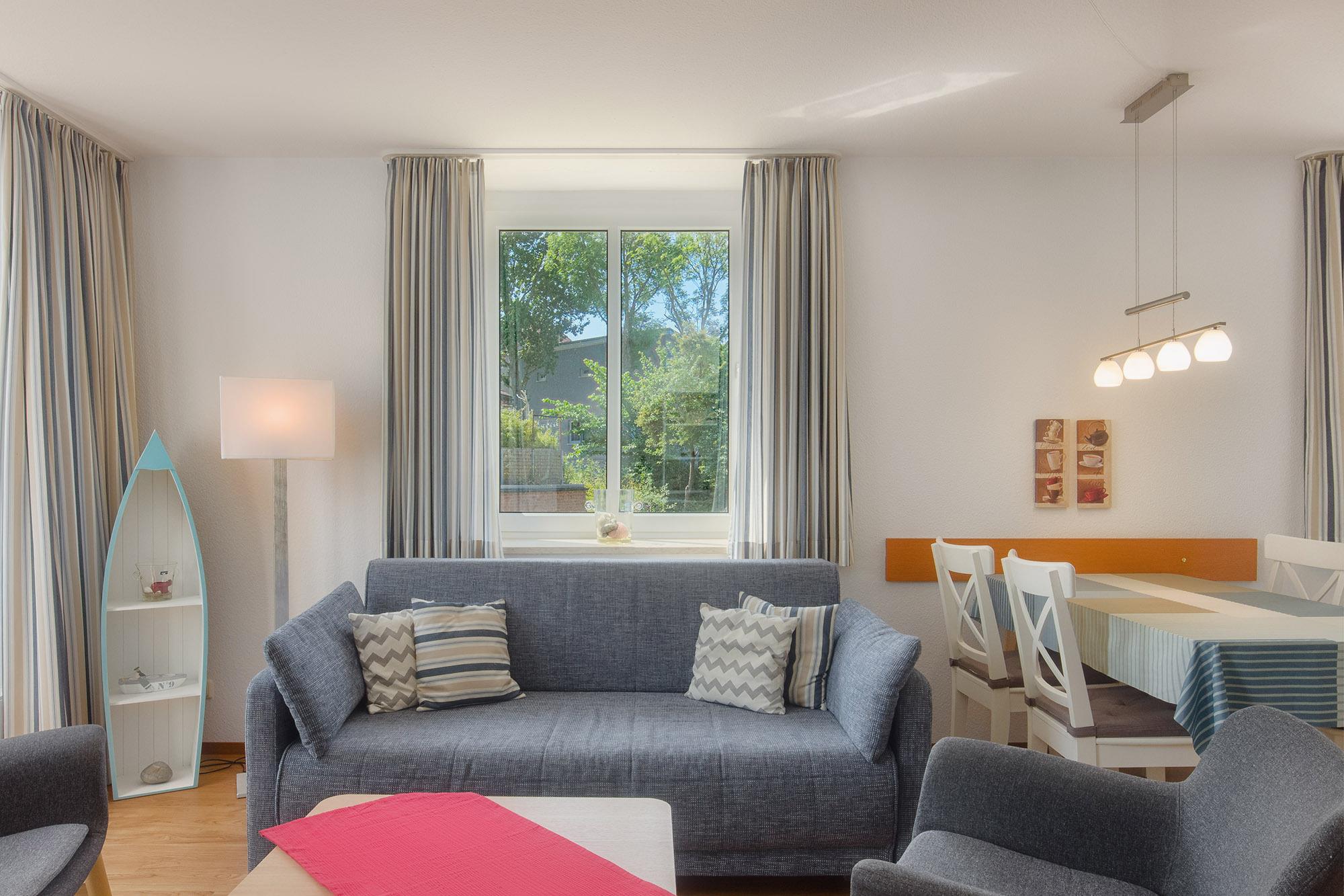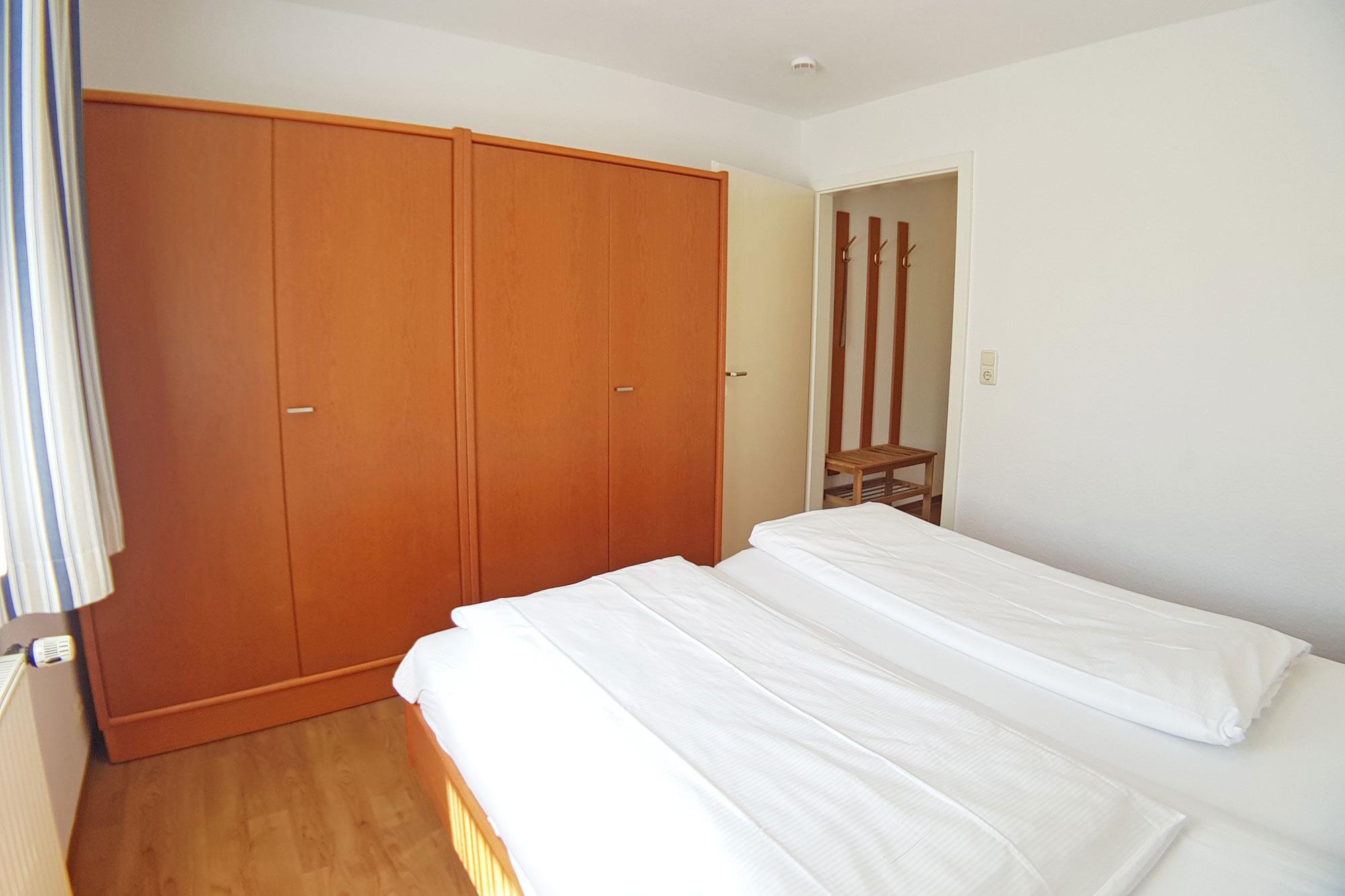 Das Apartment 9 im ersten Obergeschoss bietet auf etwa 50 Quadratmetern ausreichend Platz für bis zu vier Personen. Das Schlafzimmer ist mit einem Doppelbett und einem großen Kleiderschrank ausgestattet. Im Wohnbereich sorgt eine großzügige Schlafcouch für zwei weitere Personen für erholsame Nächte.