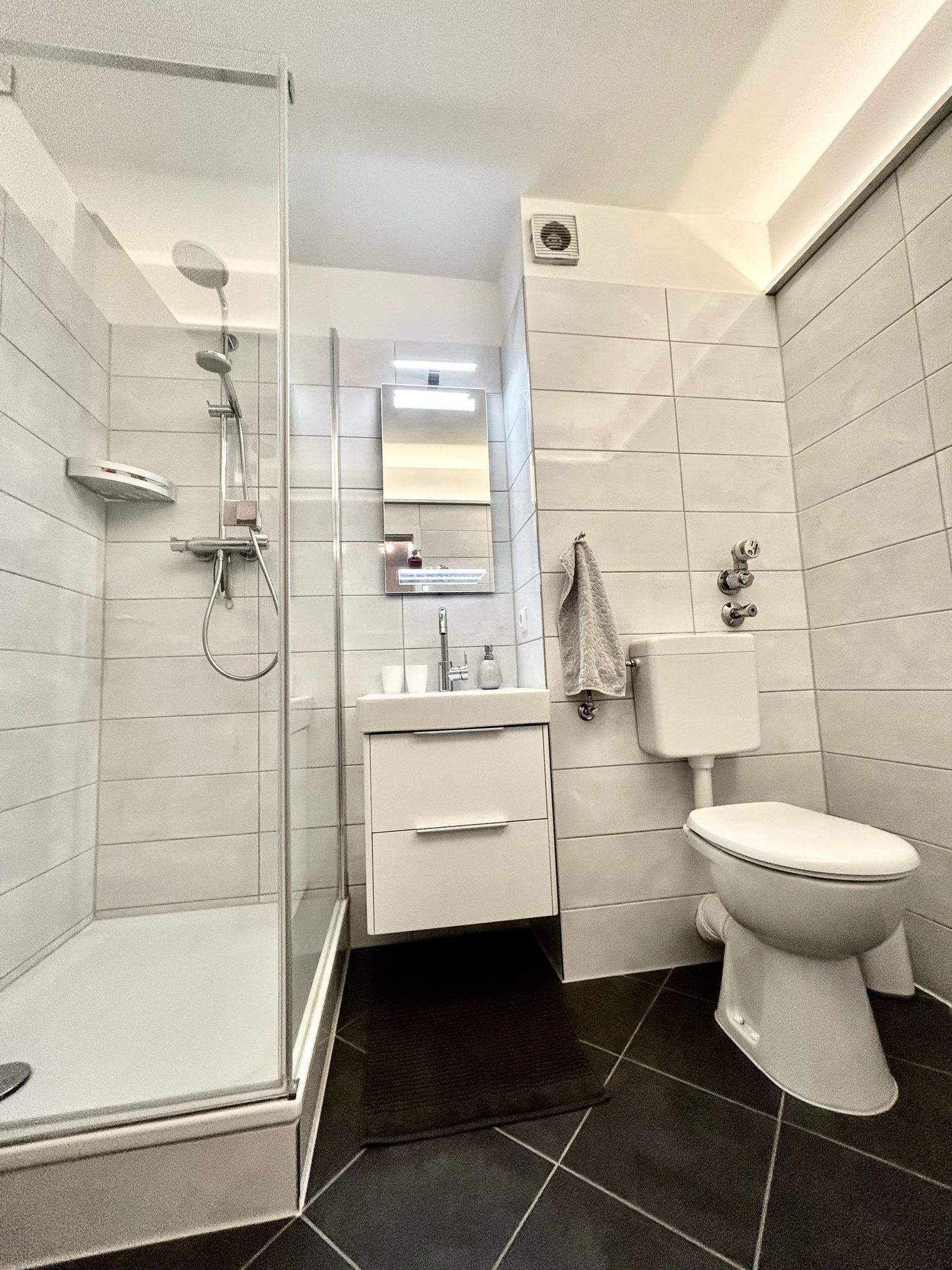 Das Badezimmer ist mit einer Dusche, einem WC und einem Waschbecken ausgestattet.