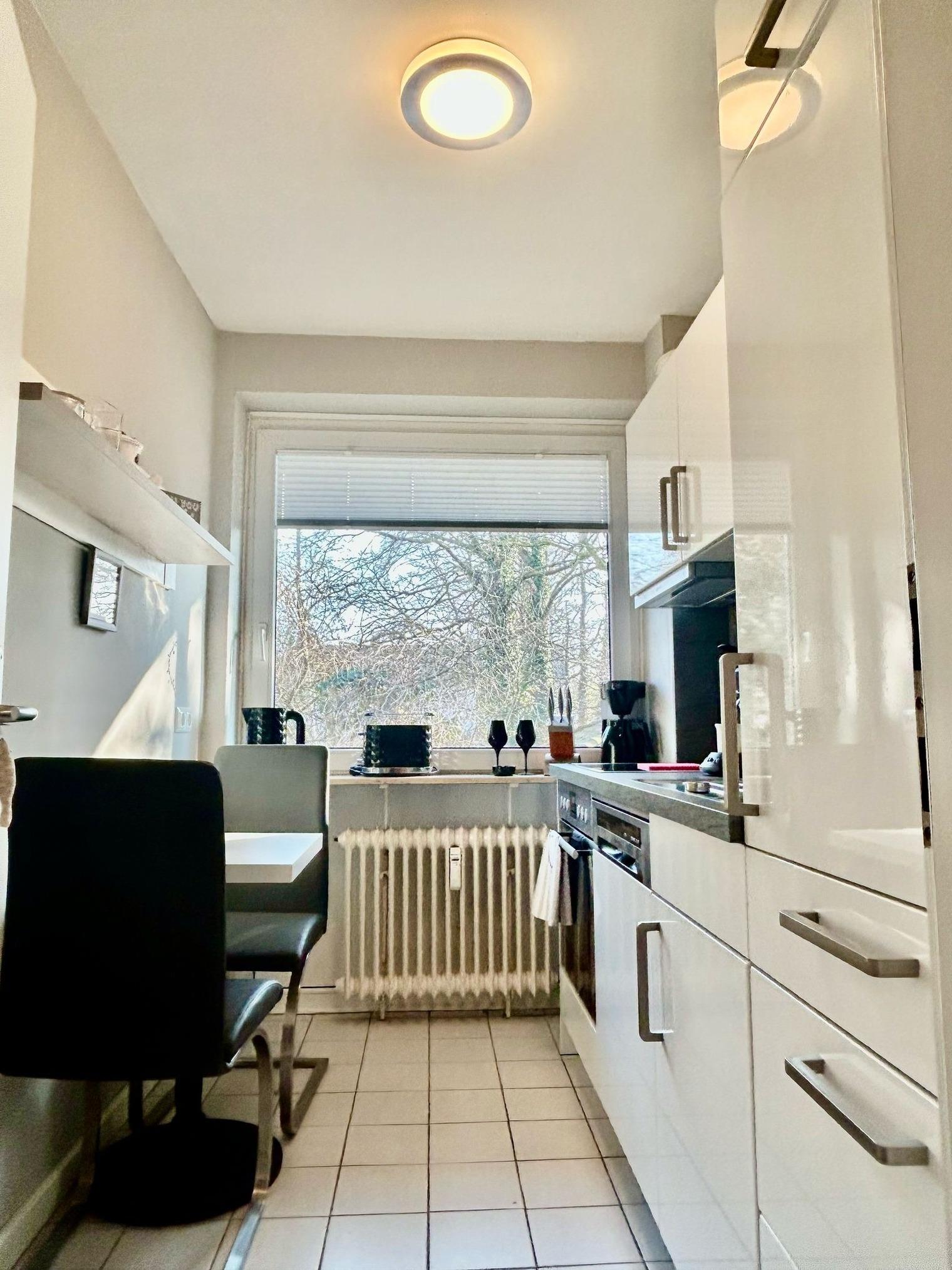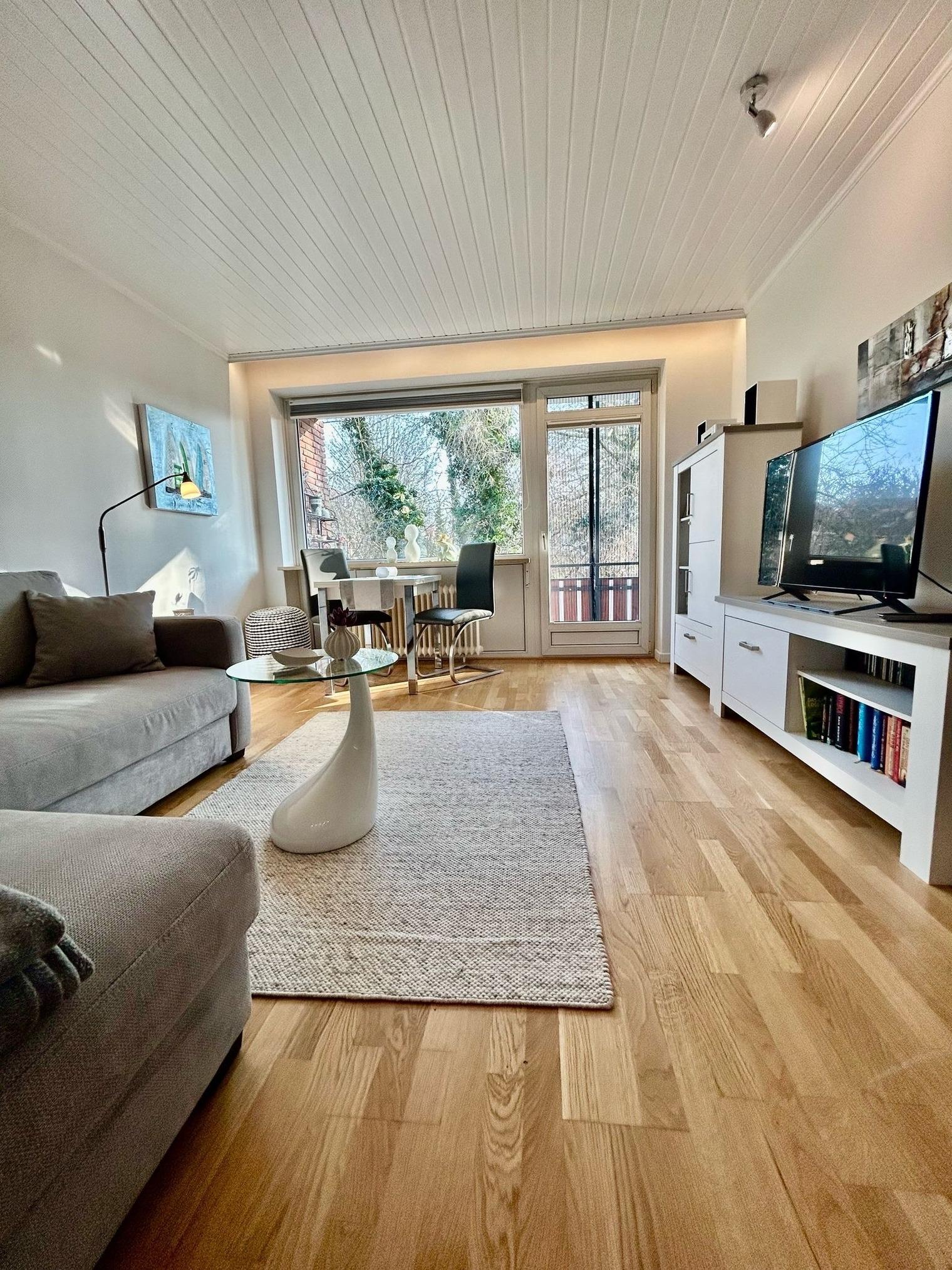 Das Apartment befindet sich in der 1. Etage des gepflegten Hauses "Bellevue" und zeichnet sich durch seine helle und moderne Einrichtung aus, die bereits beim Betreten der Tür direkt ins Auge springt. Auf einer Fläche von ungefähr 46qm befindet sich das liebevoll gestaltete Wohnzimmer mit einer gemütlichen Couch, einem Fernseher und einem kleinen Esstisch. Von hier aus gelangt man auf den großzügigen Südbalkon, der dank seiner Lage zum Hinterhof ausreichend Ruhe bietet, um sich zu erholen.