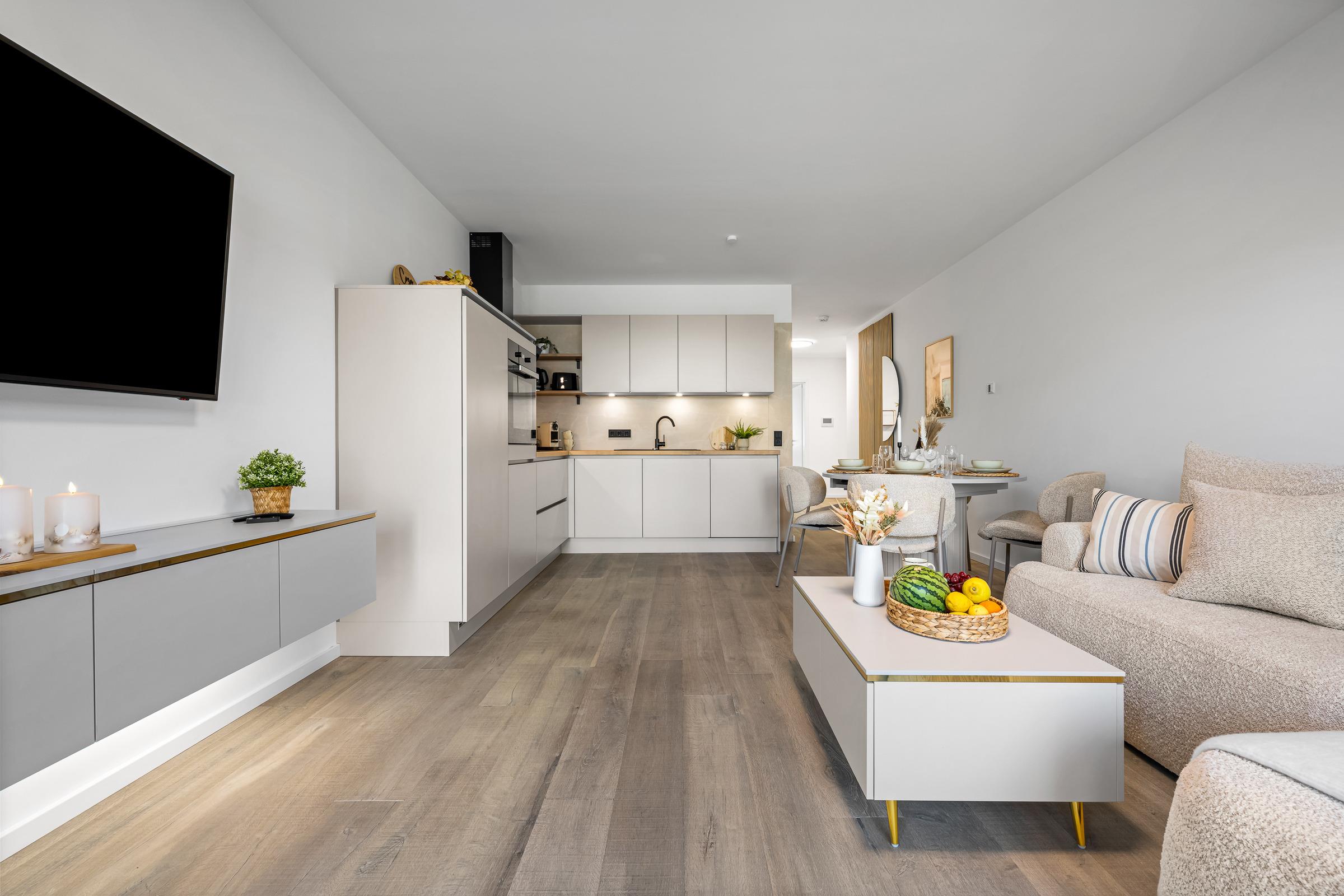 Auch die Küchenzeile wurde in den Wohnbereich integriert. Modern und durchdacht gestaltet, bietet Ihnen die Einbauküche alle Annehmlichkeiten für eine sorgenfreie Selbstversorgung. Als Kaffeemaschine steht Ihnen zusätzlich eine Kapselmaschine Nespresso zur Verfügung.