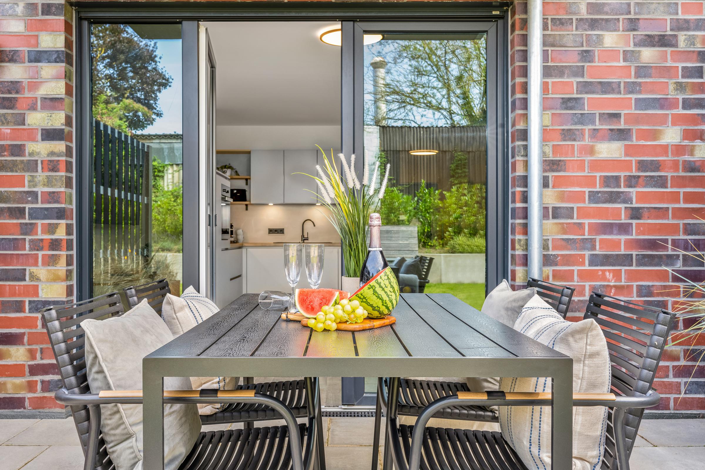 Zu den weiteren Ausstattungsmerkmalen gehören eine möblierte Terrasse und ein gemeinschaftlich nutzbarer, offener Gartenbereich. Die Terrasse der Wohnung schließt direkt an den Wohnbereich an. Diese lädt dazu ein, den Tag mit einer Tasse Kaffee an der frischen Seeluft zu beginnen oder laue Sommerabende entspannt ausklingen zu lassen.