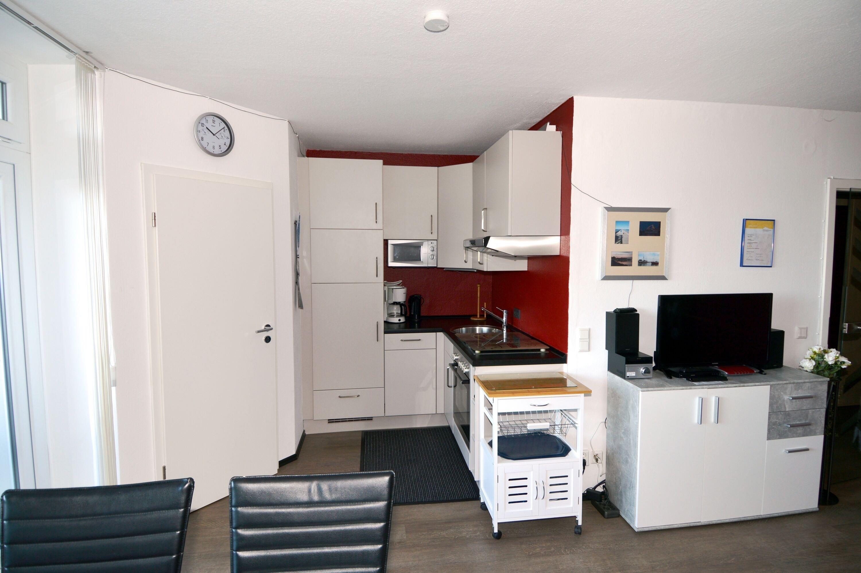 Im Wohnzimmer erwartet Sie eine einladende Couchgarnitur, die zum Verweilen und Entspannen einlädt. Hier können Sie nach einem erlebnisreichen Tag an der Ostsee die Beine hochlegen oder einen Filmabend genießen. Der Esstisch am Fenster ist der perfekte Ort für gesellige Mahlzeiten mit der Familie. Die offene, komplett ausgestattete Einbauküche lässt keine kulinarischen Wünsche offen: Sie finden hier ein Cerankochfeld, einen Backofen, eine Mikrowelle sowie einen Kühlschrank mit großem Gefrierfach. Zusätzlich sind ein Geschirrspüler, eine Kaffeemaschine, ein Toaster und ein Wasserkocher vorhanden – alles, was Sie für die Zubereitung Ihrer Lieblingsgerichte brauchen.