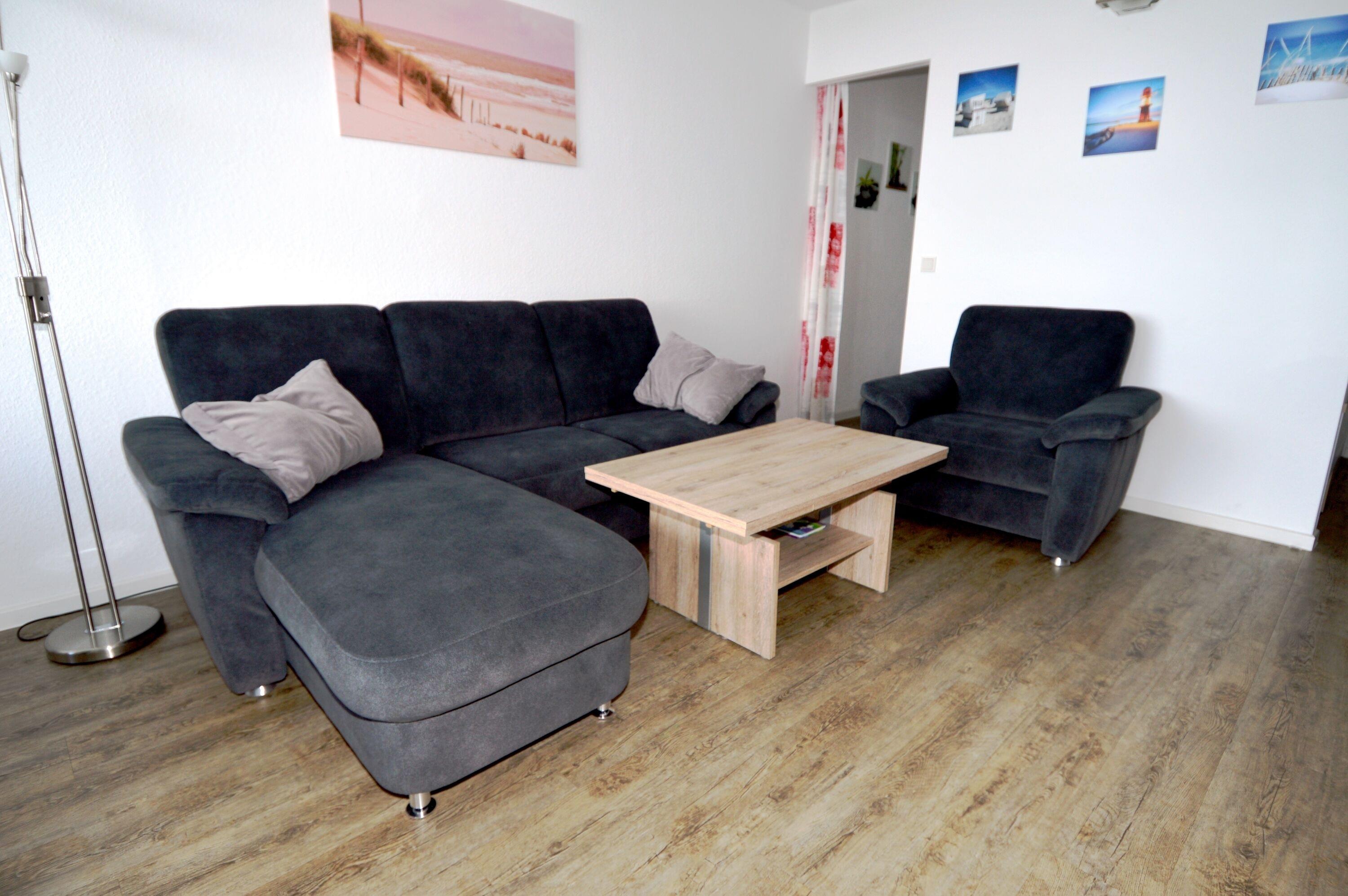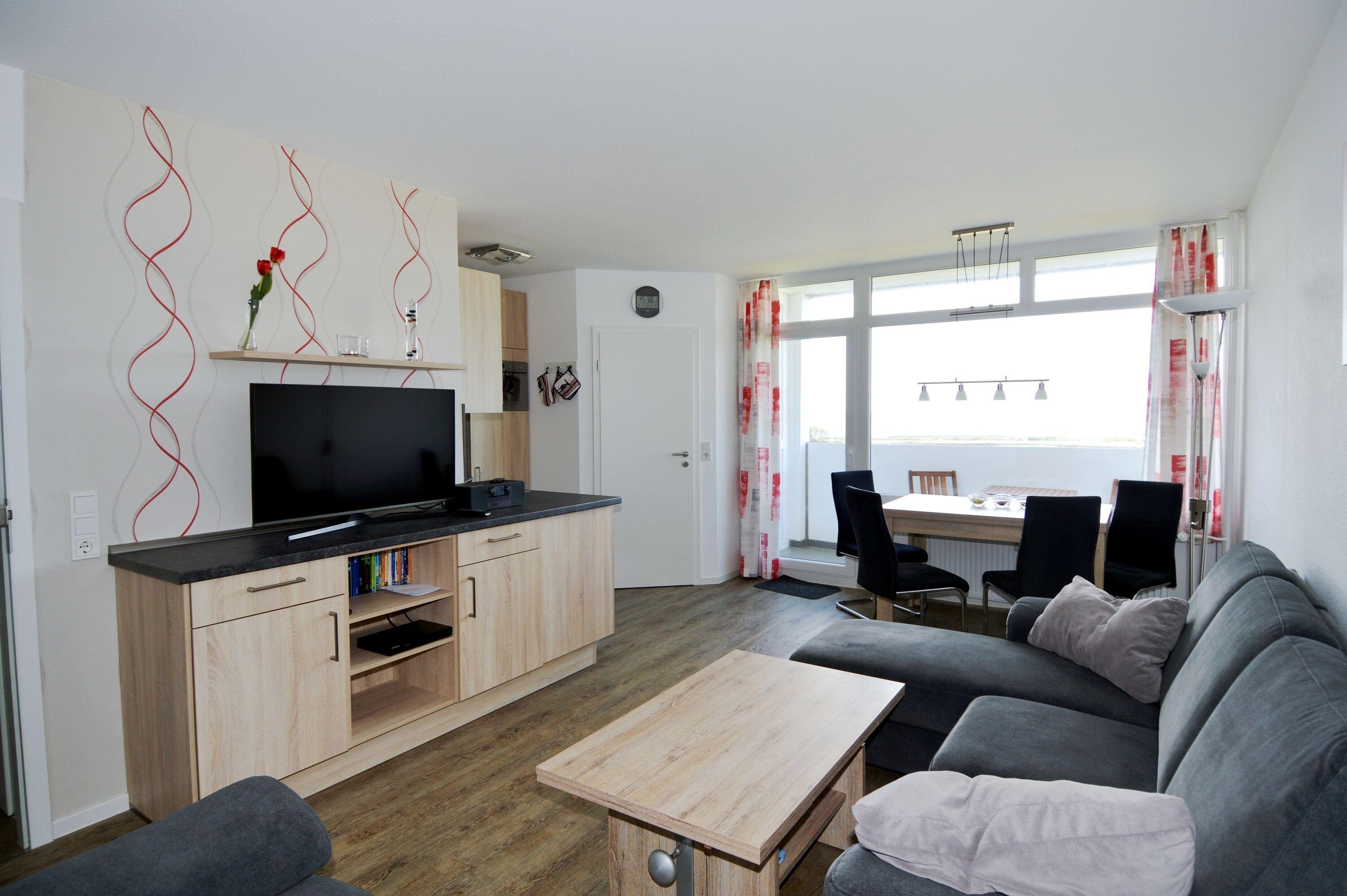Die helle Einrichtung dieser Ferienwohnung schafft einladende Atmosphäre, in der Sie sich sofort wohlfühlen werden. Die großzügigen Fenster lassen viel Tageslicht herein und bieten Ihnen eine zauberhafte Aussicht. Das Wohnzimmer ist modern gestaltet und läd zum Entspannen nach einem erlebnisreichen Tag ein. Auf der bequemen Couch können Sie die gemeinsamen Abende verbringen, während Sie eine spannende Fernsehsendung oder einen Film genießen.