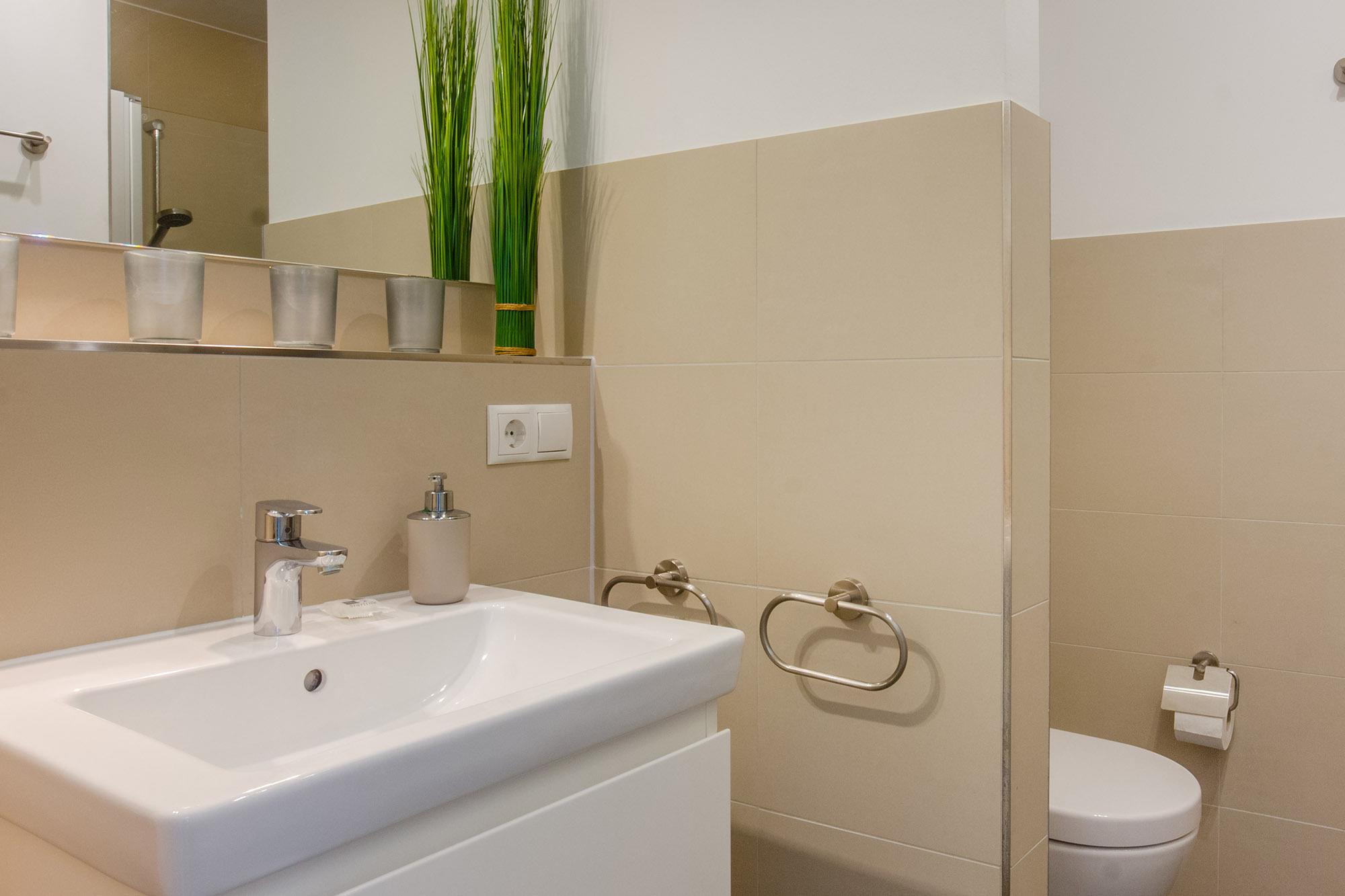 Das moderne Badezimmer ist mit einer ebenerdigen Dusche, einem Waschbecken und einem WC ausgestattet und bietet Ihnen nach einem erlebnisreichen Tag an der Ostsee die perfekte Erfrischung. Im Flur unter der Treppe befindet sich eine praktische Kommode für Ihre alltäglichen Dinge.