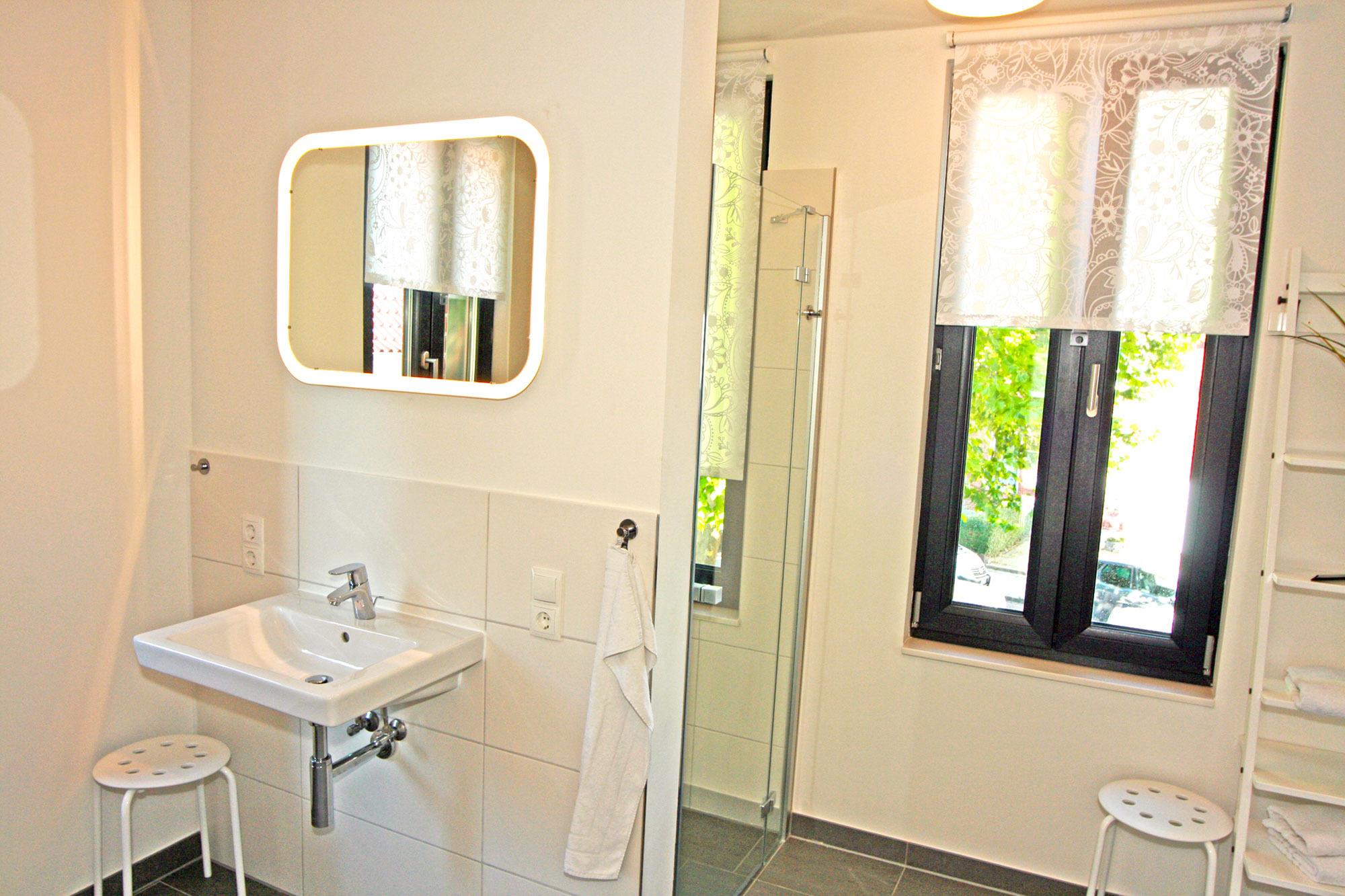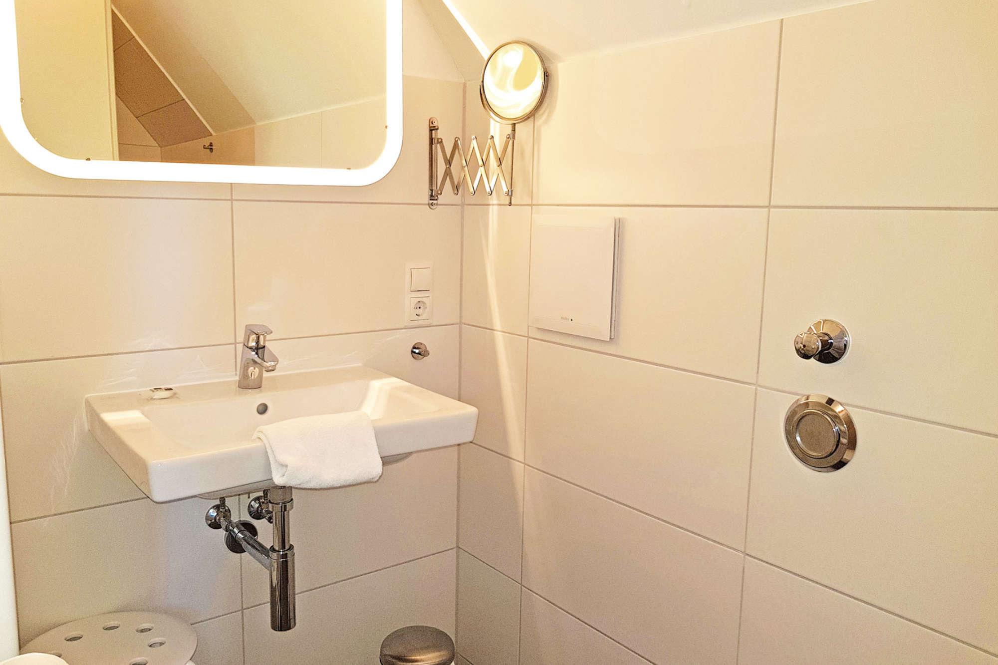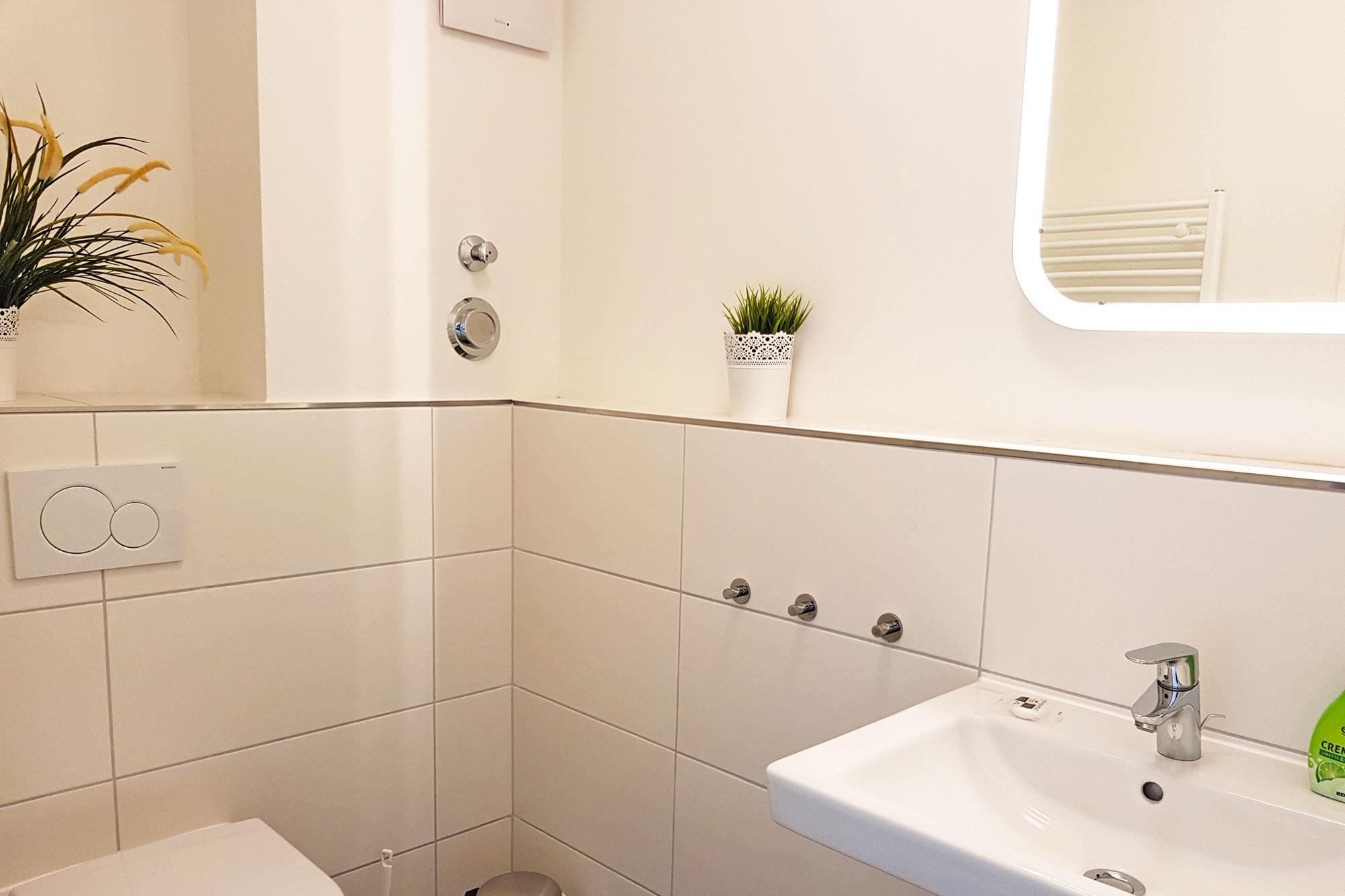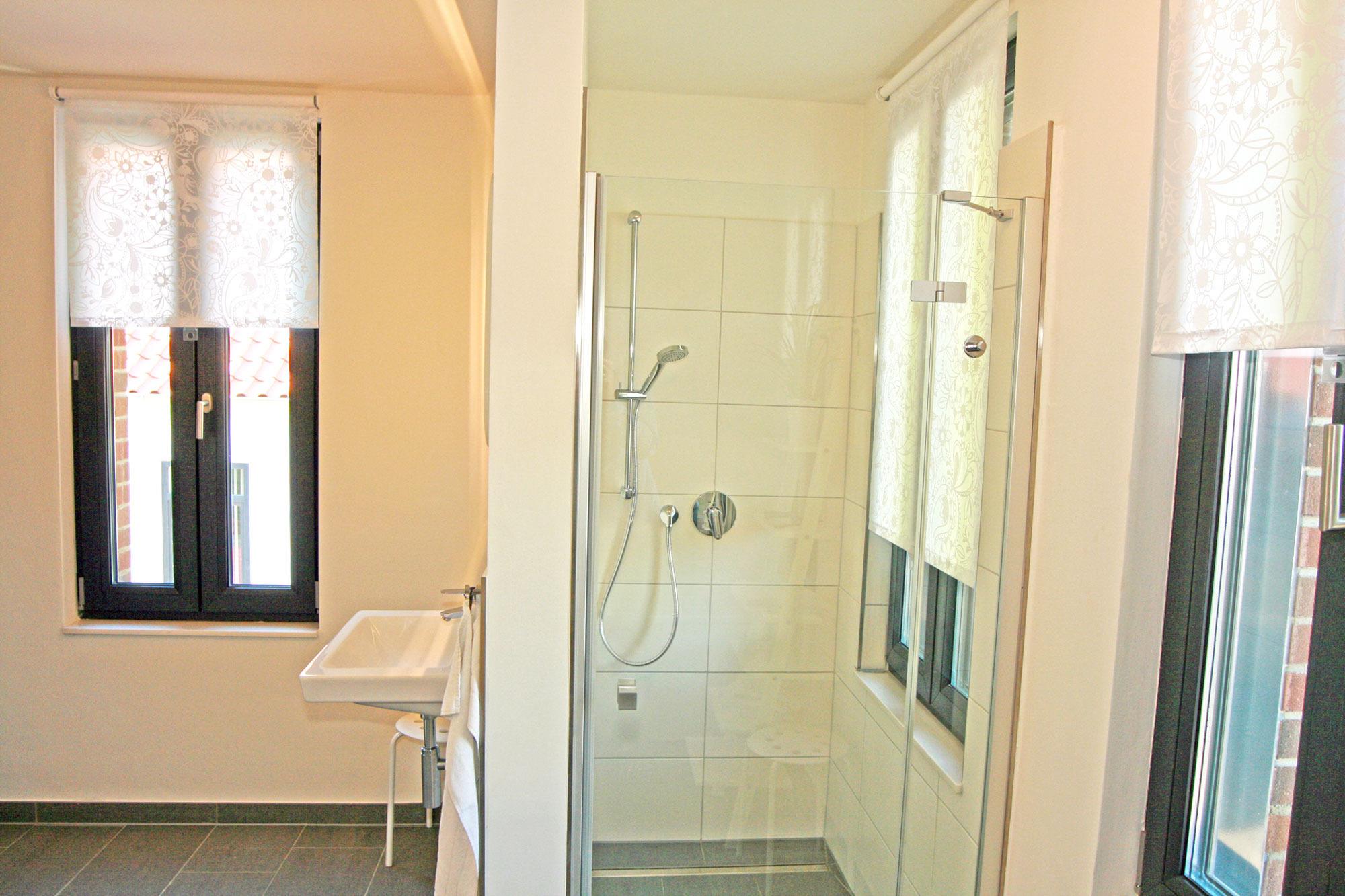 Die zwei Badezimmer in den oberen Etagen sind modern ausgestattet. Nach einem erlebnisreichen Tag können Sie im großzügigen Hauptbad mit Sauna (gegen Gebühr), Badewanne oder ebenerdiger Dusche entspannen. Das zweite Badezimmer im Dachgeschoss verfügt über eine Dusche und bietet somit zusätzlichen Raum für die tägliche Pflege. Handtuchwärmer und WC sind in beiden Bädern vorhanden. Im Erdgeschoss sorgt ein zusätzliches Gäste-WC für weiteren Komfort. Das gesamte Haus wird beim Warmwasser über Durchlauferhitzer versorgt.
