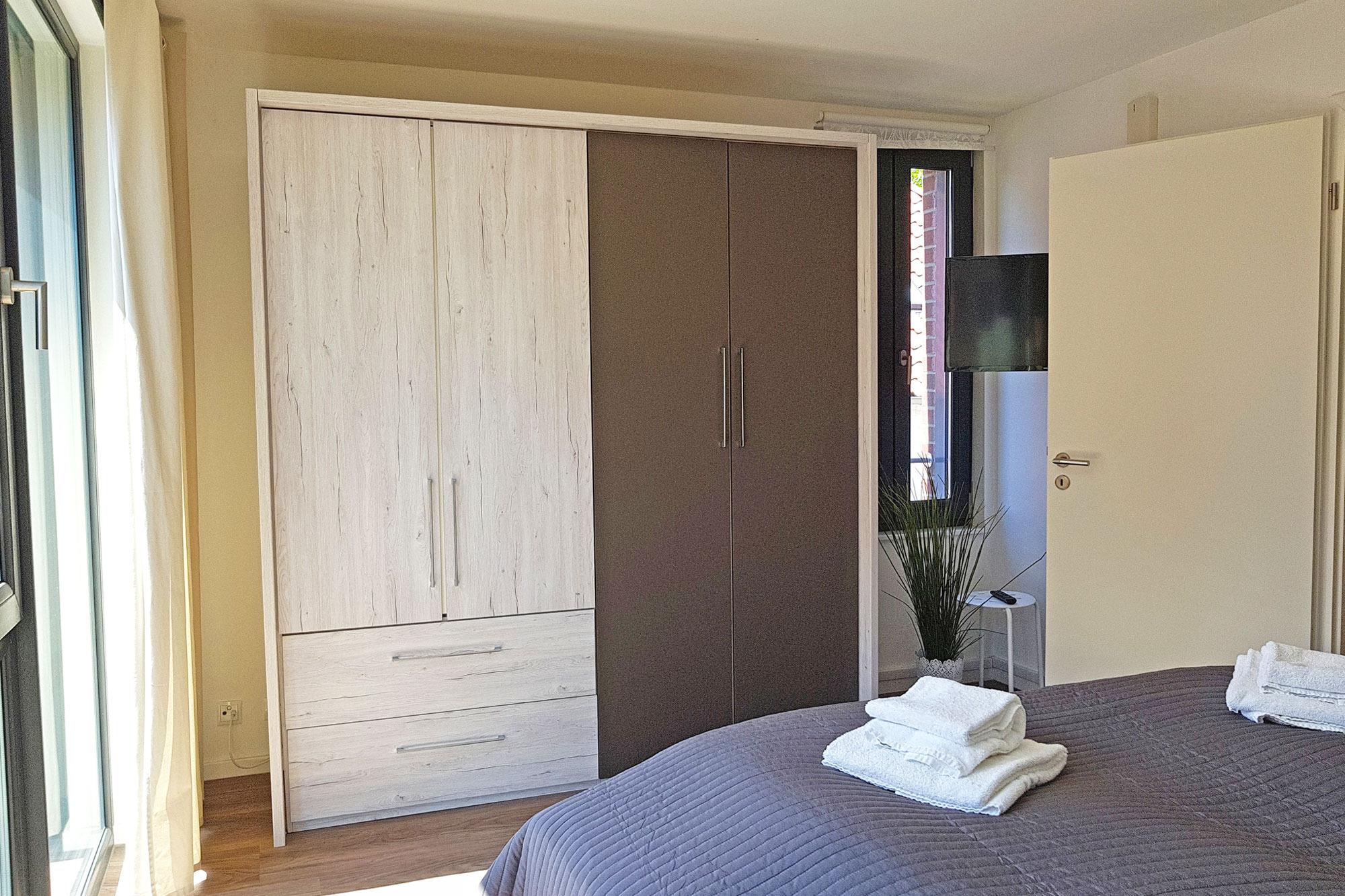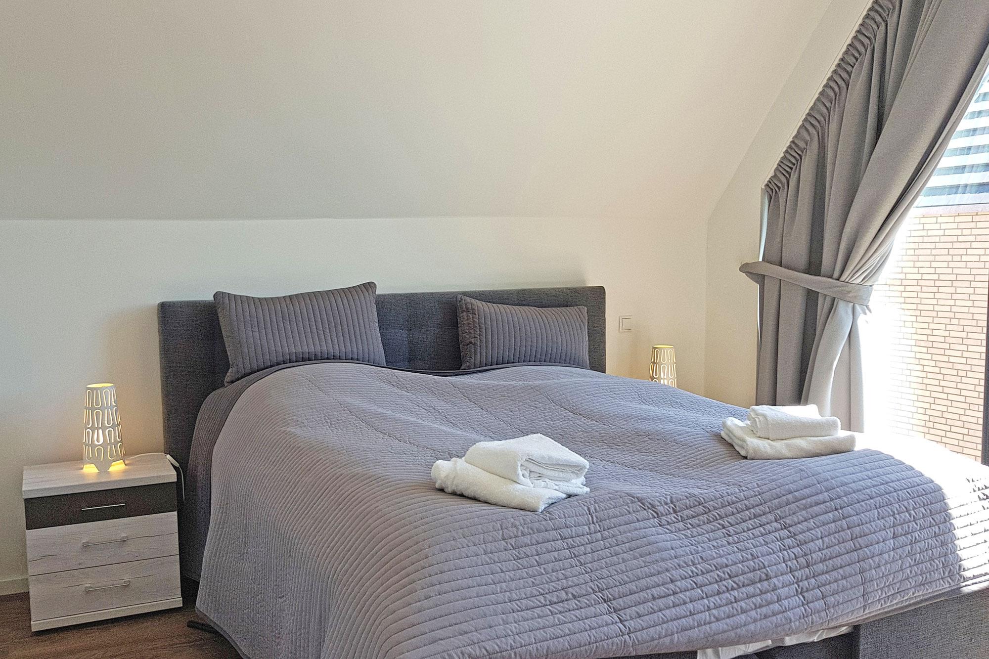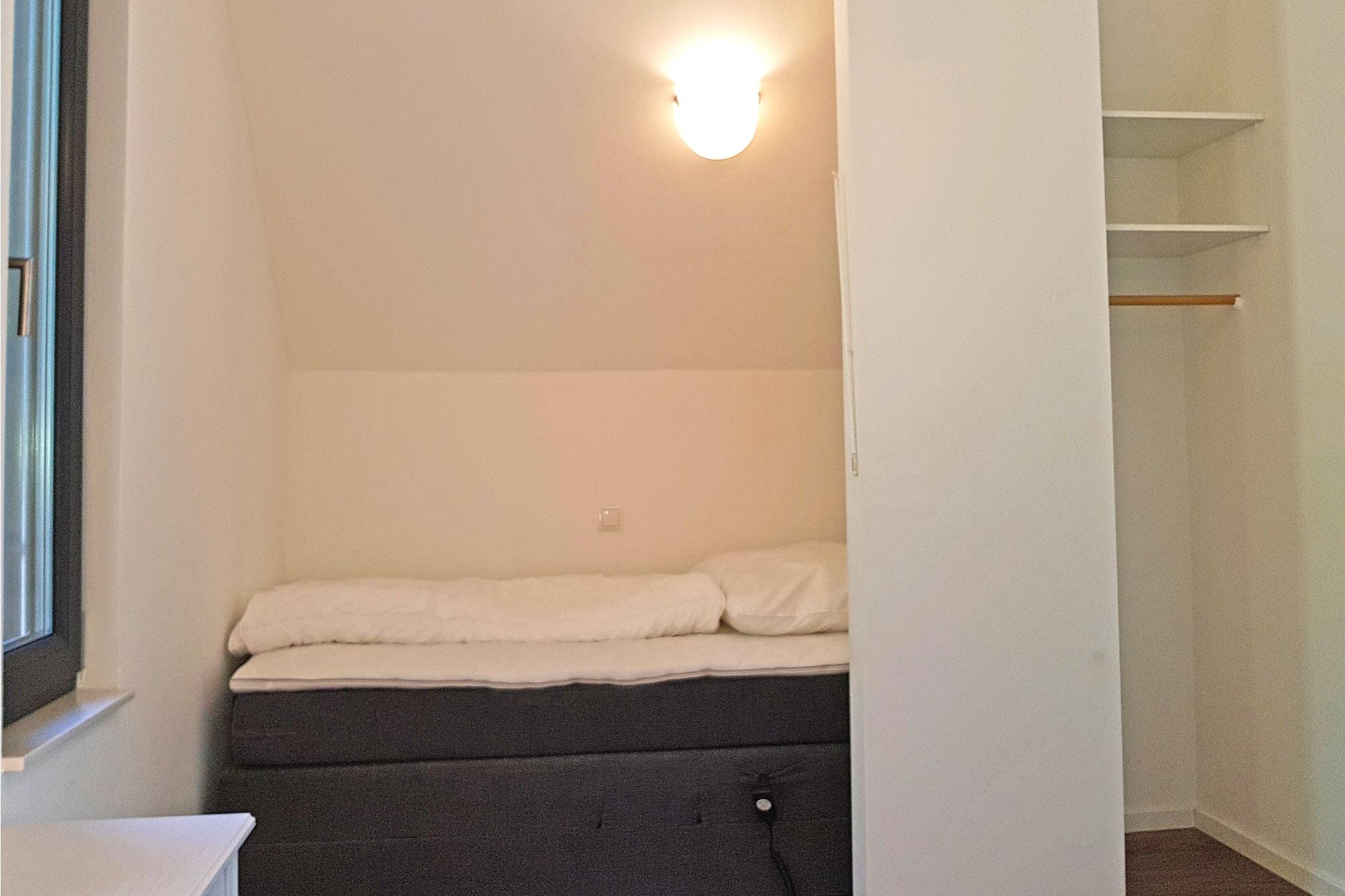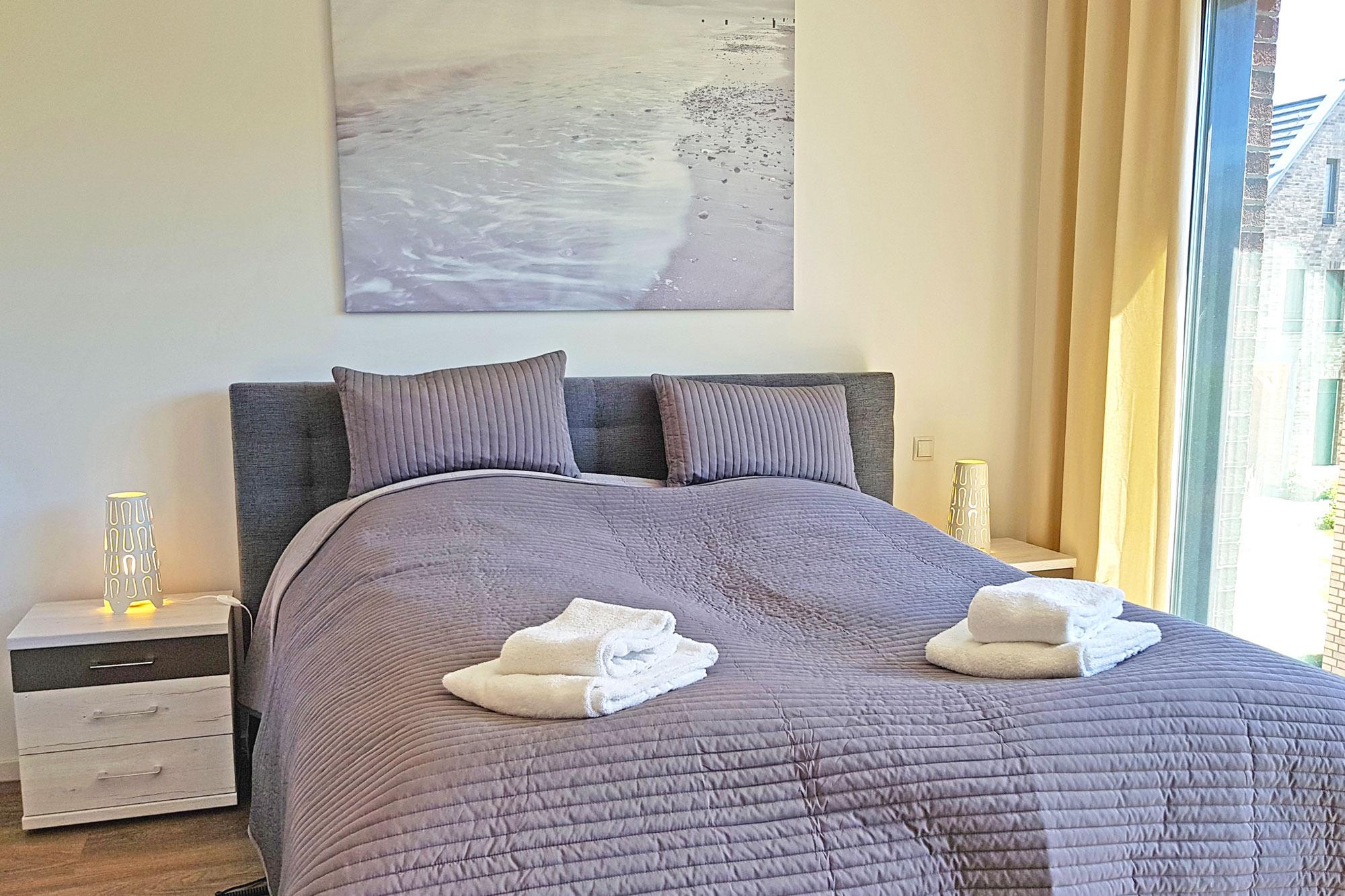 Die Schlafräume sind so gestaltet, dass sie Komfort bieten. Im ersten Obergeschoss erwartet Sie ein gemütliches Schlafzimmer mit einem Doppel-Boxspringbett. Das Dachgeschoss verfügt über ein weiteres Schlafzimmer mit Doppel-Boxspringbett sowie ein zusätzliches Zimmer mit zwei einzelnen Boxspringbetten. Besonders praktisch: Alle Betten sind elektrisch verstellbar und ermöglichen somit eine individuelle Liegeposition für erholsamen Schlaf. Für Kleinkinder stehen Babyreisebetten (gegen Gebühr) sowie ein Hochstuhl bereit. Bodentiefe Fensterfronten sorgen für eine freundliche und helle Atmosphäre, während Verdunklungsvorhänge und Rollos für erholsame Nächte und Privatsphäre sorgen.
