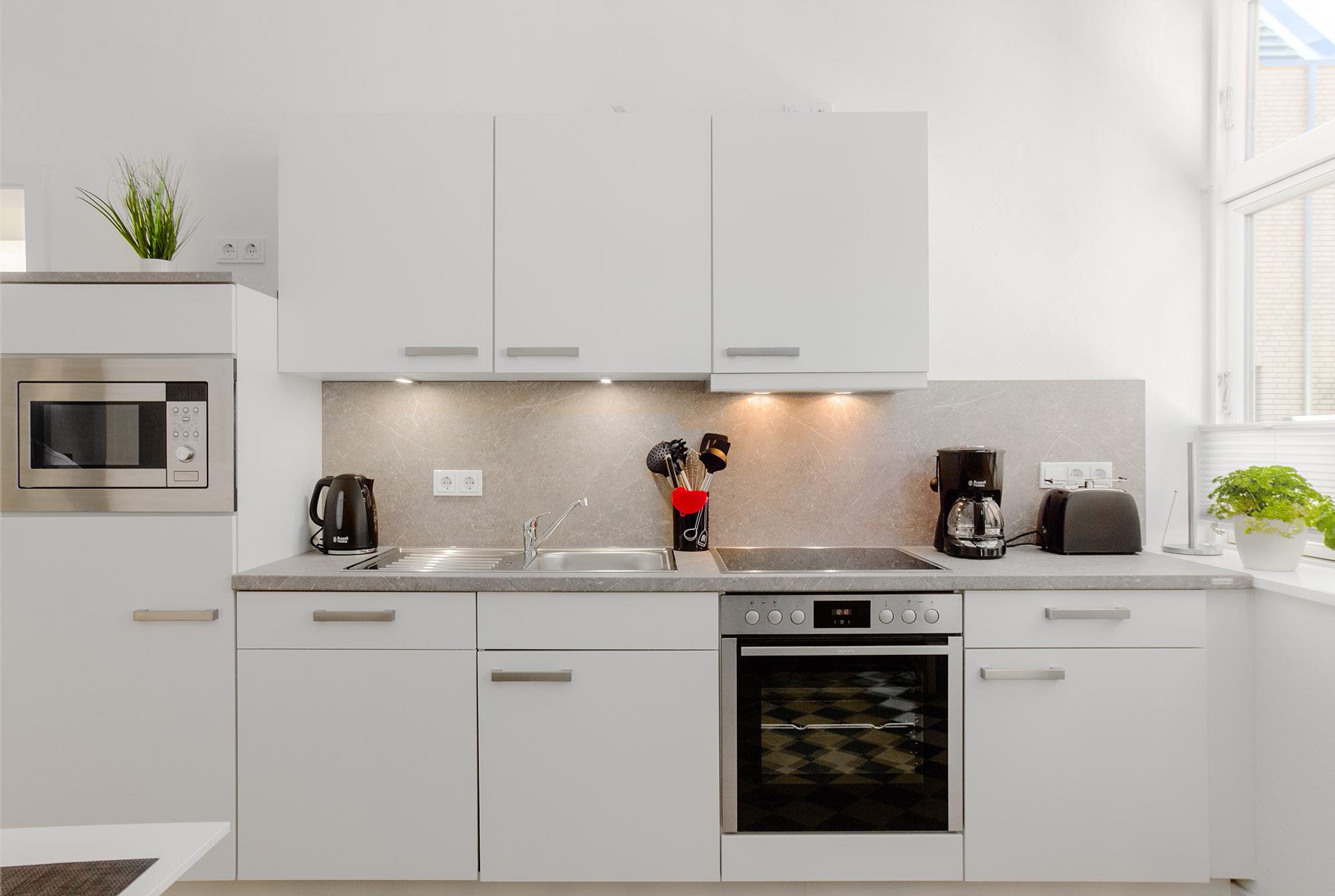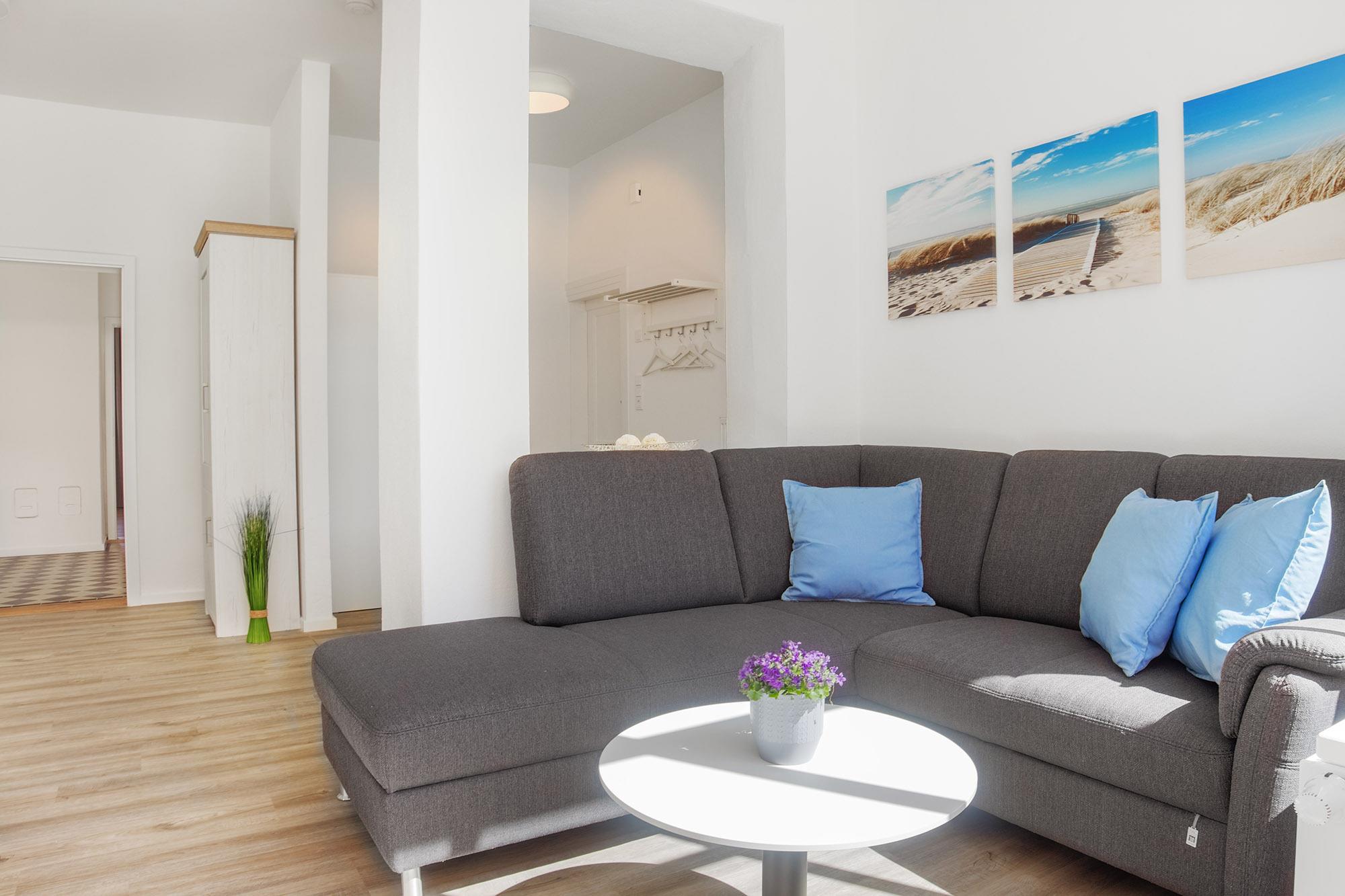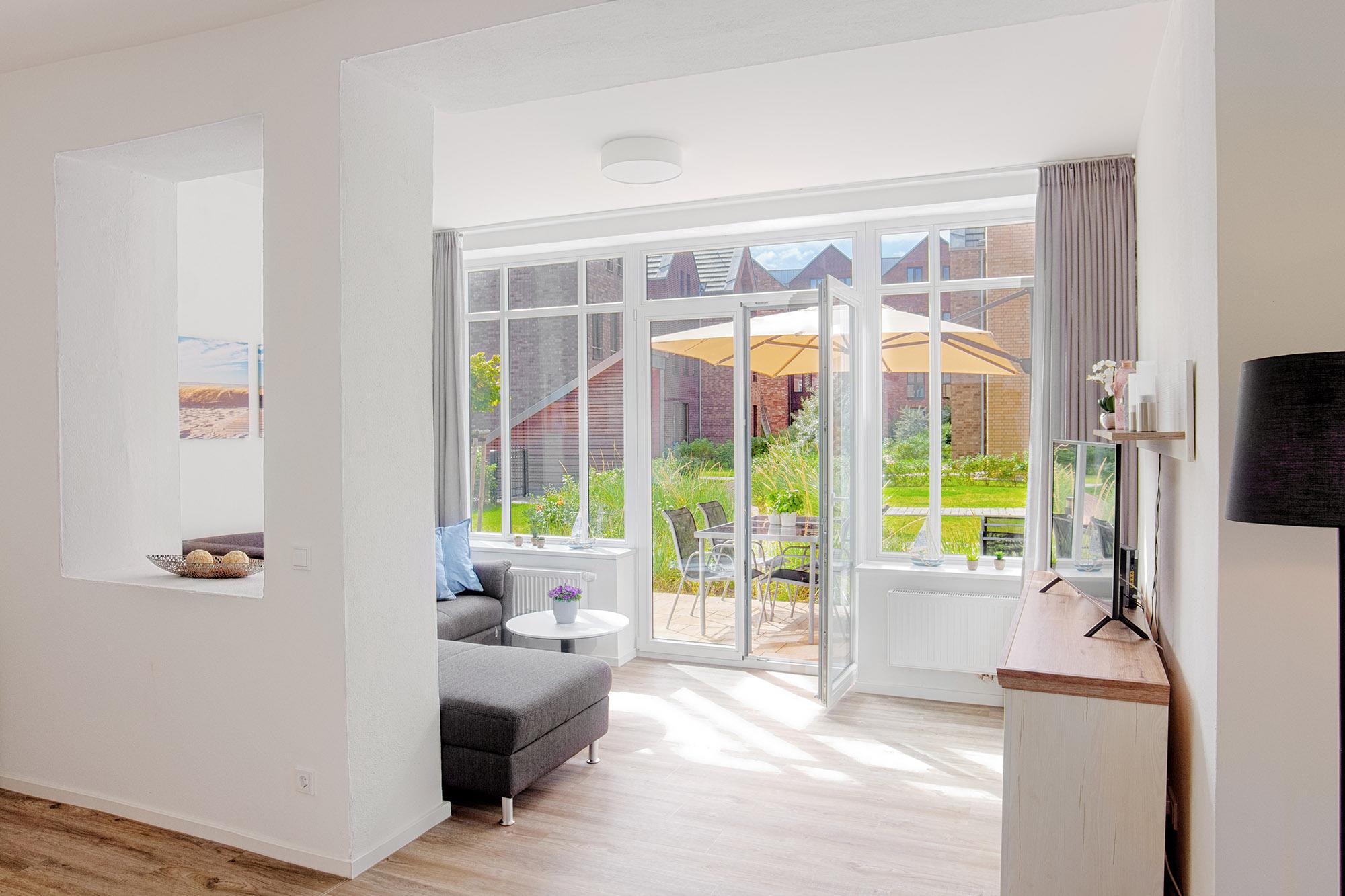 Der geschmackvolle Wohnbereich ist offen gestaltet und mit einer gemütlichen Couch, Smart-TV und WLAN ausgestattet – perfekt für entspannte Stunden mit Streaming-Möglichkeiten. Große Fenster bringen viel Tageslicht in die Wohnung und ermöglichen einen direkten Blick ins Fischerdorf Heiligenhafen.