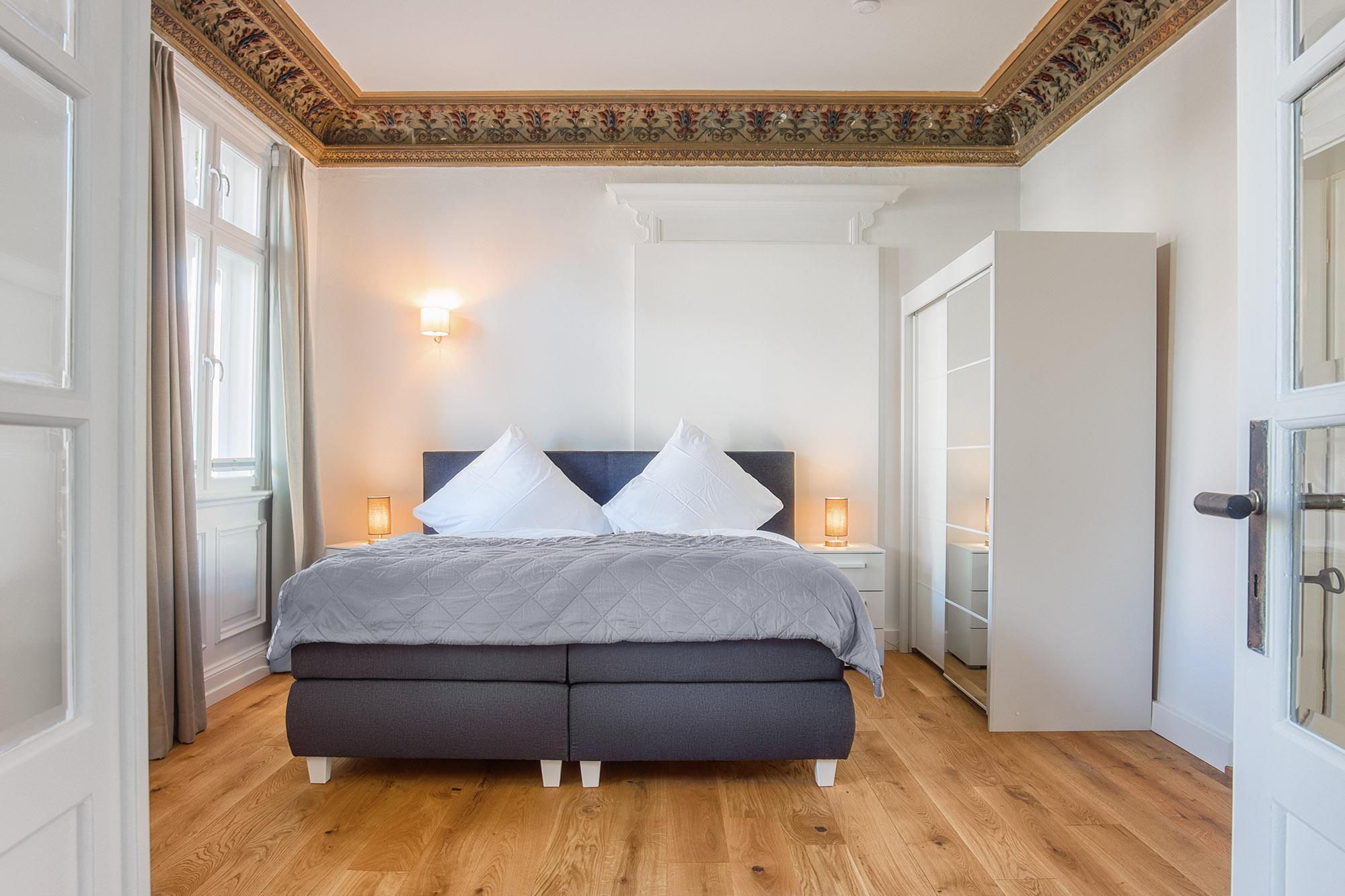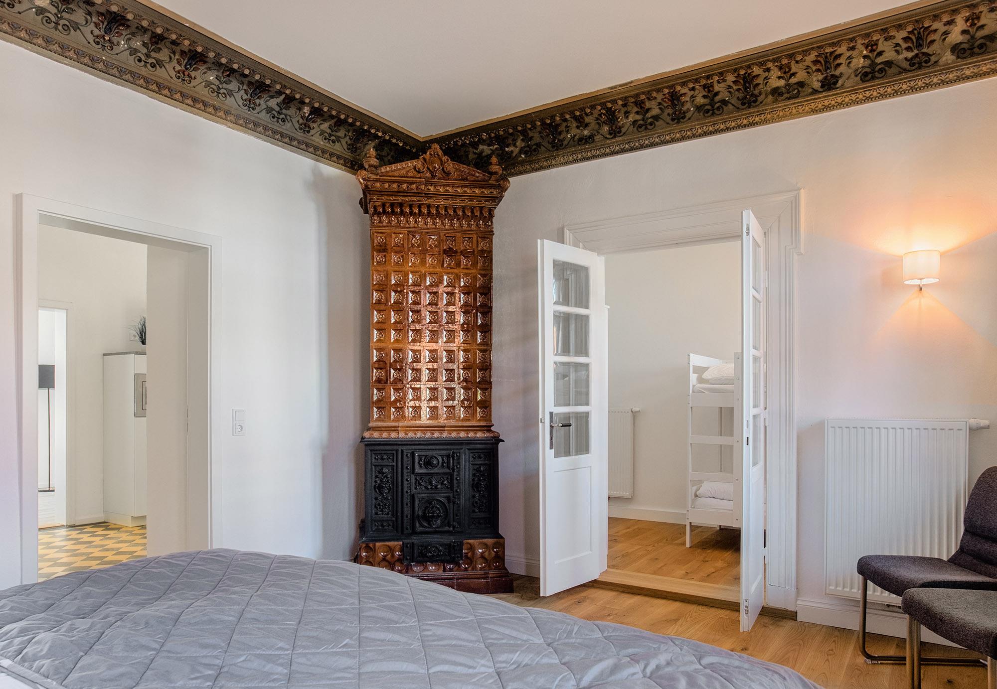 Die Ferienwohnung ist besonders für Familien geeignet, da sie über zwei Schlafzimmer verfügt. Das erste Schlafzimmer ist mit einem Doppelboxspringbett (180x200) ausgestattet und beeindruckt mit historischem Stuckdekor und einem Kamin (nicht nutzbar). Dieses Zimmer dient als Durchgangszimmer zum zweiten Schlafzimmer, das über ein Etagenbett (je 90x200) verfügt. Blickdichte Plissees und Vorhänge sorgen für eine angenehme Verdunkelung und eine erholsame Nachtruhe. Allergiker-geeignete Bettwäsche, Handtuchsets, ein Babyreisebett (ohne Bettzeug) und ein Hochstuhl können gegen Gebühr hinzugebucht werden.