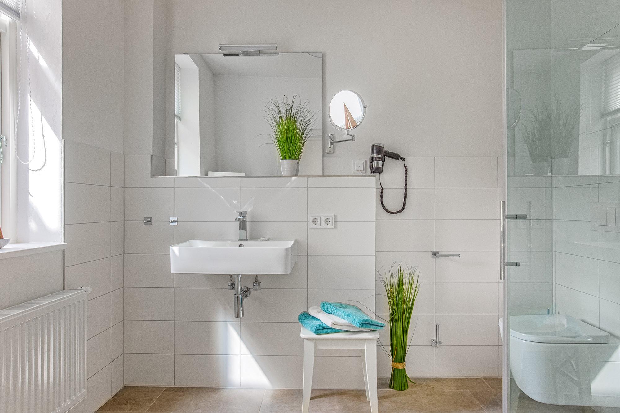 Das moderne Badezimmer ist mit einer ebenerdigen Dusche, Handtuchwärmer, Waschbecken und WC ausgestattet. Ein separater Waschraum mit Waschmaschine, Bügeleisen und Bügelbrett steht Gästen des Gutshauses im Erdgeschoss zur Verfügung.